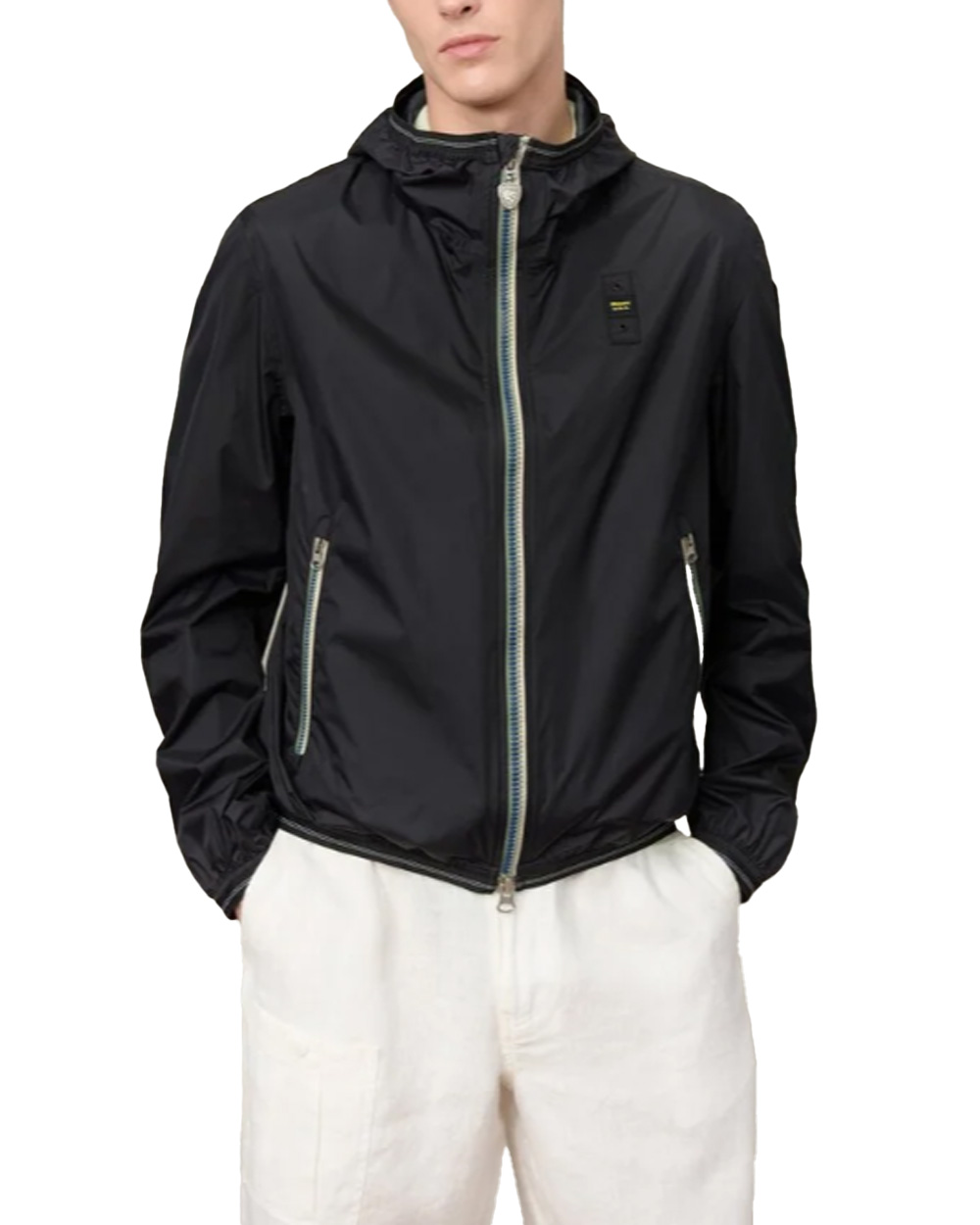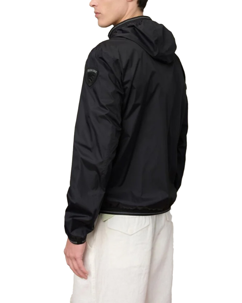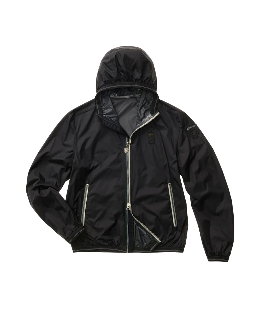 Giacca a vento in nylon confort touch sfoderata con cappuccio fisso.