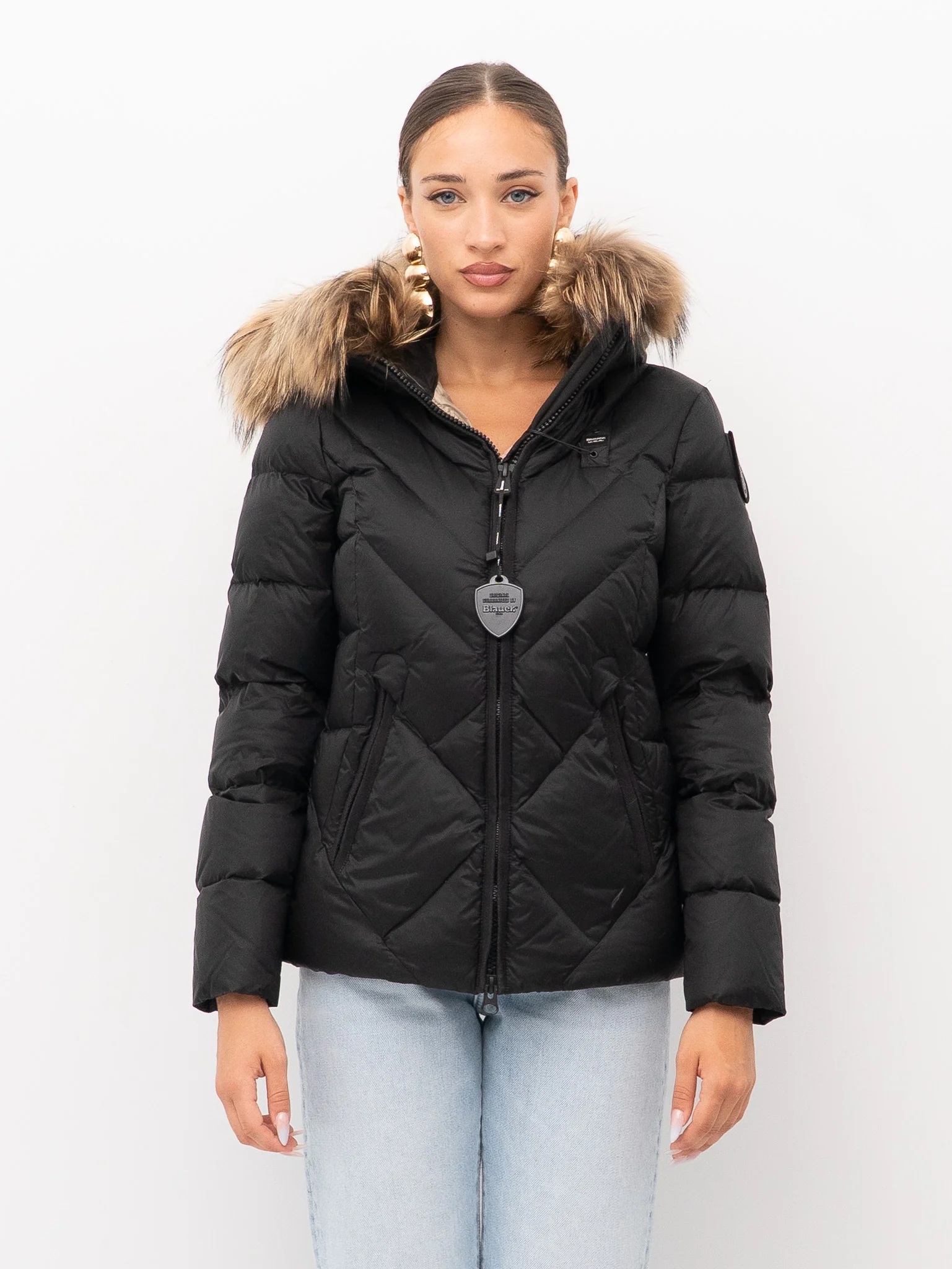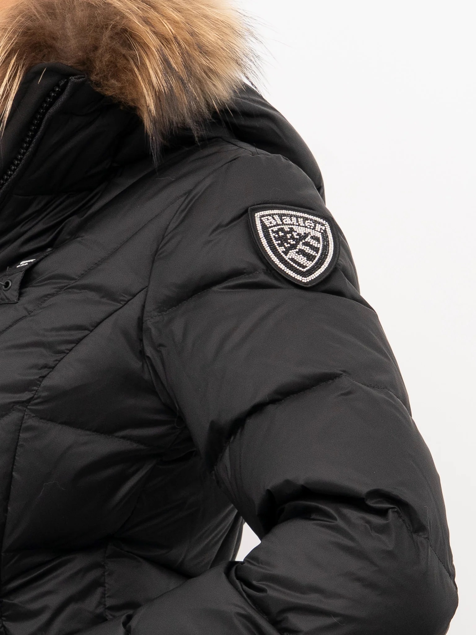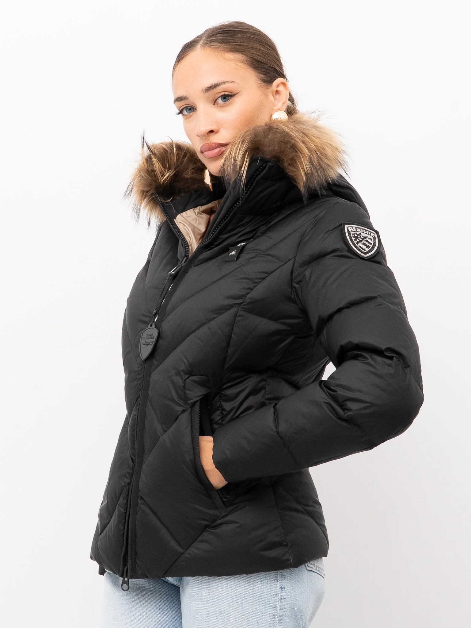 Piumino Alicia in nylon lucido nero con interno beige. Trapuntatura geometrica a rombi che valorizza la silhouette grazie al taglio leggermente sfiancato. Imbottito con piuma naturale 90/10 (255 g), offre calore elevato senza rinunciare a leggerezza e stile. Cappuccio fisso con bordo in vera pelliccia removibile, chiusura frontale con zip nascosta a doppio cursore e fodera interna in nylon a contrasto. Dotato di tasche laterali con zip, tasche interne con velcro e zip, coulisse regolabile sul fondo e dettagli Blauer come patch glitter e logo loop. Un capo caldo, elegante e funzionale, perfetto per affrontare linverno con classe.