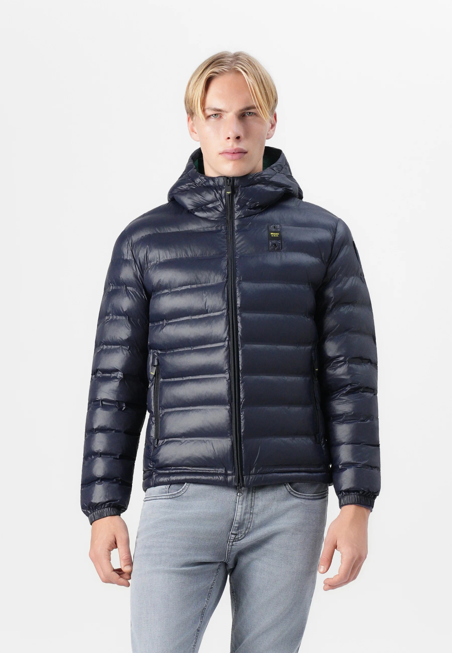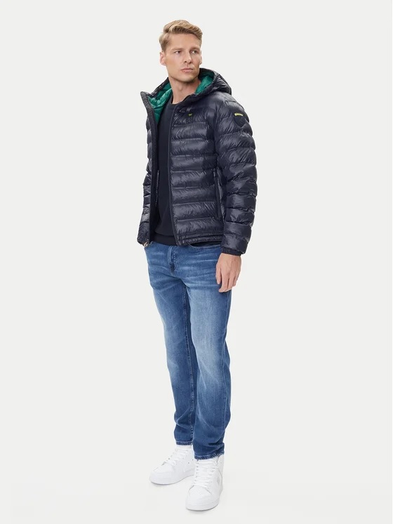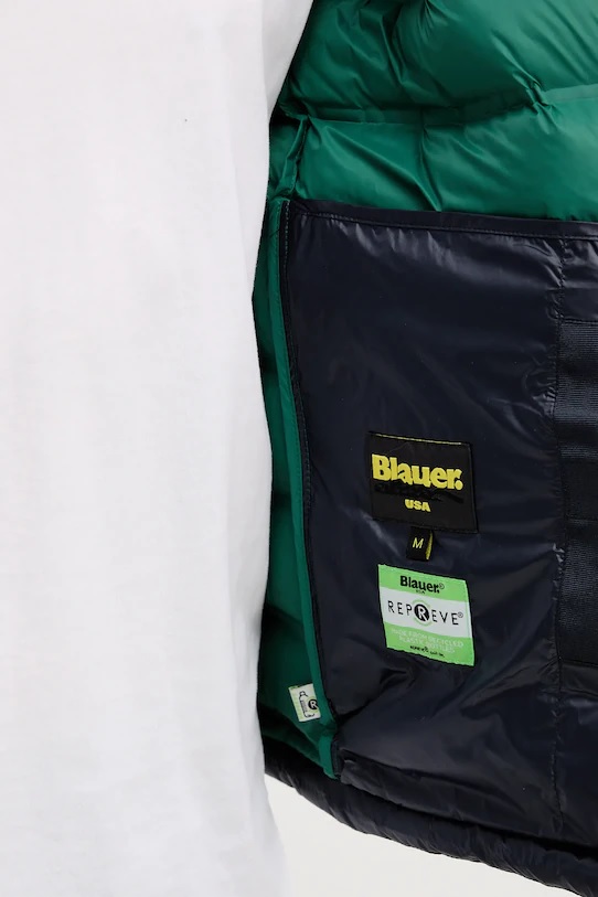 Piumino "Charles" in nylon blu con interno verde a contrasto. Realizzato con cuciture termosaldate a righe orizzontali, è imbottito con ovatta ecologica Repreve®, ottenuta dal riciclo di bottiglie di plastica. Un capo leggero ma caldo, perfetto per affrontare le temperature fredde con stile sostenibile. Presenta cappuccio fisso con coulisse, polsini con elastico e chiusura frontale con zip. Tasche laterali con zip e pratiche tasche interne, aperte e con velcro, per riporre gli oggetti in sicurezza. Patch e passante logo Blauer completano il design. Vestibilità regular fit e lunghezza classica.