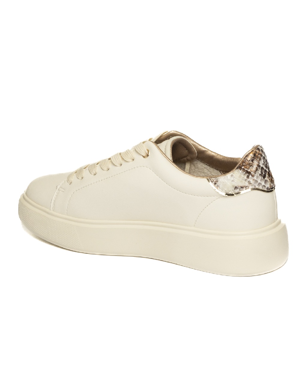 Tomaia pelle liscia e finiture in pelle metallizzata e inserti scamosciati tono su tono, pensata per comfort quotidiano e stile urbano pulito. Base color crema arricchita da dettagli color platino.