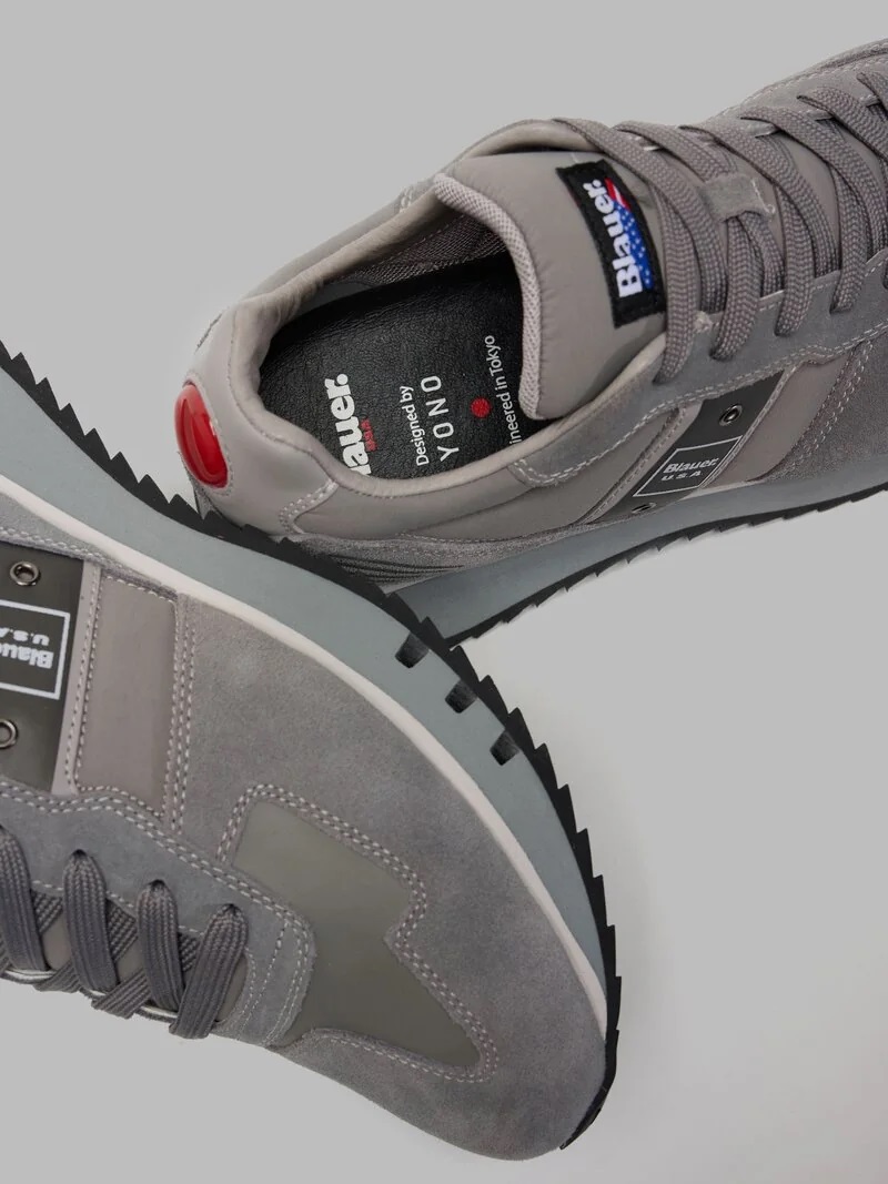 Sneakers "Tokyo01-TAS" grigie ispirate al design nipponico, con rivisitazione minimal delliconico modello Queens. Realizzate in pelle scamosciata e tessuto taslan, con dettagli tono su tono e simbolo del sol levante rosso sul tallone. Interno in pelle per un comfort totale e suola artigianale con battistrada in gomma che garantisce aderenza e resistenza. Un modello dal volume contemporaneo e dallo stile unico.