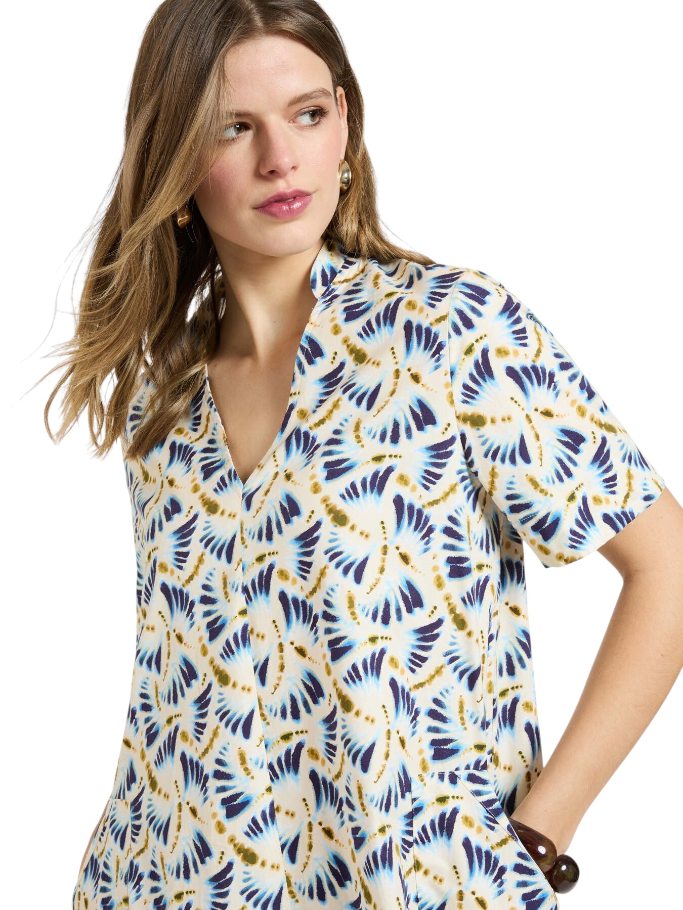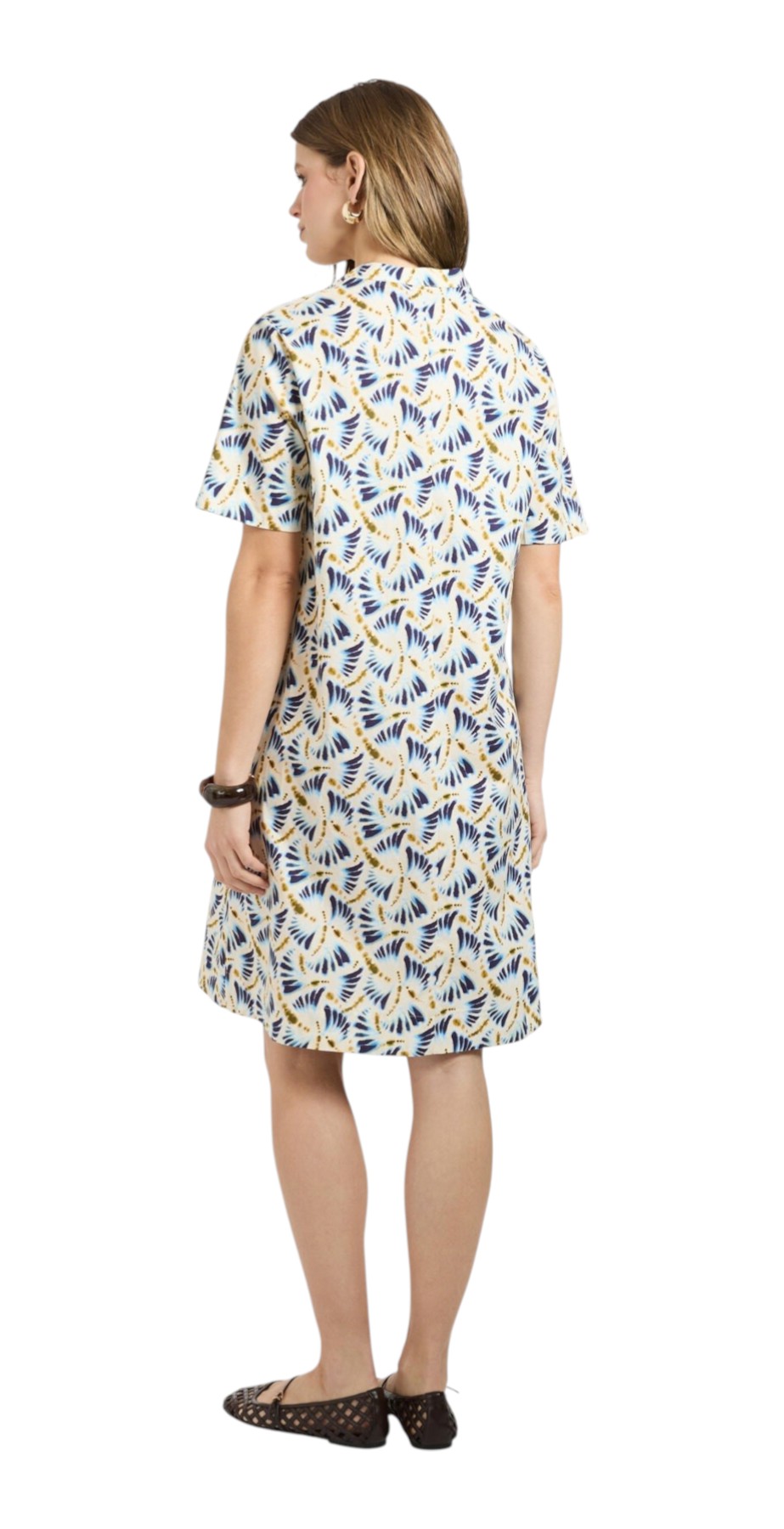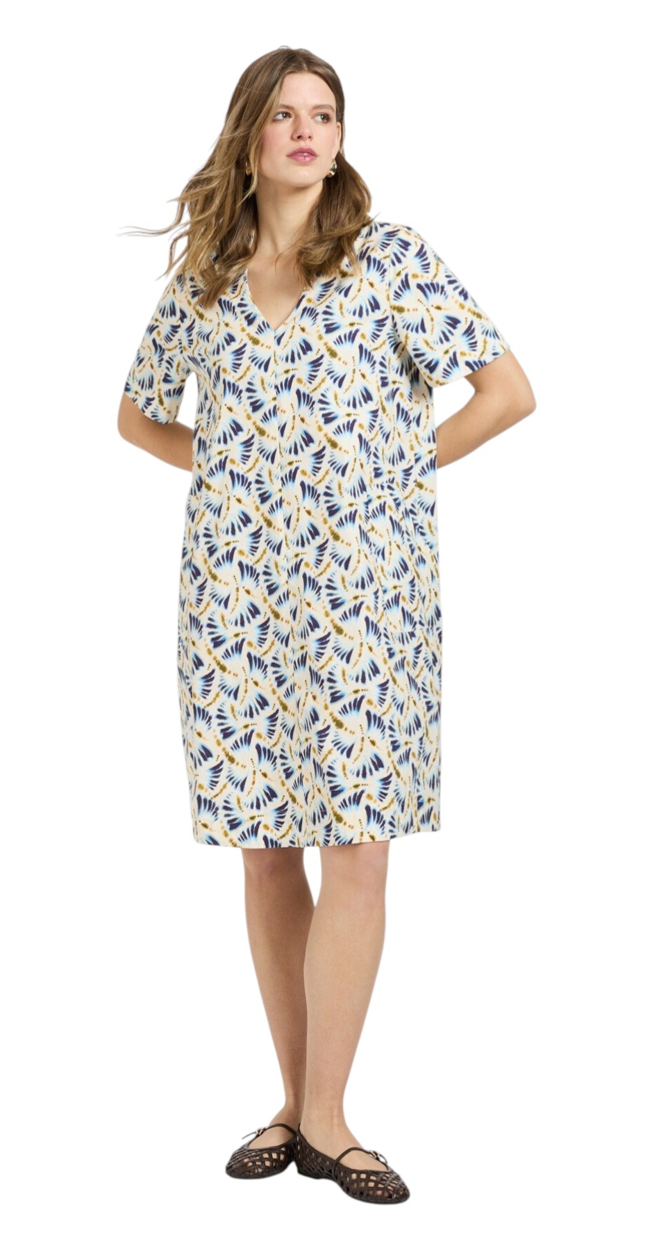 Abito in popeline di cotone stretch con stampa all-over con fantasia a ventagli. Maniche corte a tre quarti e scollo a V. Lunghezza al ginocchio, tasche diagonali. Vestibilità comoda. La modella è alta 178 cm e indossa la taglia 44 IT.