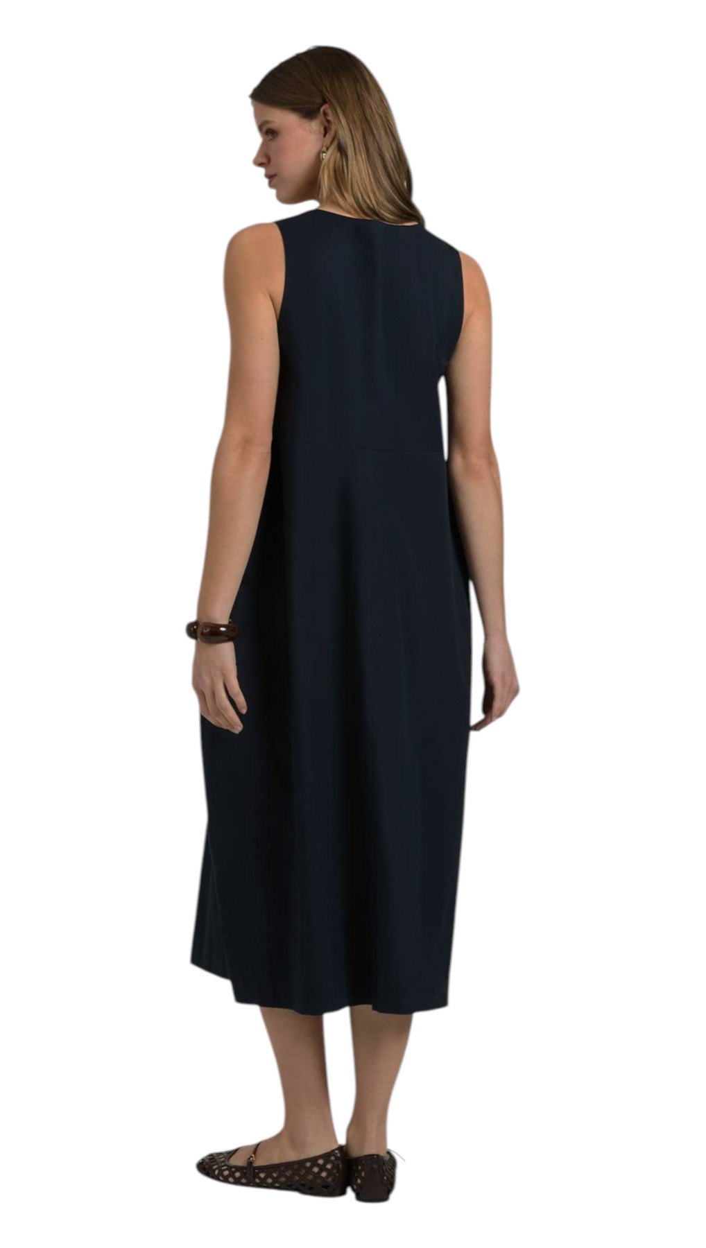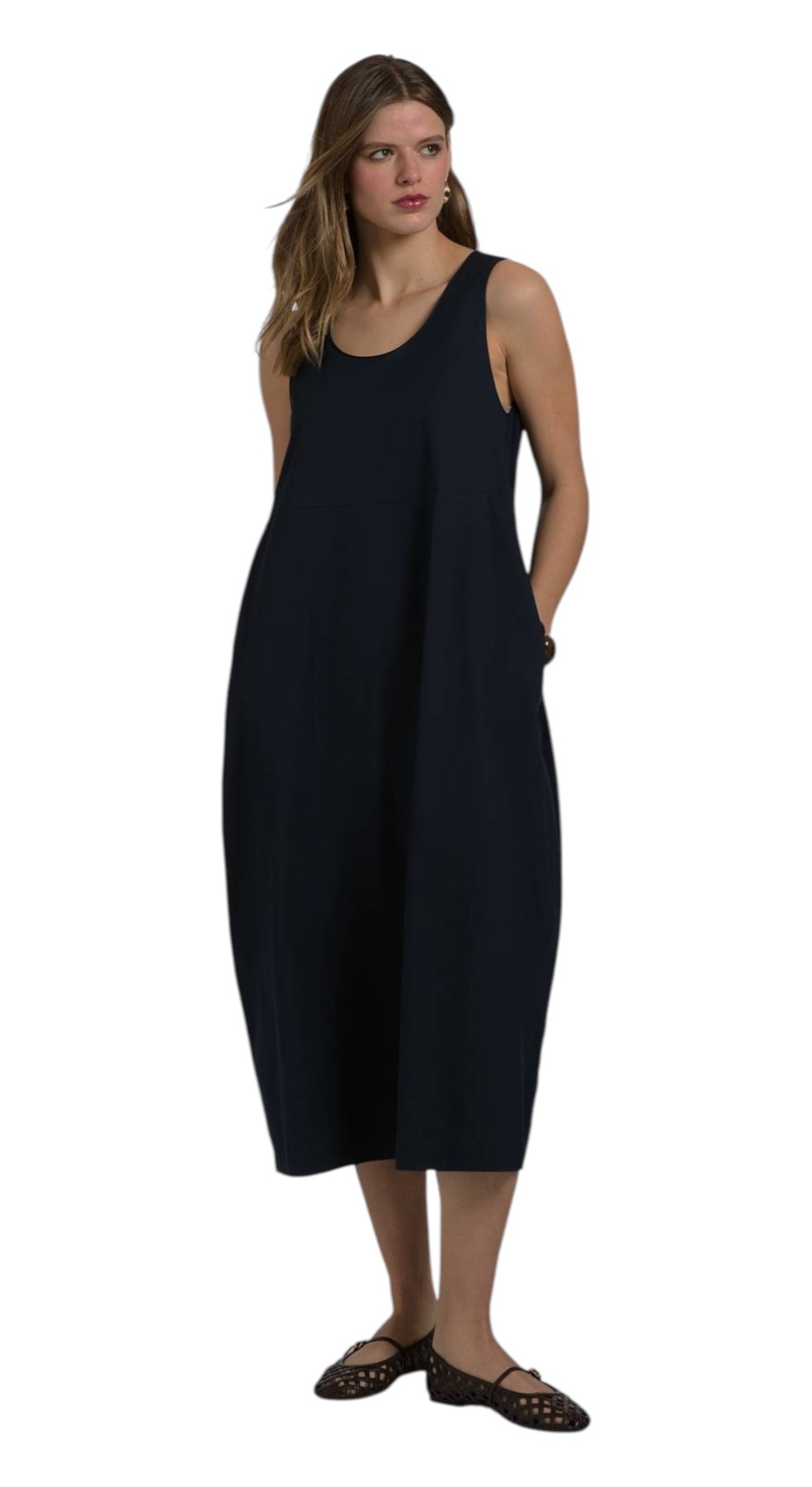 Abito lungo a uovo senza maniche con scollo a girocollo in popeline di misto cotone. Vestibilità comoda.