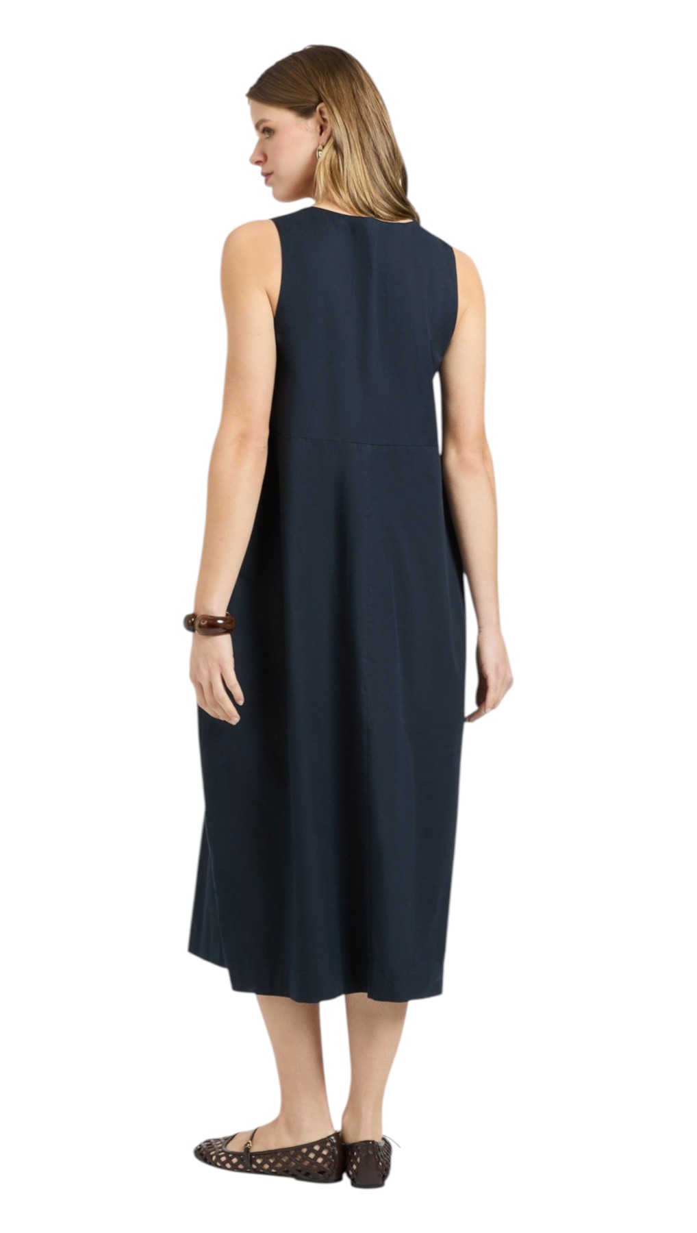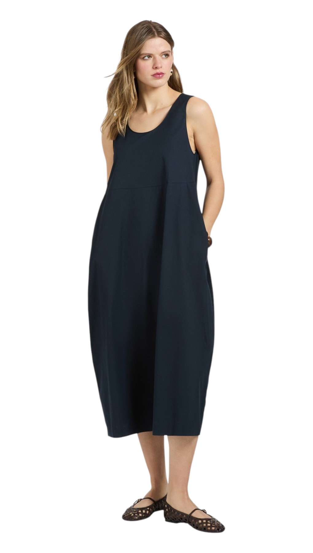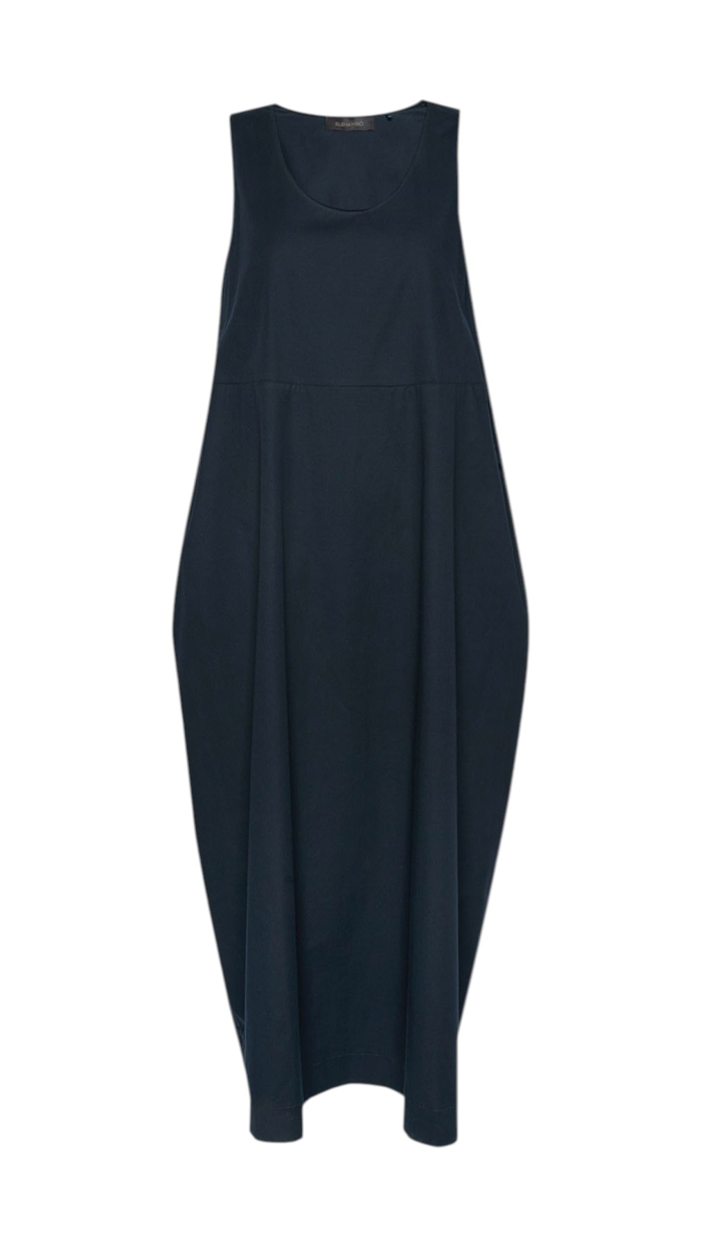 Abito lungo con scollo girocollo senza maniche in popeline. Linea barrel o a uovo con vestibilità ampia e comoda.