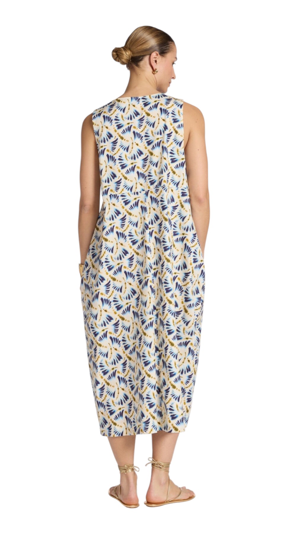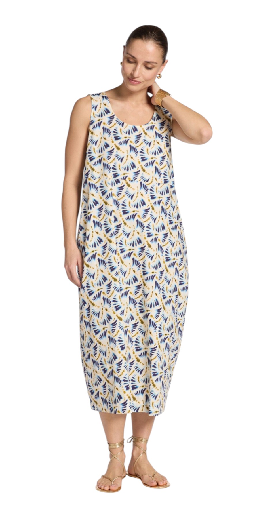 Abito lungo in popeline di cotone stretch con stampa all-over e scollo arrotondato senza maniche. Lunghezza sopra alle caviglie. La modella è alta 178 cm e indossa la taglia S.