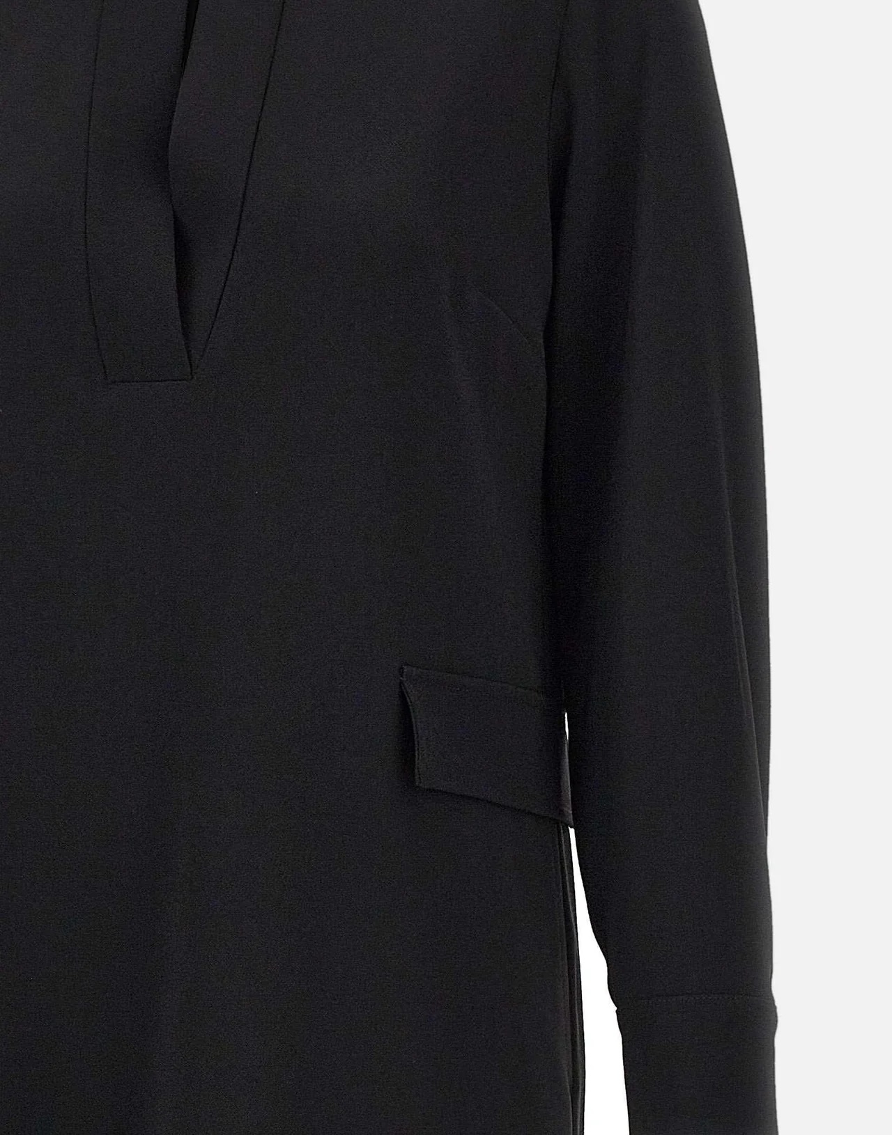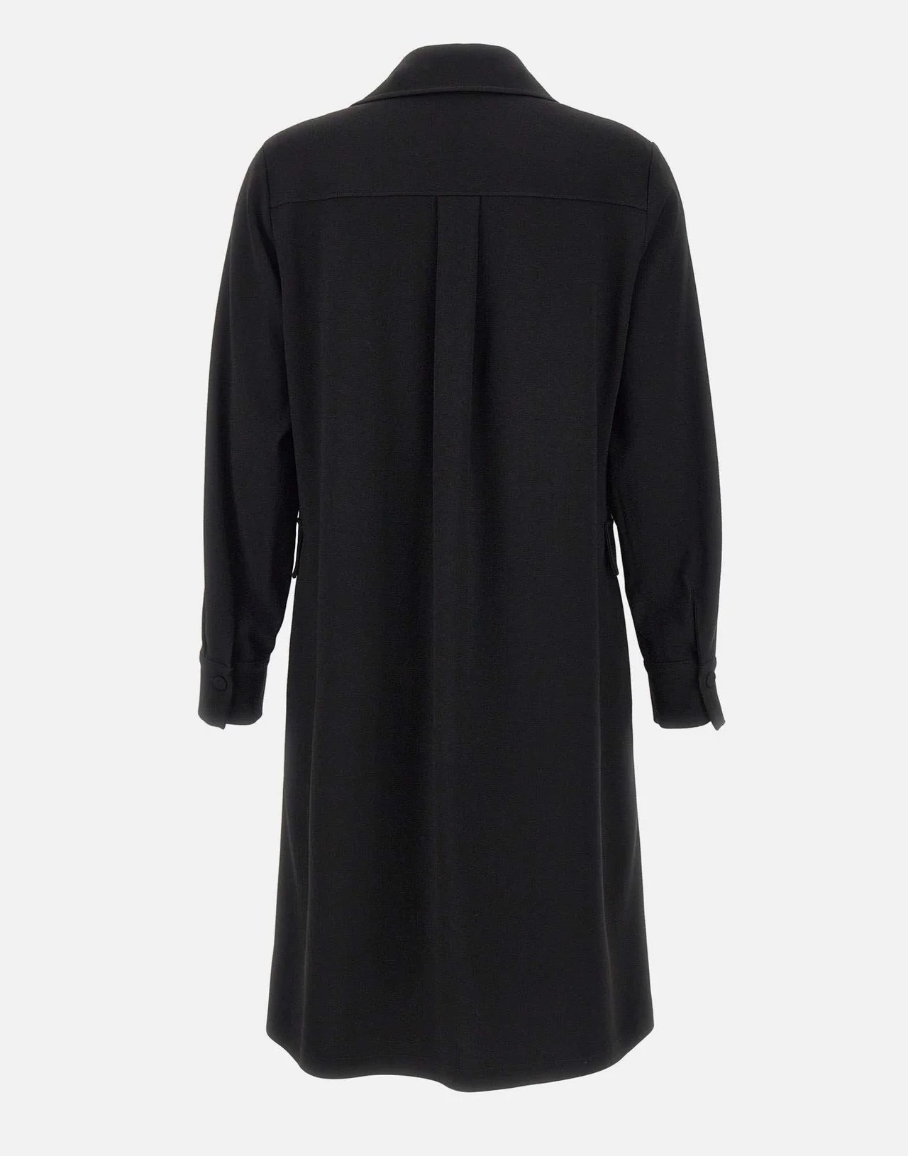 Abito nero a matita in Cady Crêpe stretch sostenibile, con scollo ispirato alla polo e linea elegante. Modello versatile con tasche inserite nei fianchi, pattine frontali e bottoni foderati. Un must-have moderno, ideale per ogni occasione.