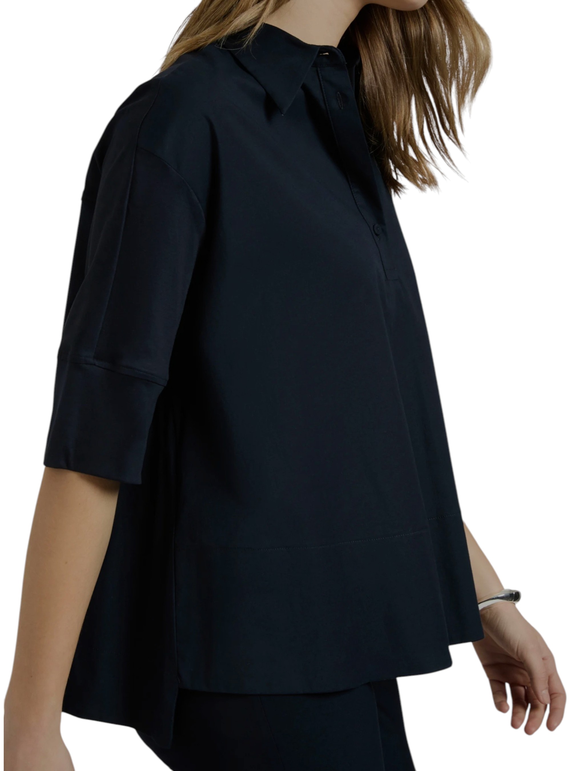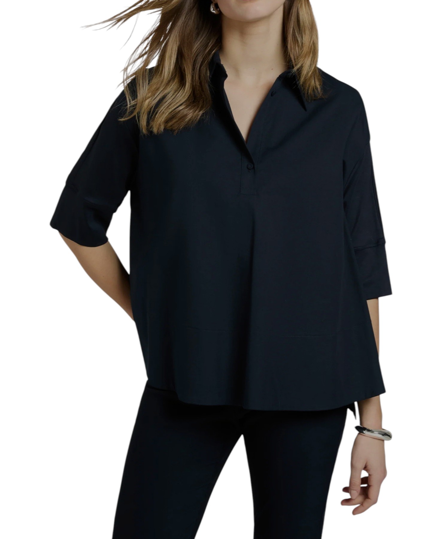 Blusa bimaterica con manica a 3/4 rifinite con maxi polsini. Presenta un'apertura frontale parziale con bottoni, che crea uno scollo a "V" modulabile. Linea a trapezio svasata. Vestibilità Regular Plus, progettata per non segnare i punti critici.