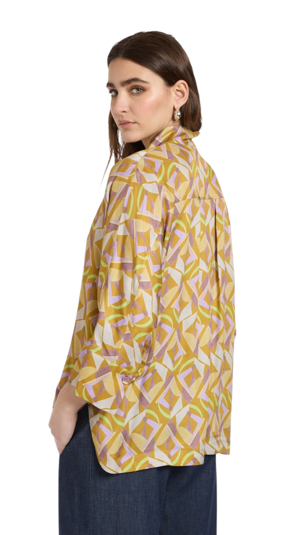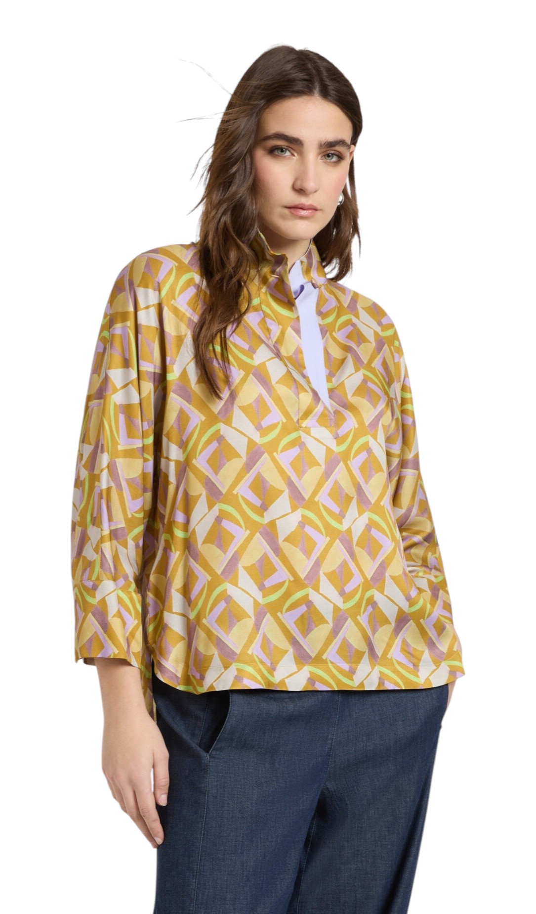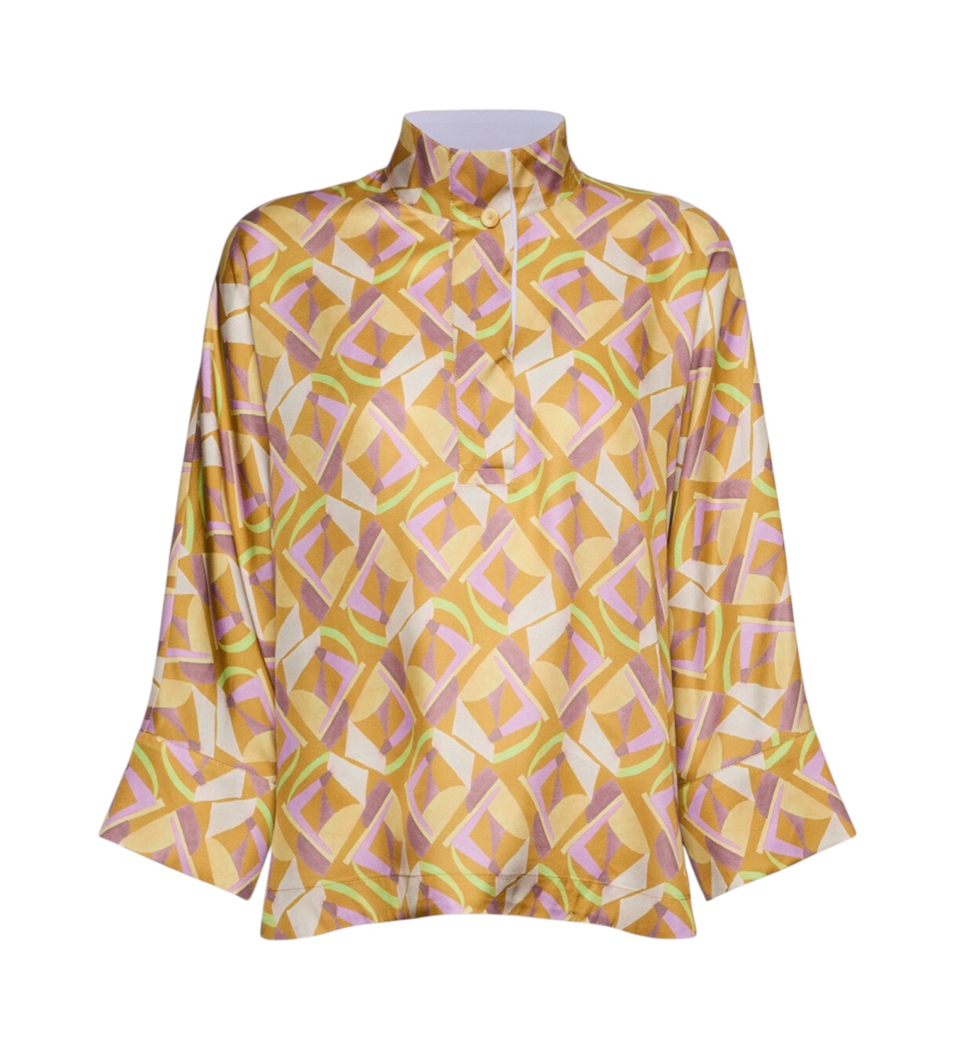 Blusa in twill di viscosa dalla stampa geometrica con scollo coreana e maniche lunghe. La chiusura è frontale con bottoni. Vestibilità leggermente over.