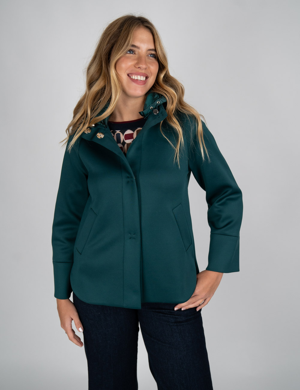 Caban verde in tessuto scuba ultrastretch dalla mano pesca, caratterizzato da una linea contemporanea e dettagli sartoriali. Il modello presenta cappuccio trapuntato in morbido nylon staccabile con coulisse e ganci light gold, tasche a filetto, taglio raglan e fondo arrotondato. Chiusura con automatici light gold cuciti a mano. Interamente foderato, un capo moderno e versatile dal carattere easy chic.