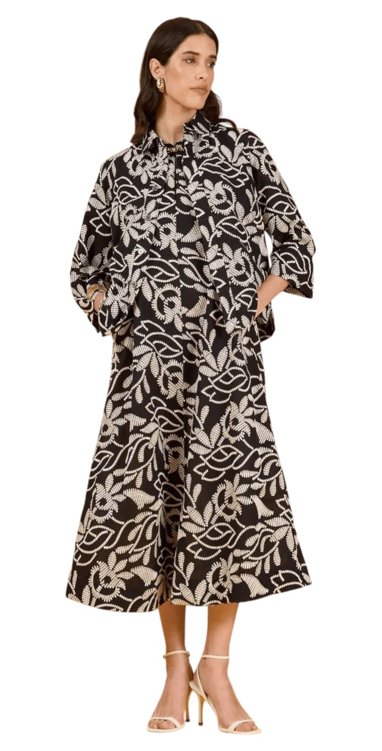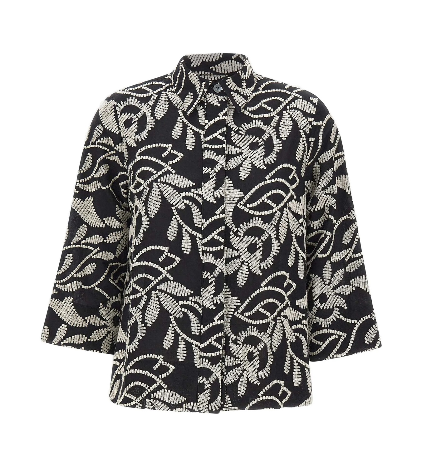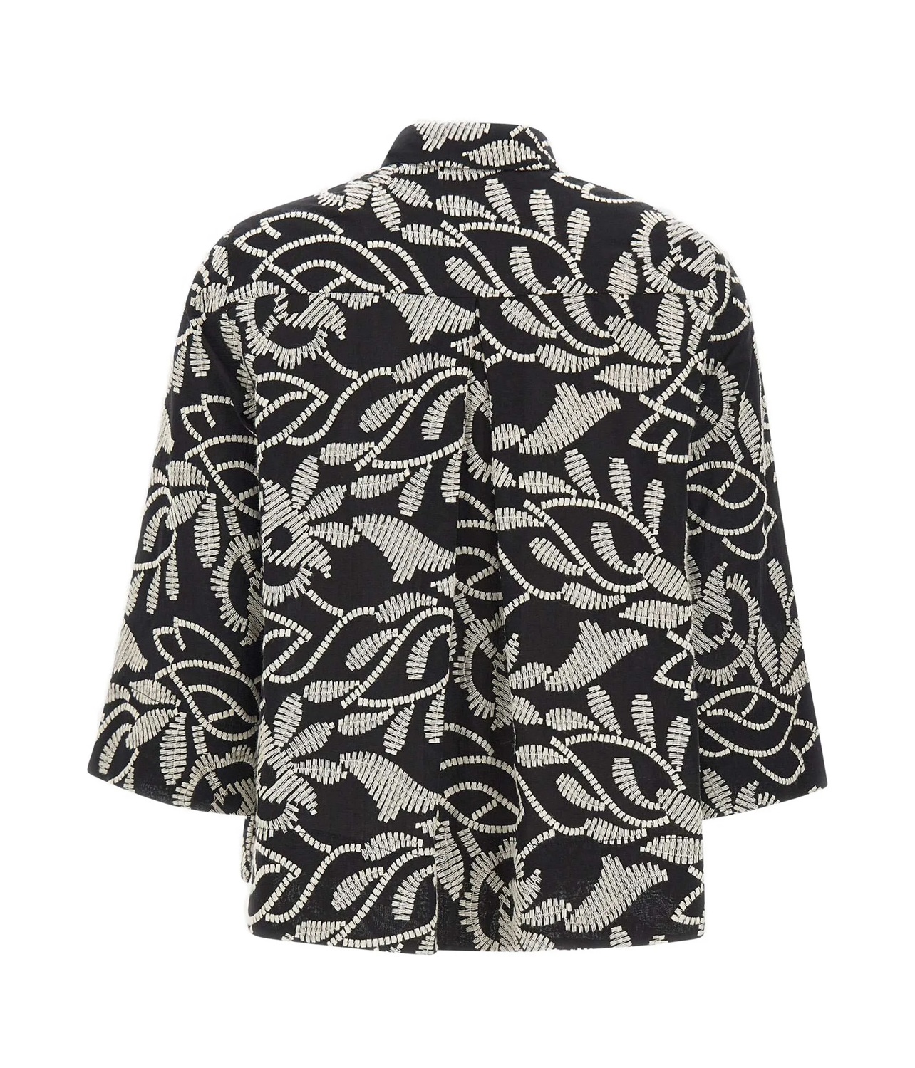 Giacca modello camicia interamente ricamata dalla linea leggermente ad A, realizzata in un voile di cotone con colore a contrasto. Maniche leggere ampie tre quarti, spacchi sui fianchi. Motivo carrè dietro con soffietto. Sfoderata.