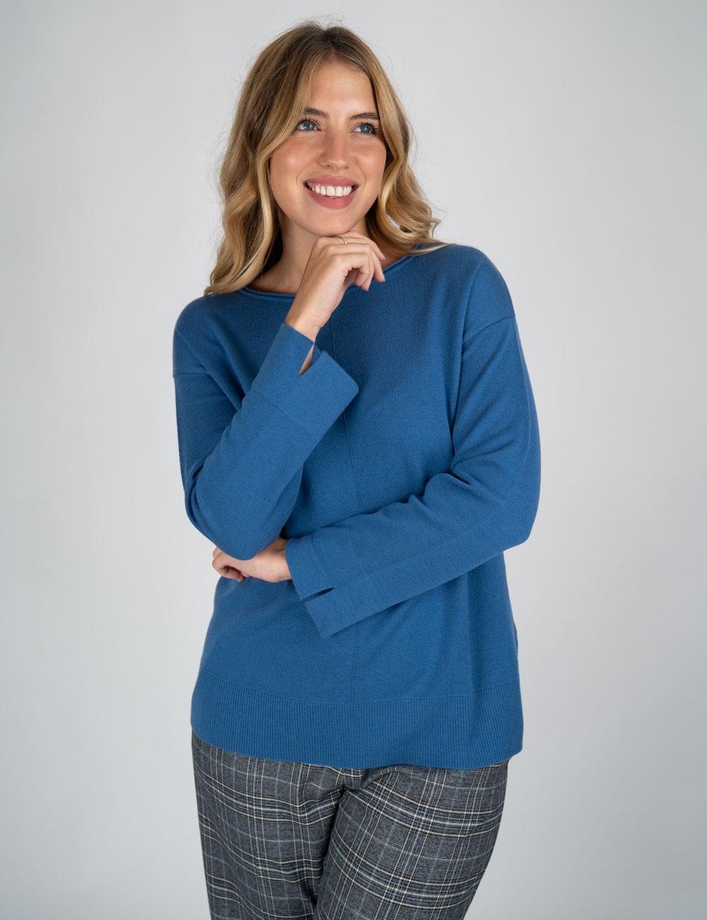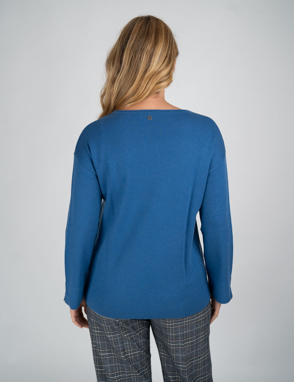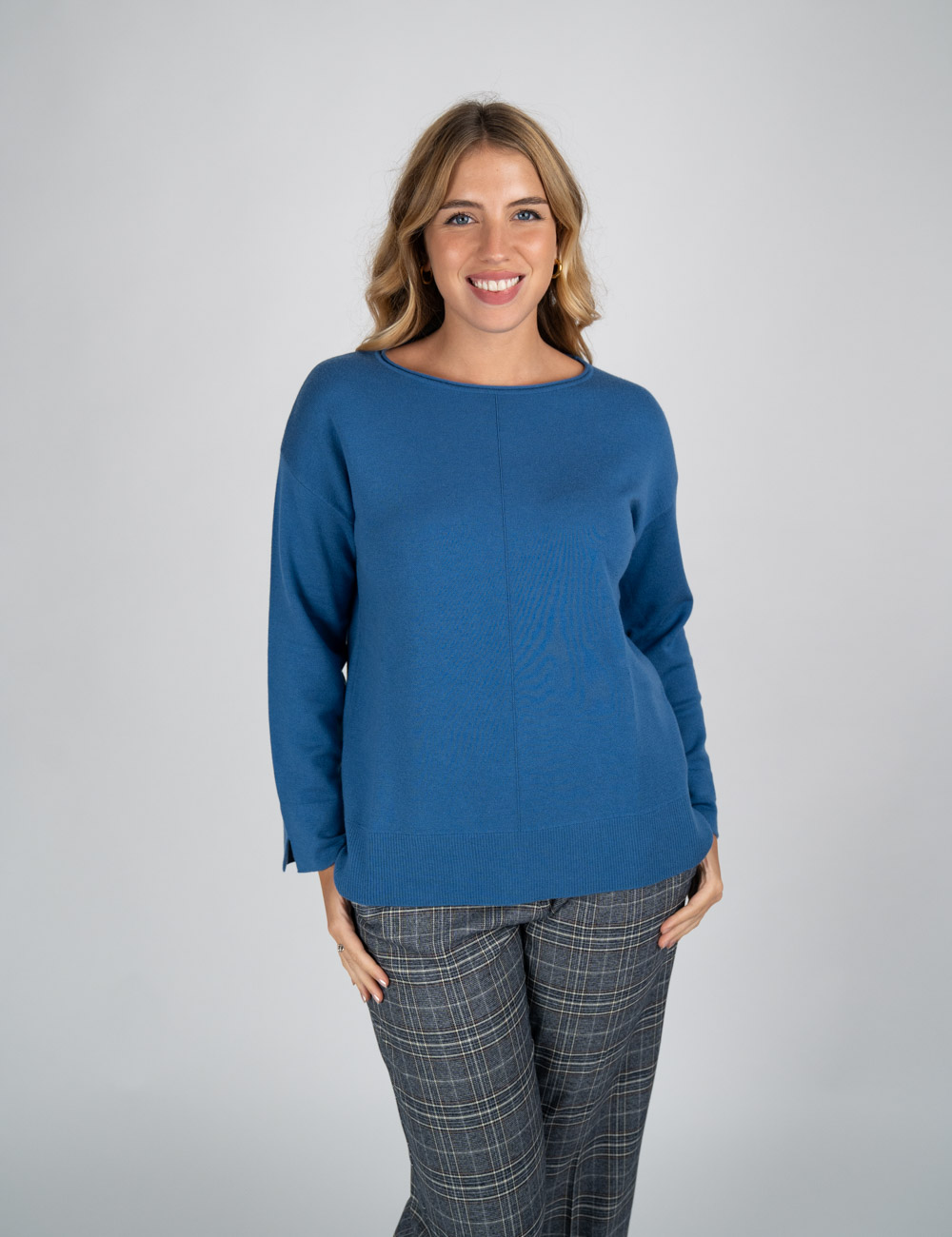 Maglia blu a scollo barca dalla linea boxy, realizzata in filato double con esterno in morbida lana/viscosa e interno in viscosa lucida che dona compattezza e comfort. Il dettaglio della nervatura centrale sul davanti e gli spacchetti sul fondo manica completano un capo sporty e funzionale, piacevole alternativa alla felpa e facilmente abbinabile a gonne e pantaloni.