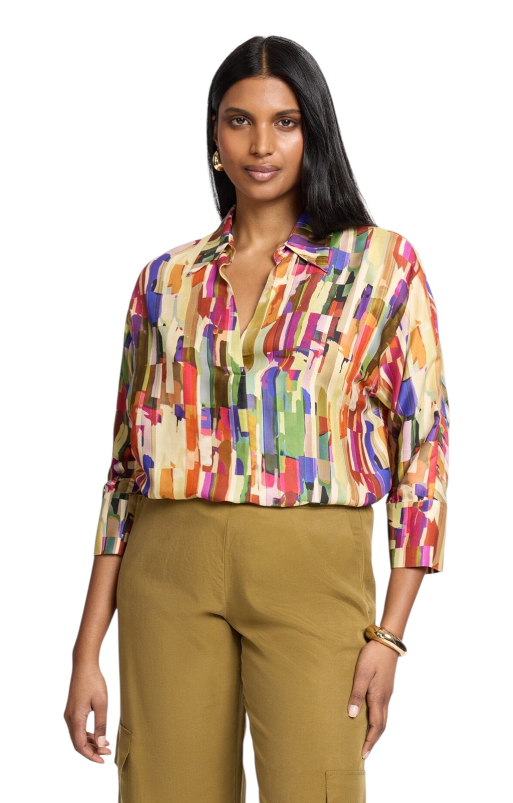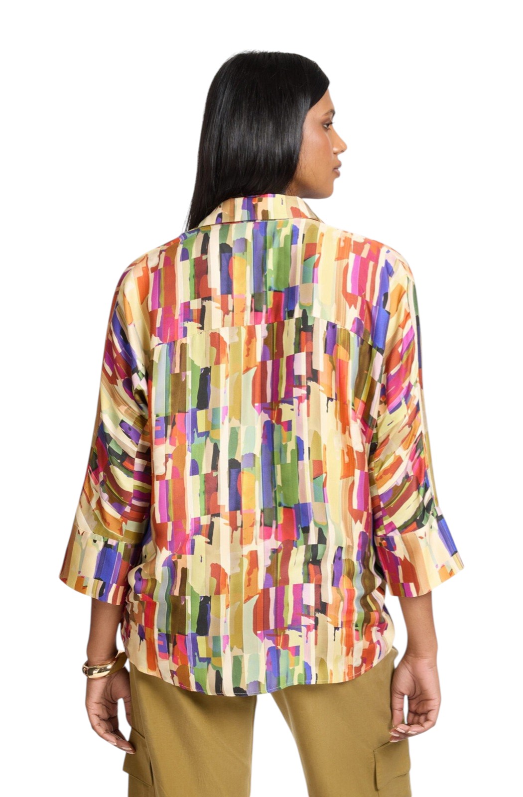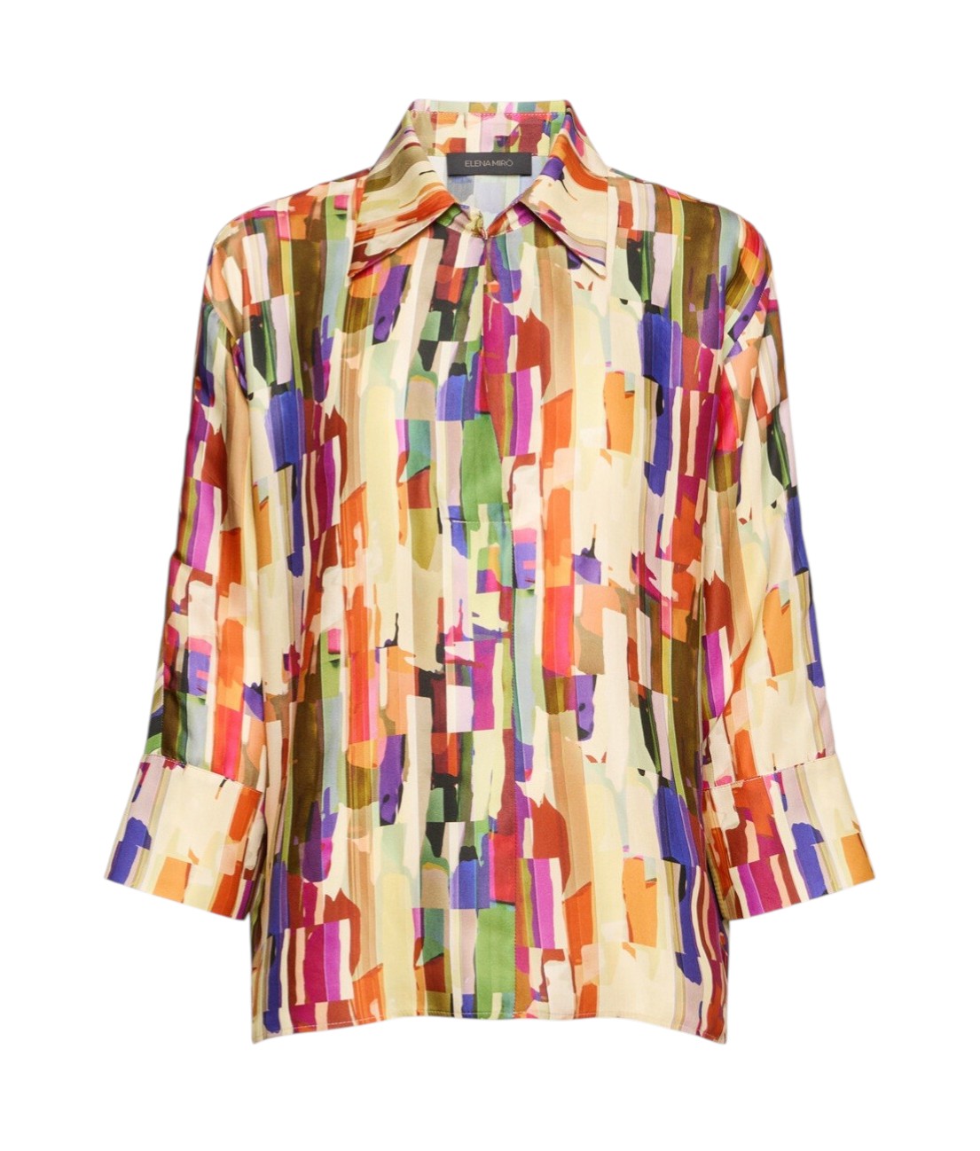 Camicia in twill di viscosa con stampa multicolore all-over e maniche tre quarti con colletto classico. Vestibilità boxy, senza chiusura.