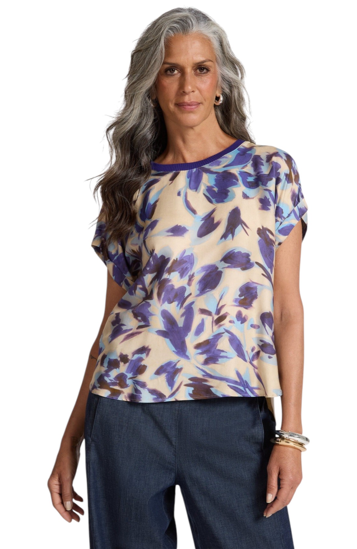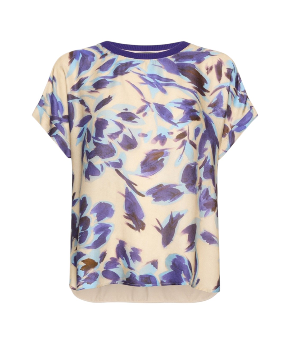 T-shirt scollo girocollo in due tessuti con davanti in raso dalla stampa multicolor e maniche corte. Dietro in jersey tinta unita. Vestibilità regular.