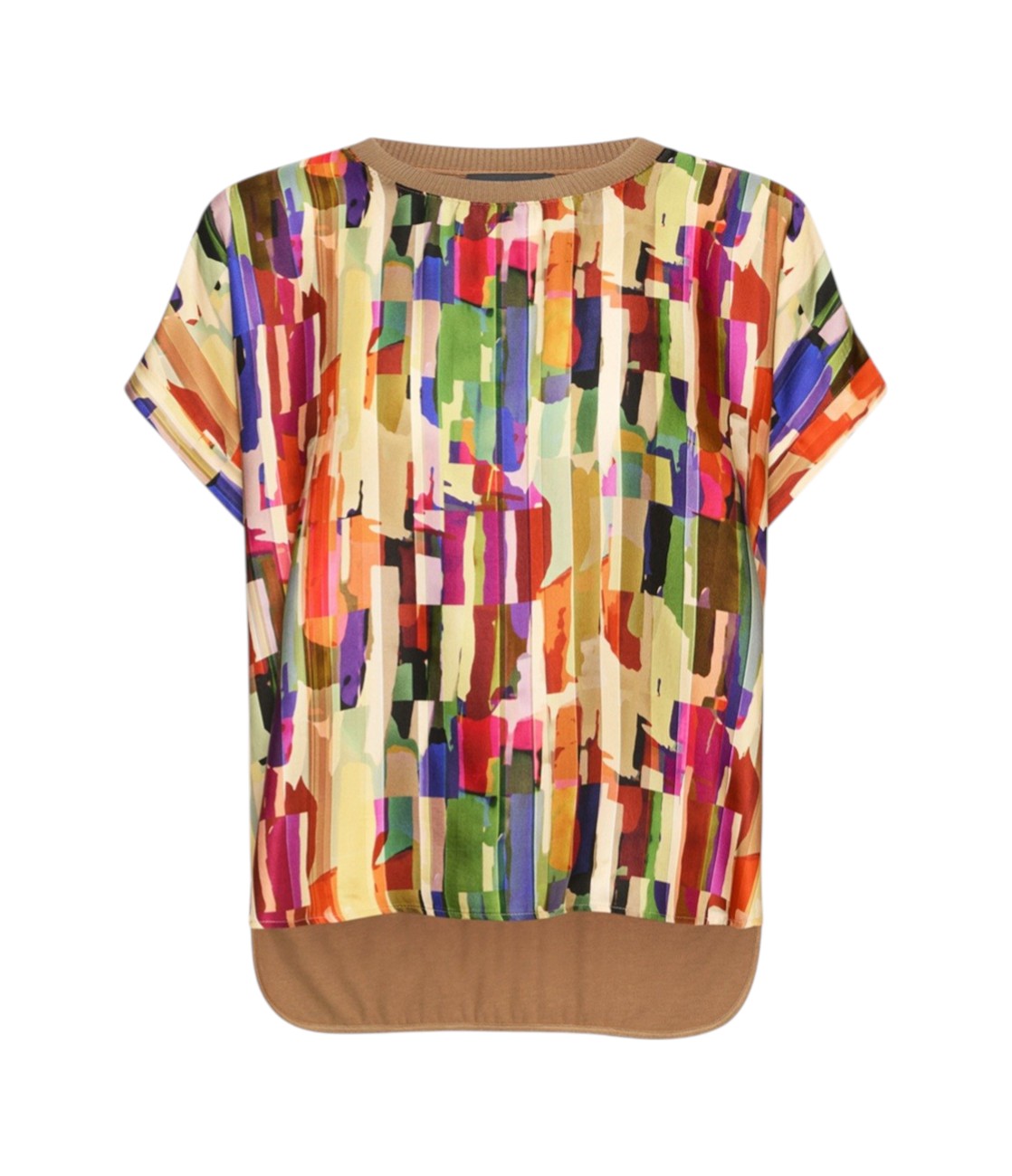 T-shirt scollo girocollo in due tessuti con davanti in raso dalla stampa multicolor e maniche corte. Dietro in jersey tinta unita. Vestibilità regular.