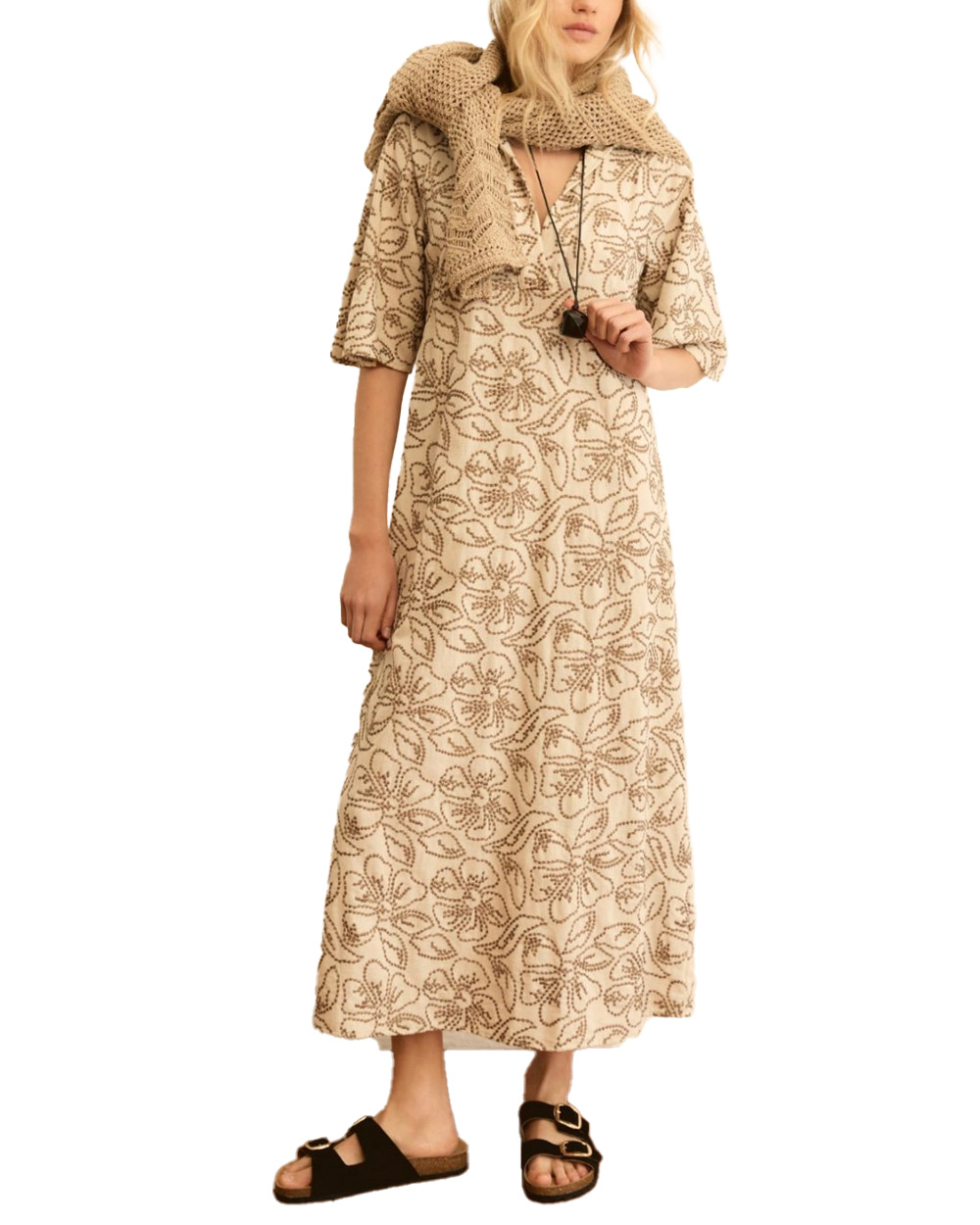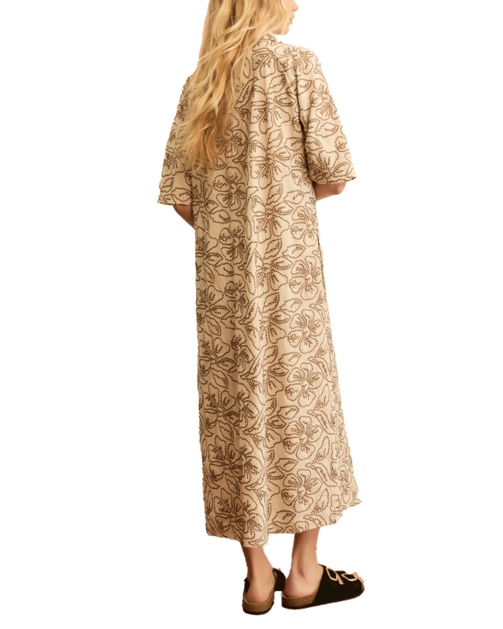 Abito in tela di cotone e lino ricamata.