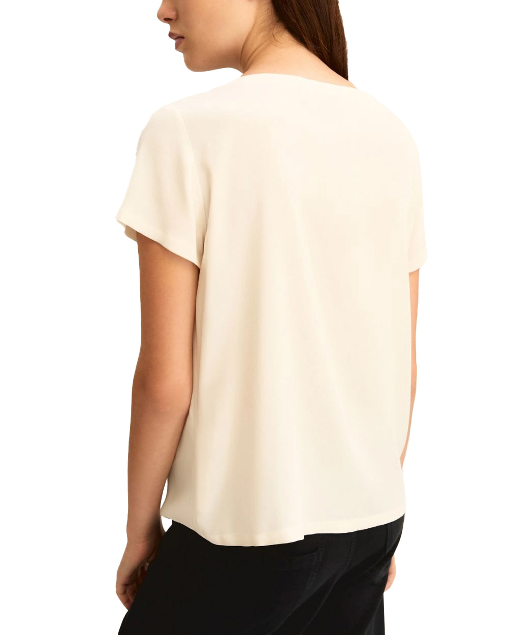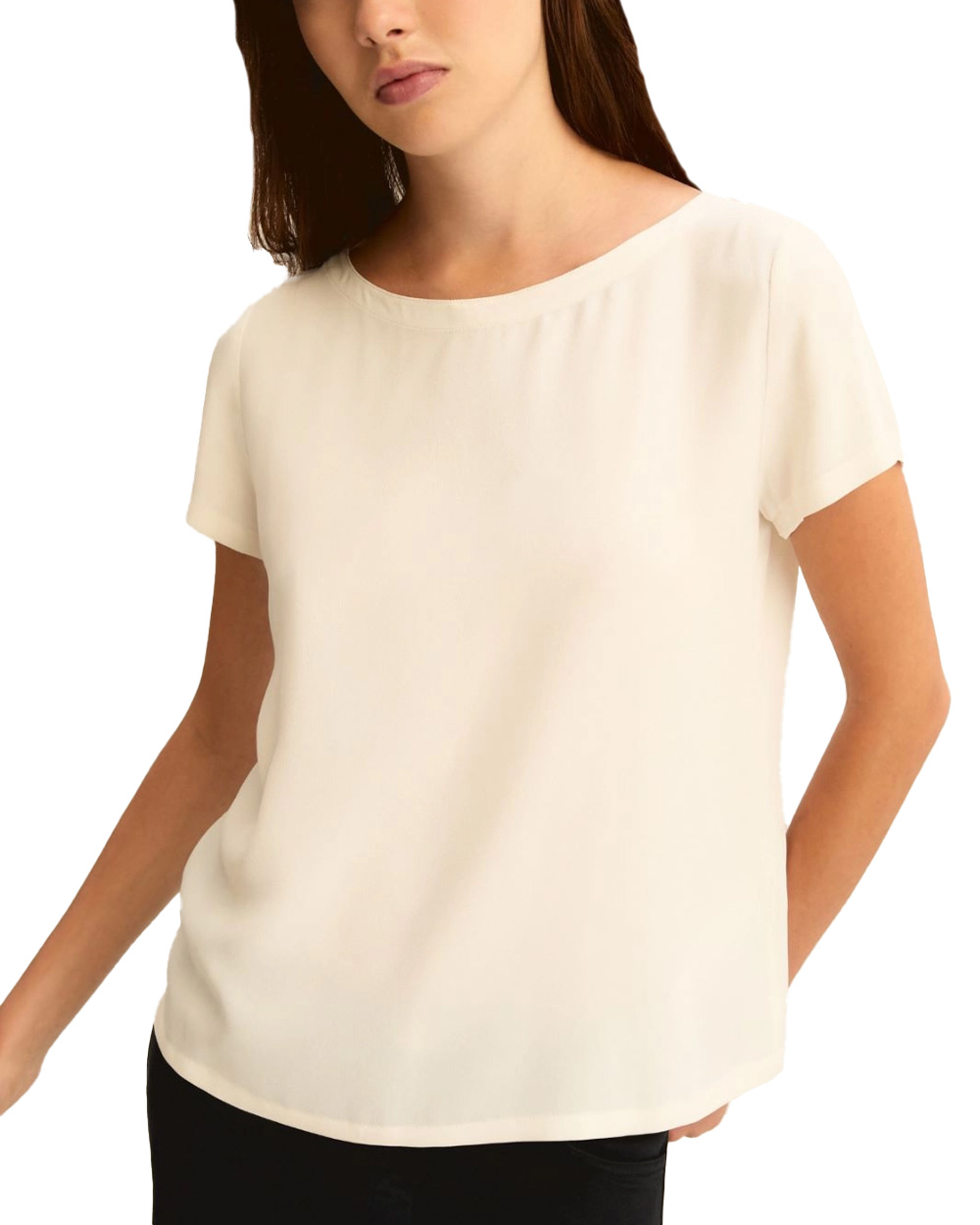 Blusa in crepe de Chine di misto seta. Fit regolare. Scollo a barchetta. Manica corta.