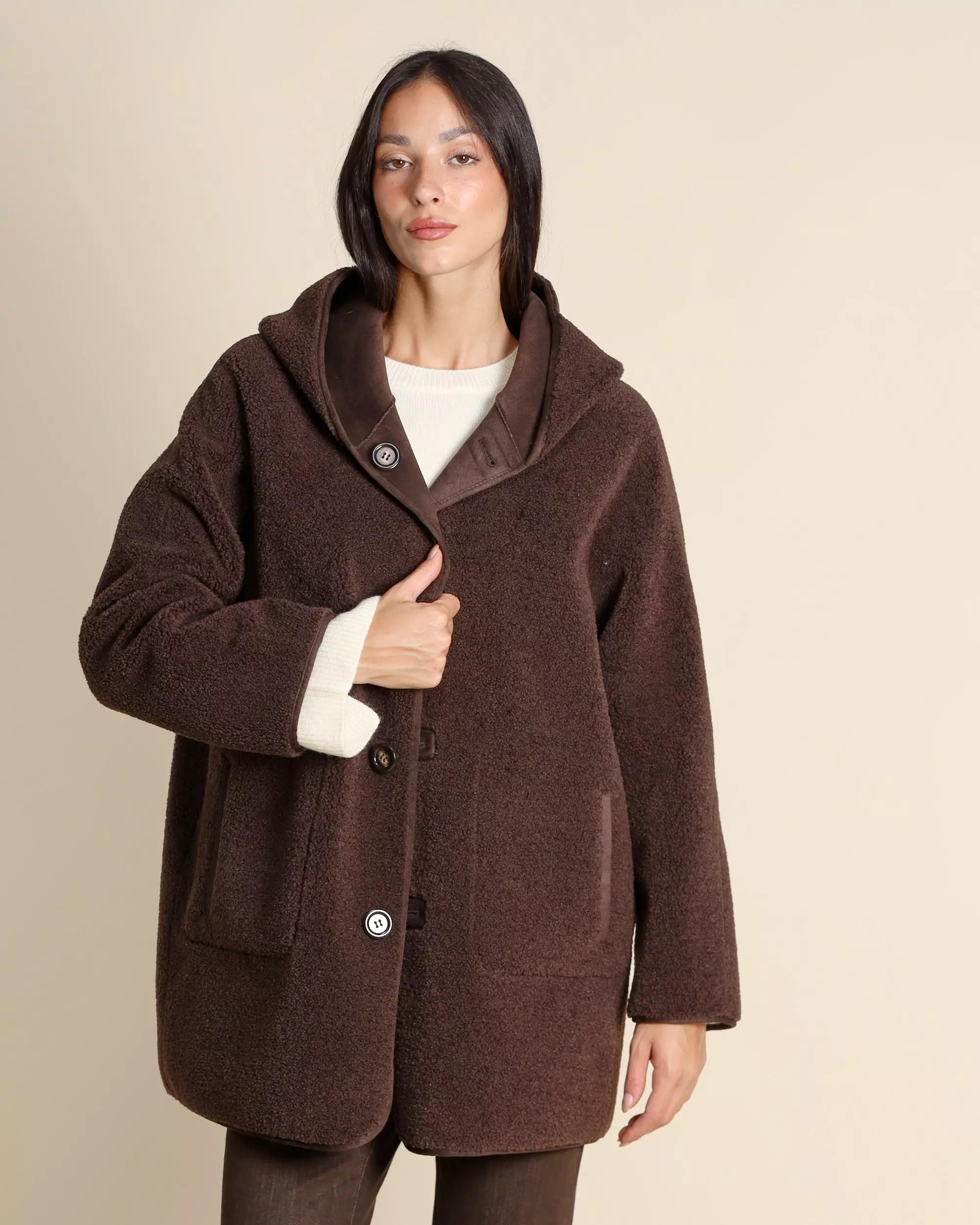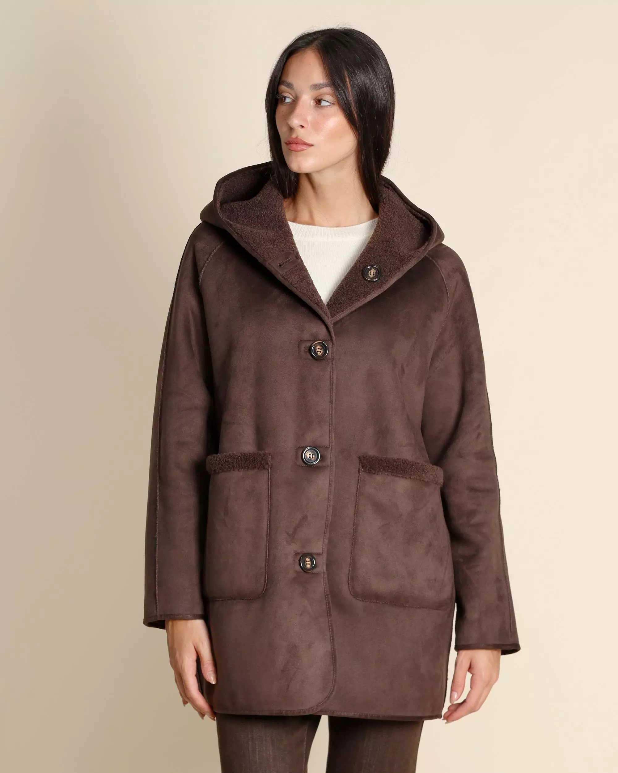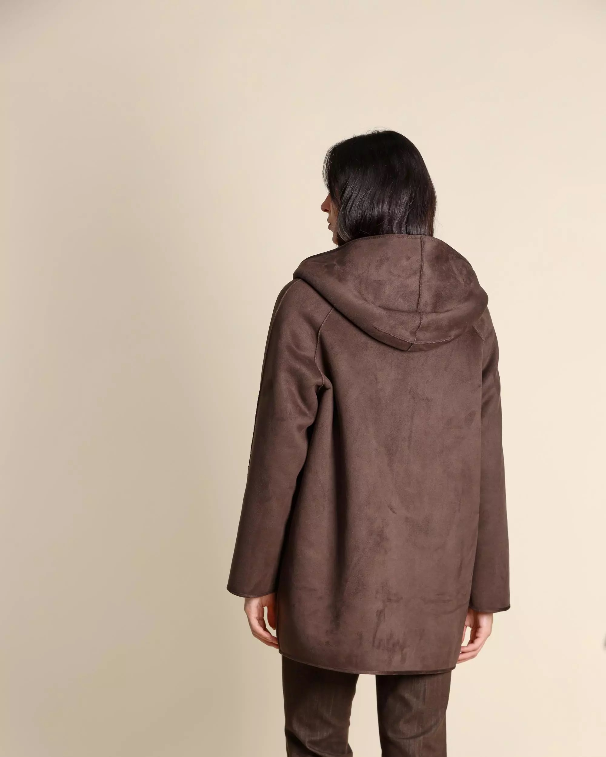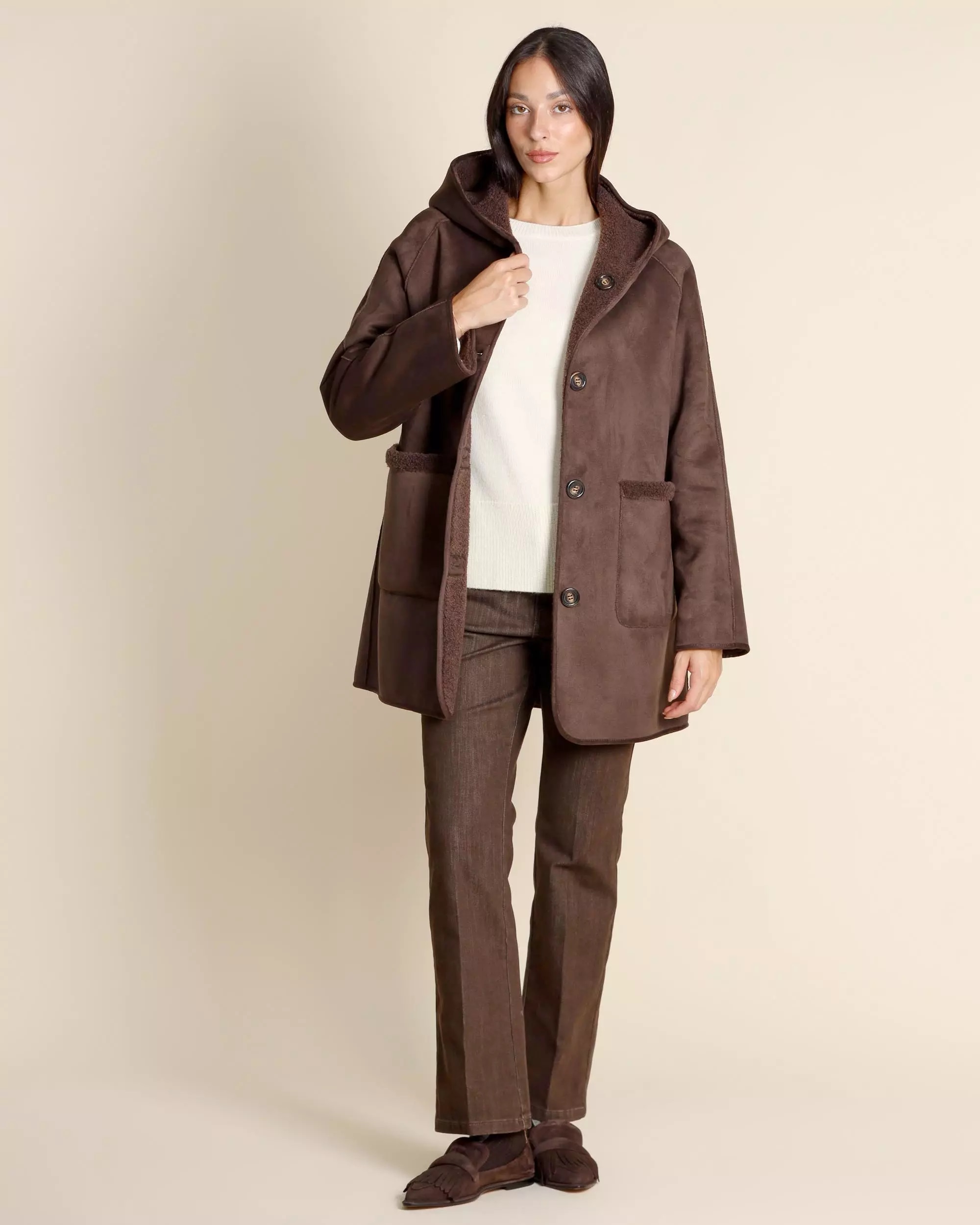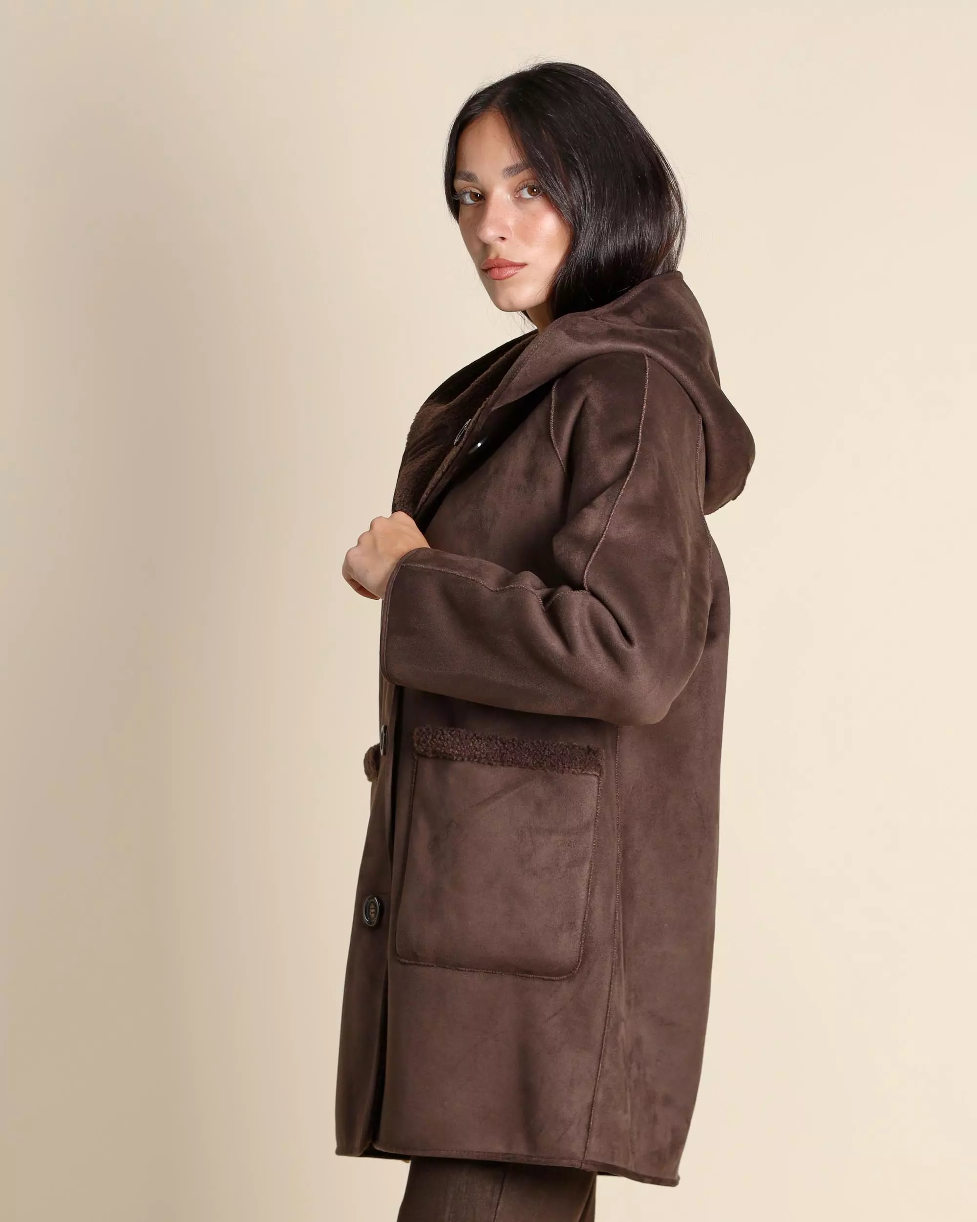 Caban reversibile da donna in color testa di moro, realizzato in jersey dal finish vellutato accoppiato con tessuto morbido. Modello dal fit dritto con cappuccio e maniche raglan, chiusura monopetto con bottoni a vista e doppia funzionalità grazie alle tasche laterali applicate su un lato e inserite sullaltro. Leggero e confortevole, è il capo ideale per uno stile urbano versatile e disinvolto.