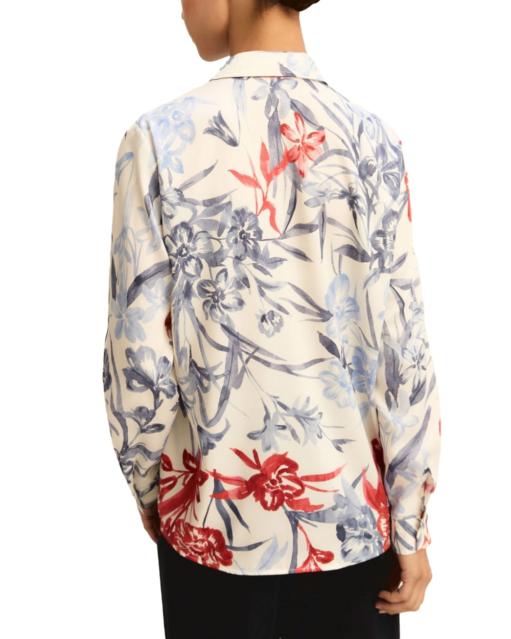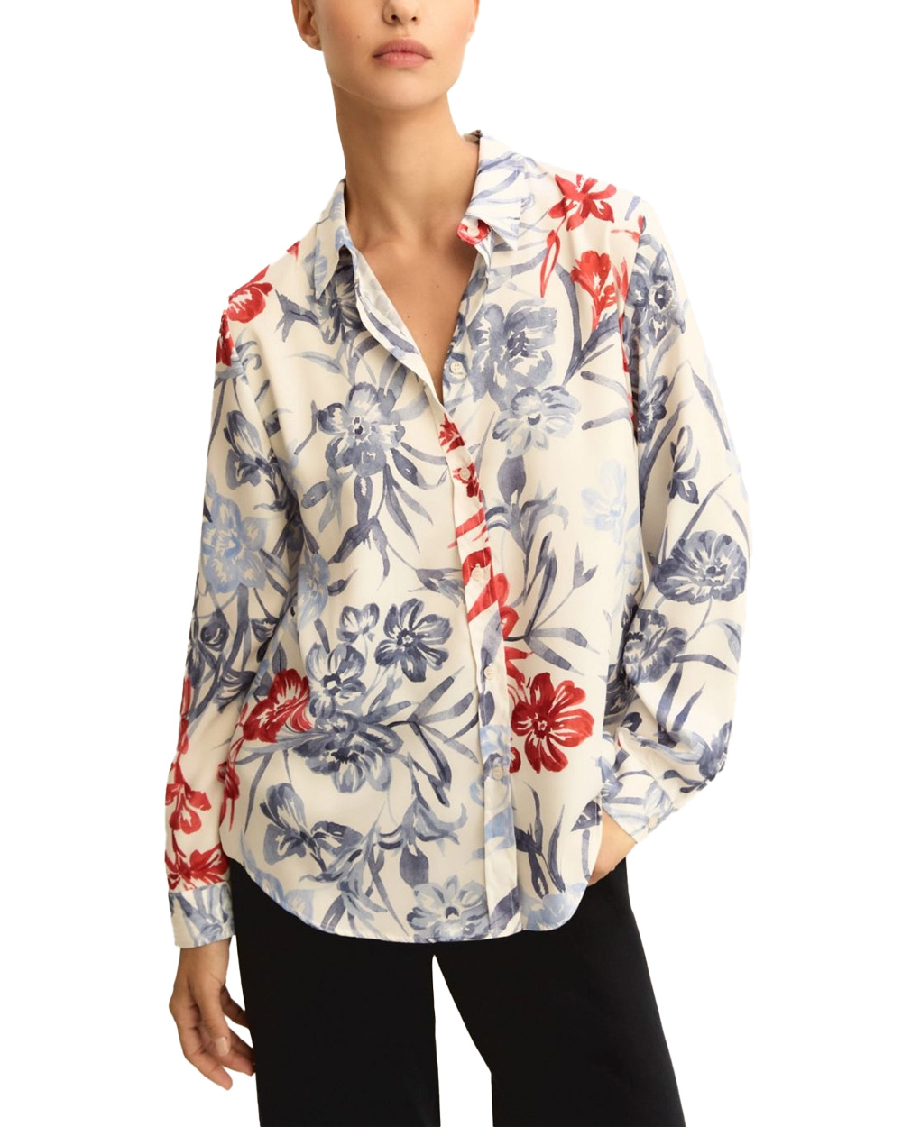 Collo a camicia. Abbottonatura a vista. Manica lunga e fondo stondato.