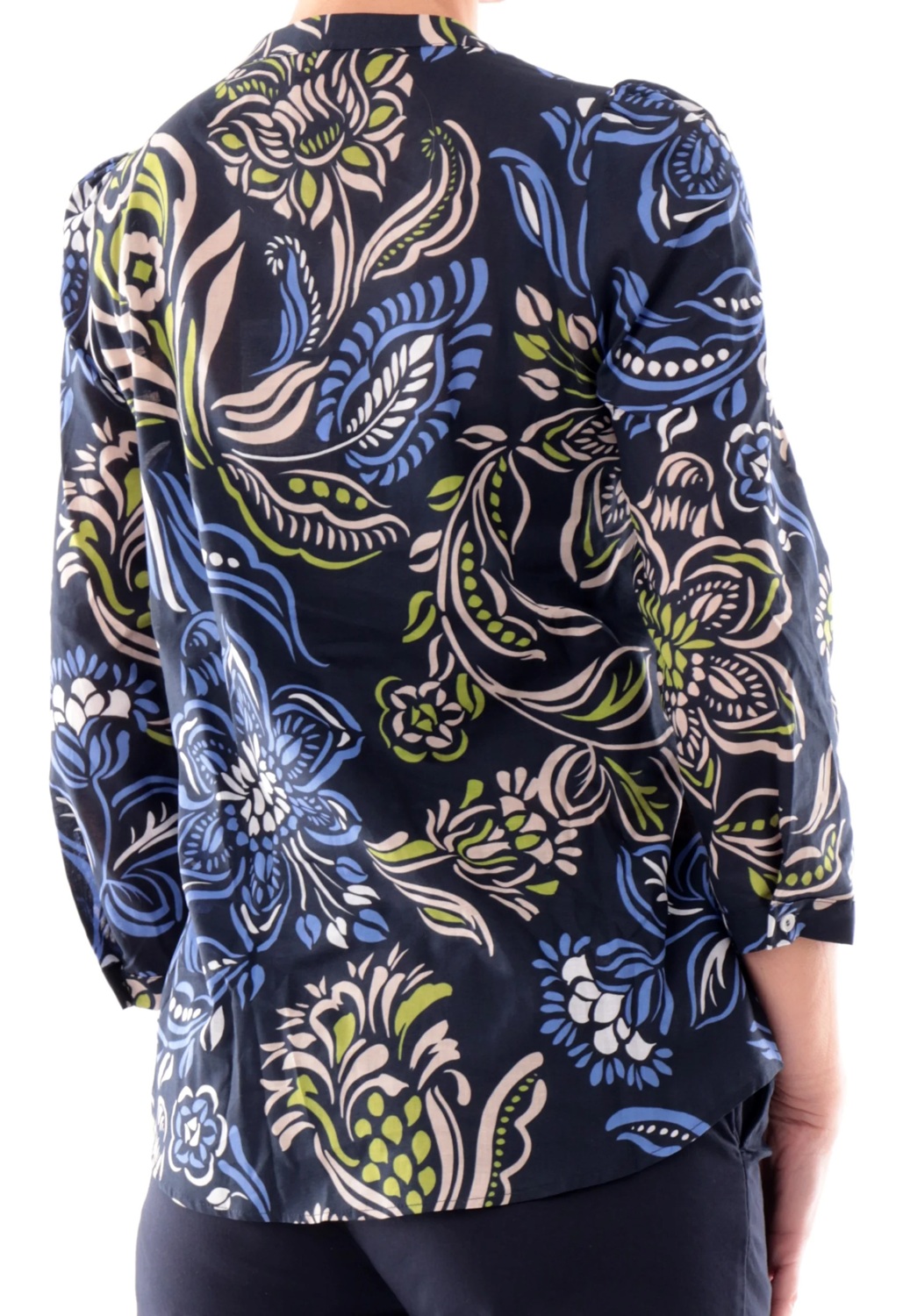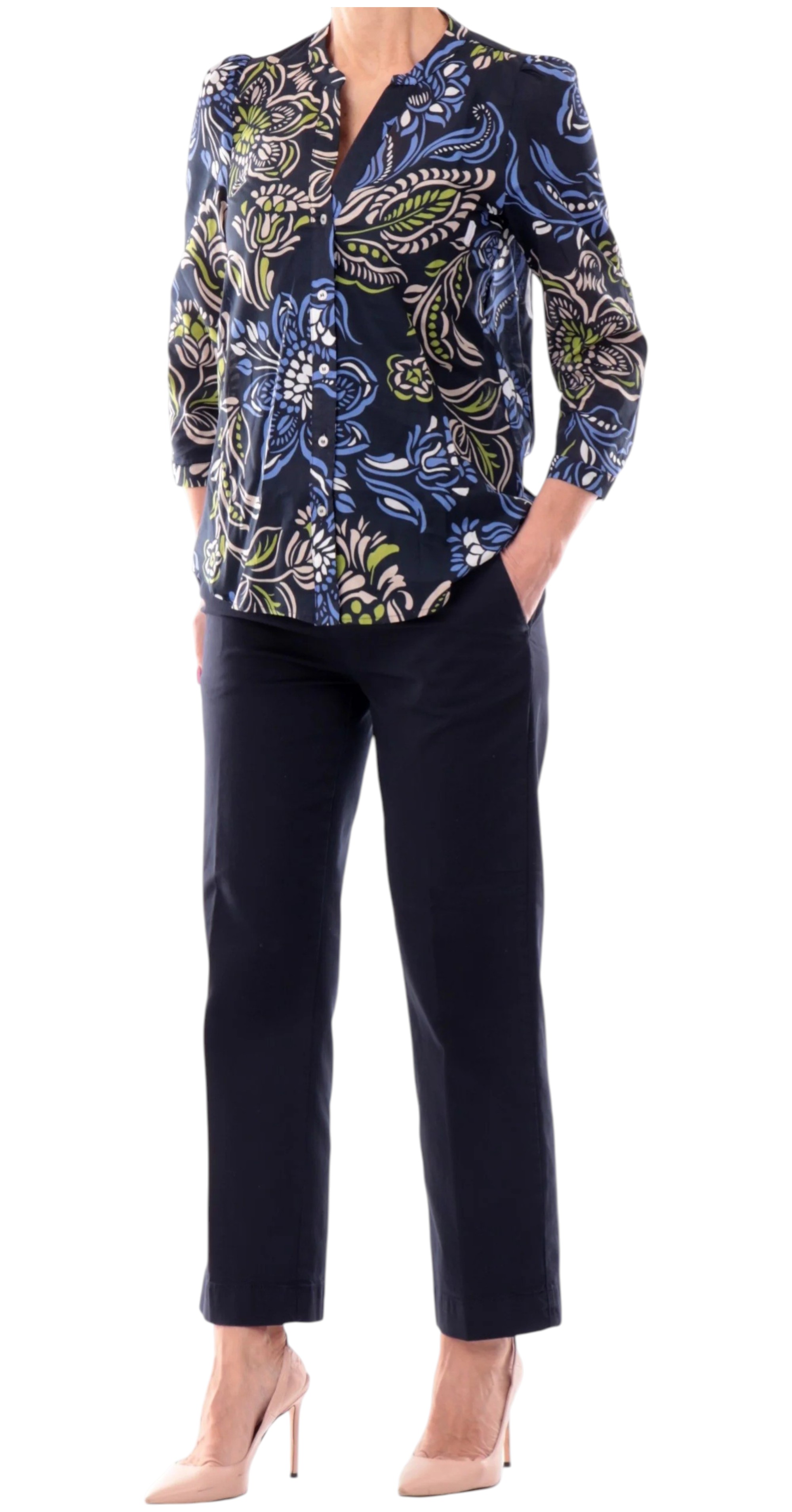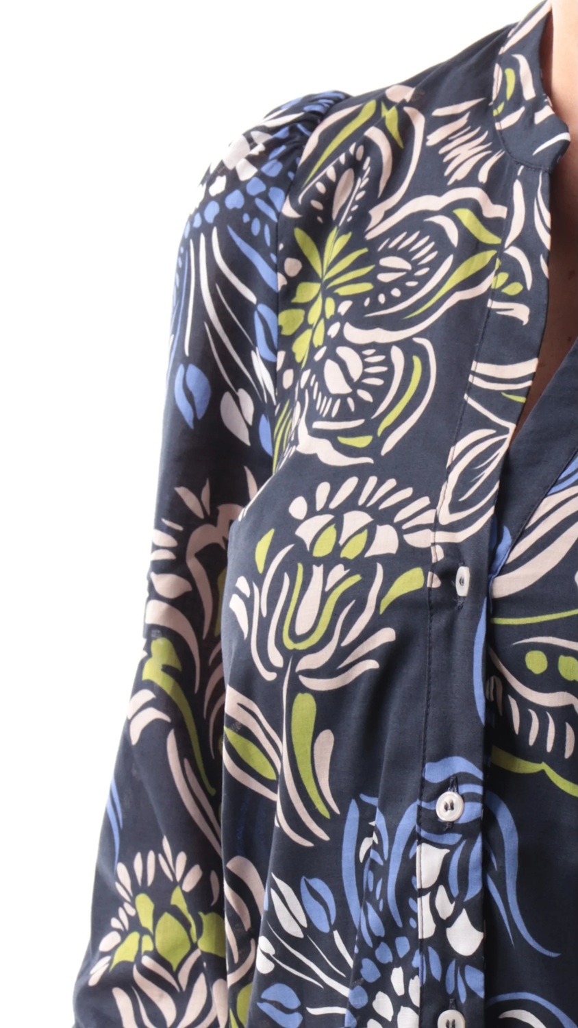 Camicia blu a fantasia floreale scollo a V. Realizzata 100% in puro cotone, maniche a tre quarti, chiusura a bottoni e fondo regolare.