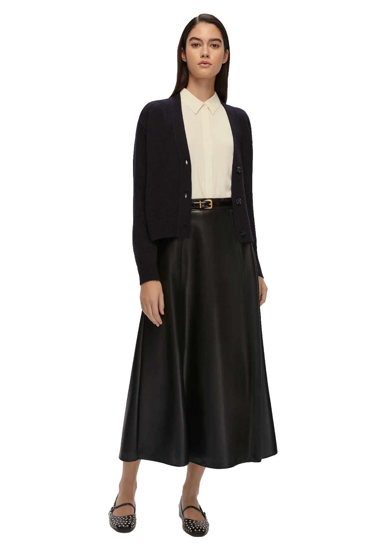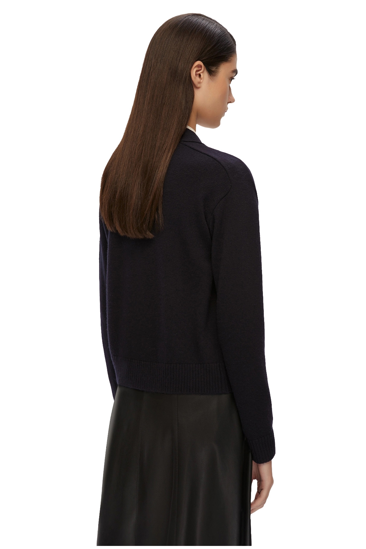 Cardigan "Blazer" blu hà dal design semplice e raffinato, realizzato in morbido filato misto lana. Il modello presenta una linea dritta con spalla scesa, scollo a V e chiusura frontale con bottoni in simil corno che donano un tocco autentico e naturale. Fondo e polsini lavorati a costine completano il capo, ideale da indossare sopra bluse o t-shirt per un look elegante e disinvolto.