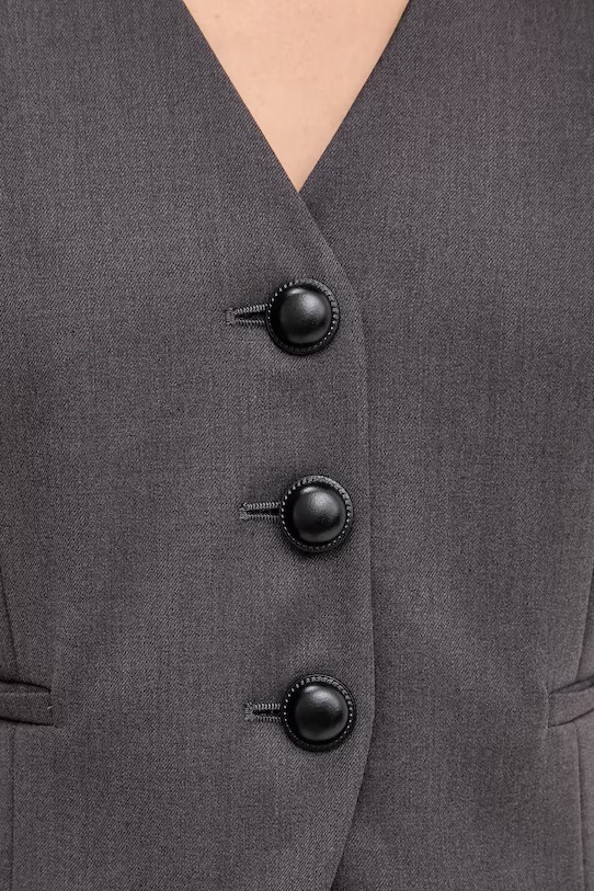 Completo "Naia" grigio melange in flanella tecnica stretch dal fit semi aderente. Gilet con scollo a V, chiusura monopetto e motivo di tagli a bretella sul davanti. Pantalone a gamba larga con chiusura a gancio a uomo. Look elegante e contemporaneo, perfetto per occasioni formali o outfit sofisticati.