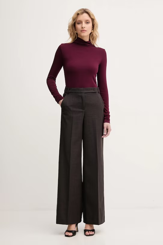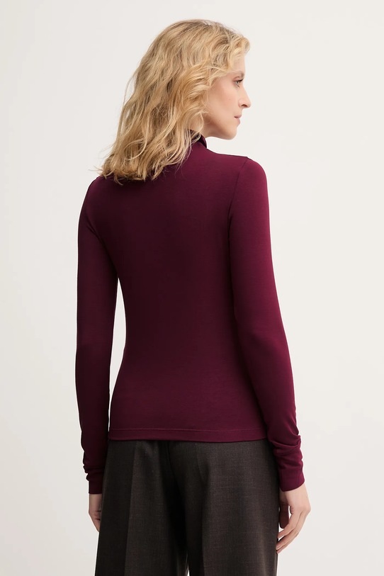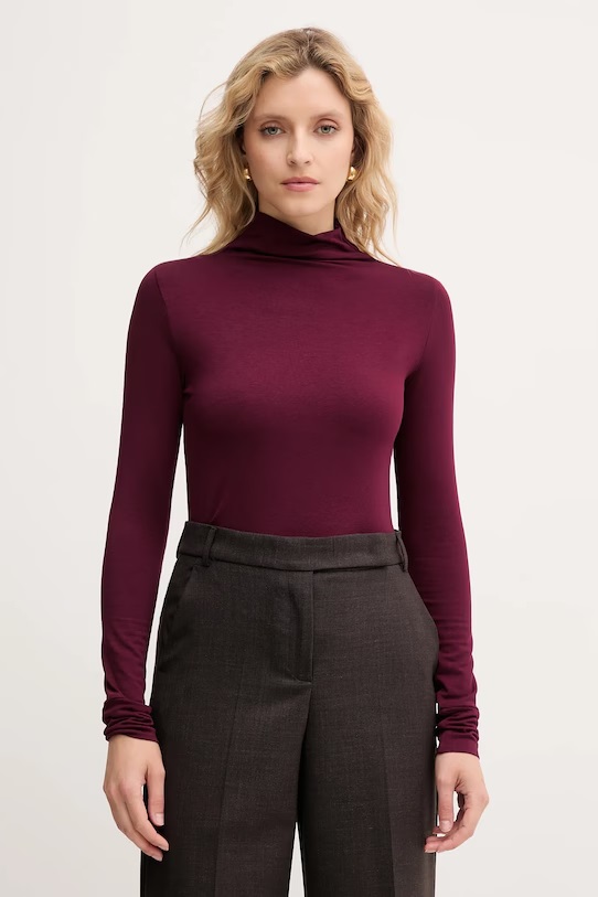 Dolcevita "Maia" bordeaux in jersey di viscosa stretch, dal fit femminile con linea sfiancata. Modello con collo a lupetto e maniche lunghe con polso. Realizzato con tessuto contenente fibre derivate dalla cellulosa del legno, ottenute nel rispetto del patrimonio forestale. Versatile sotto blazer, tricot o con denim e pants sartoriali.