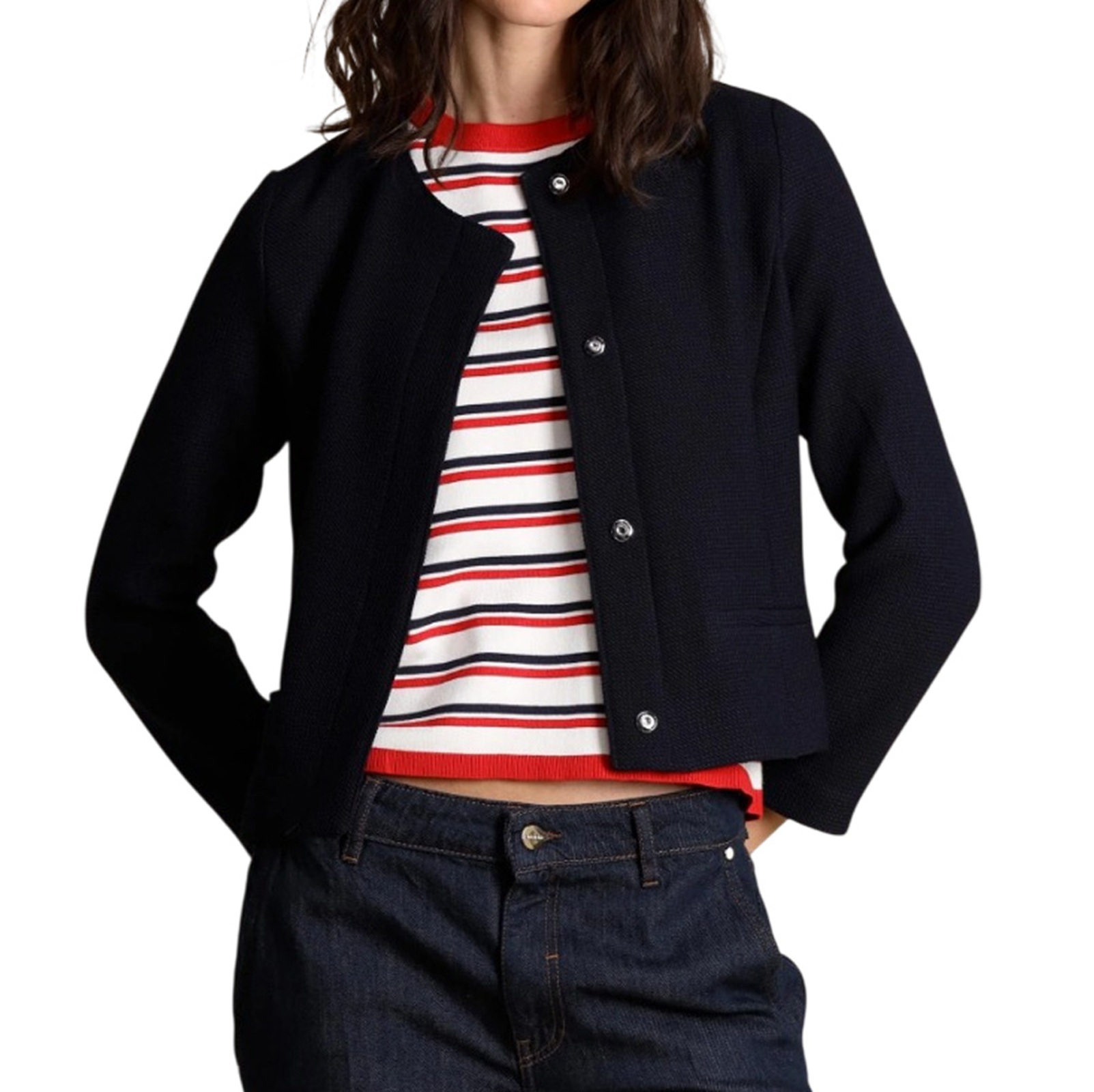 Giacca in stuoia armaturata con scollo stondato e chiusura con bottoni automatici nascosti. Tasche laterali con filetto, fianchetti sagomati. Fit aderente.