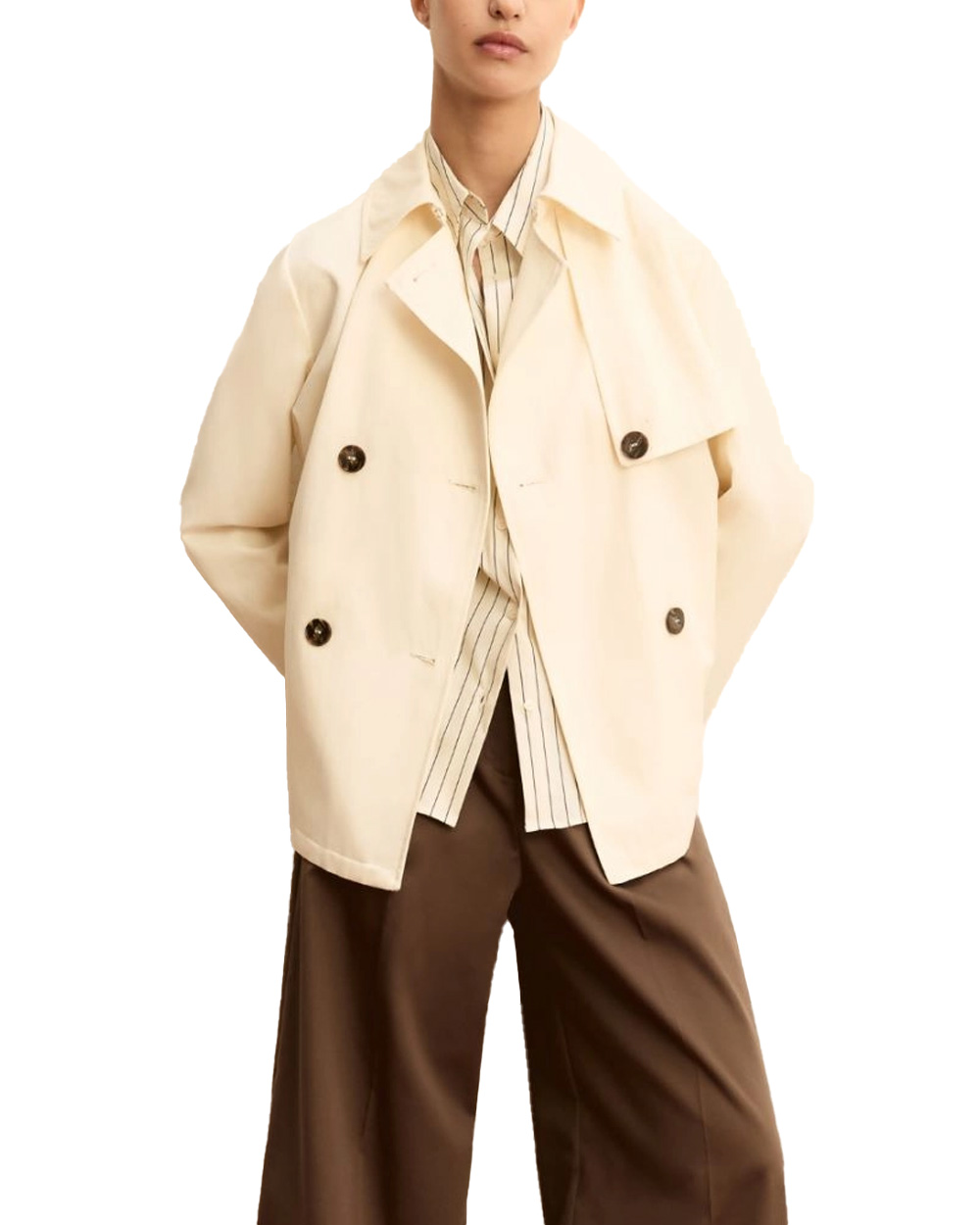Abbottonatura a doppiopetto e bavoletta sul davanti.