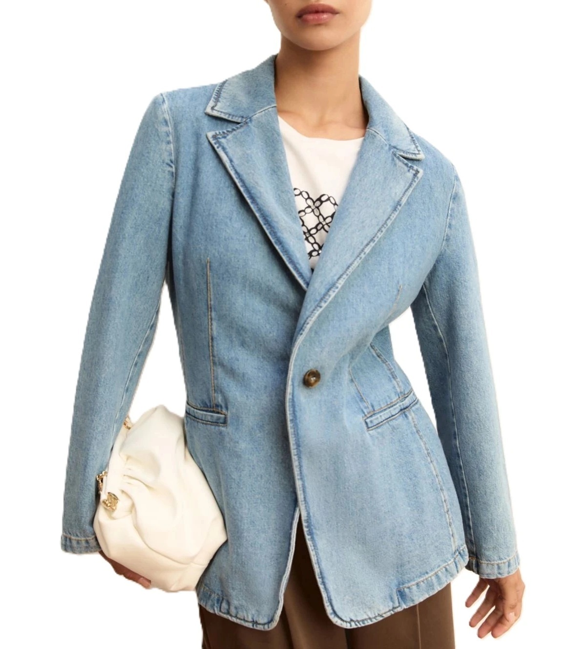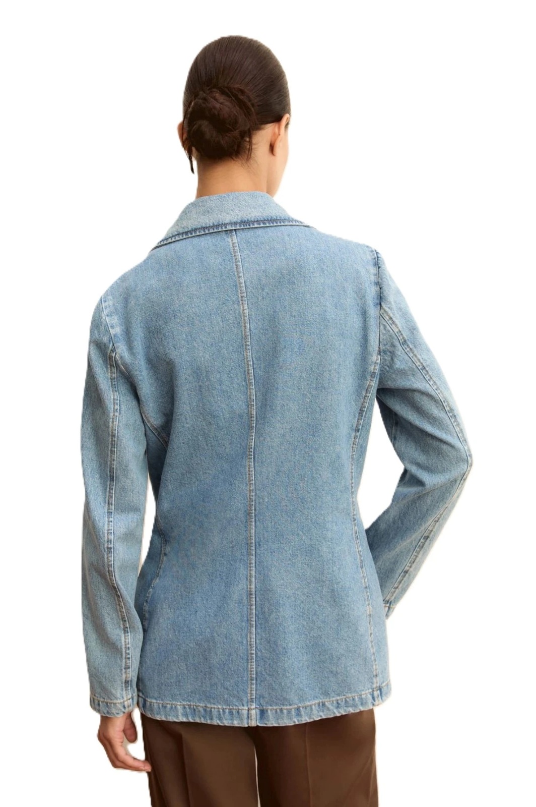 Giacca in denim con scollo con rever e chiusura monopetto con bottone a vista, tasche a filetto con pince e fianchetti sagomati.