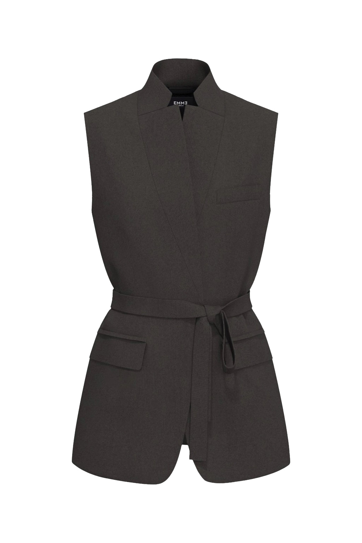Giacca smanicata "Ursula" in flanella leggera di misto lana color grigio antracite, con fodera interna ed etichetta Manteco. Linea dritta con rever classico e cintura in vita che valorizza la silhouette. Tasche laterali con doppio filetto e patta, spacco centrale posteriore. Un capo elegante e versatile, perfetto per look stratificati dal gusto contemporaneo.