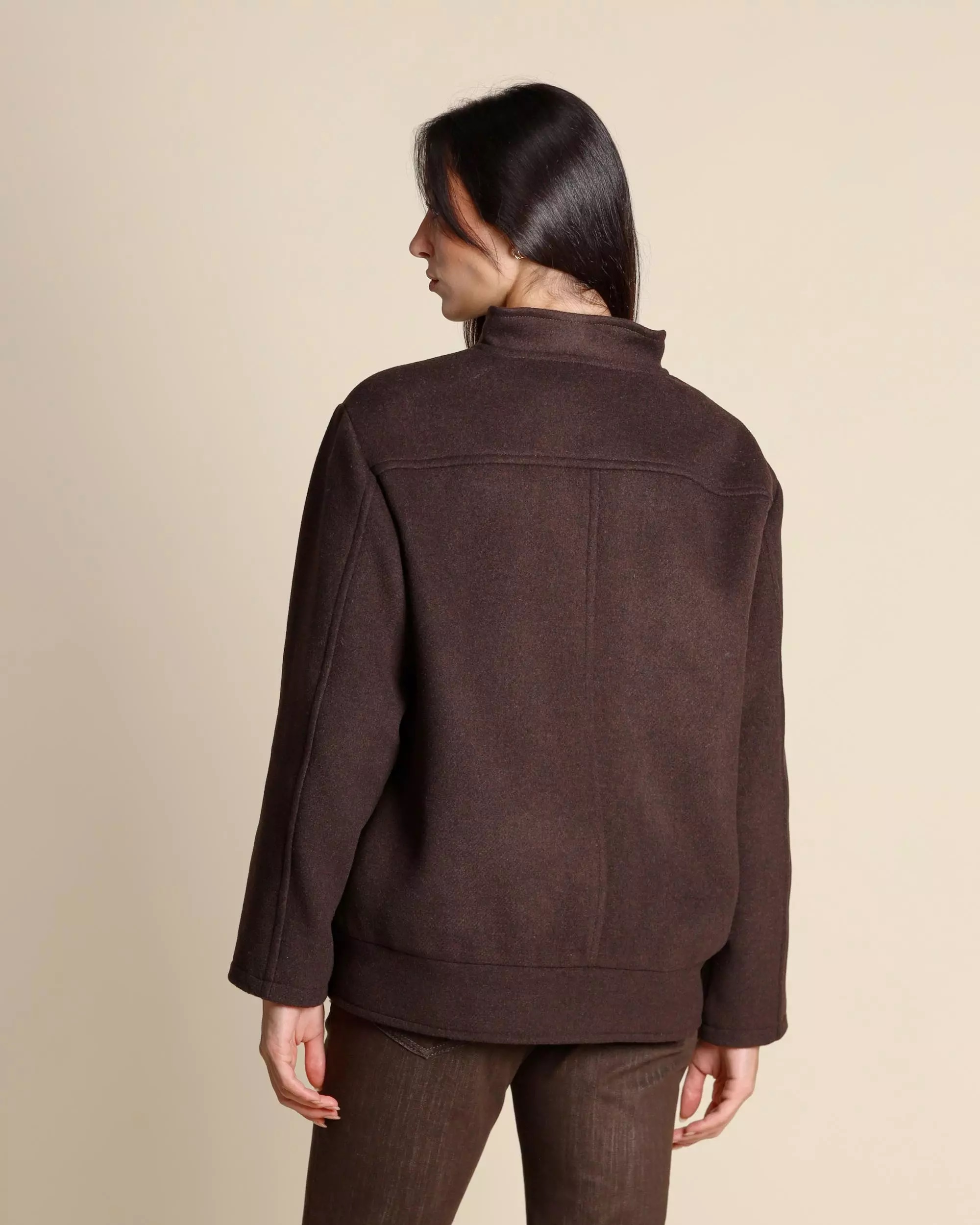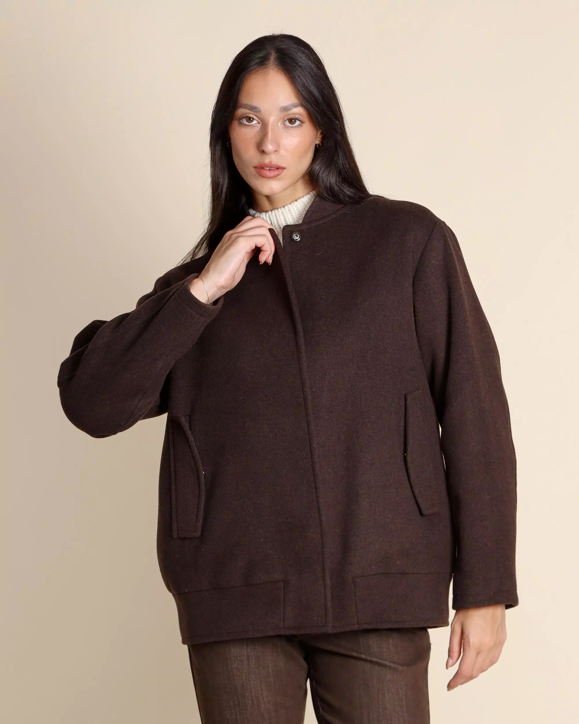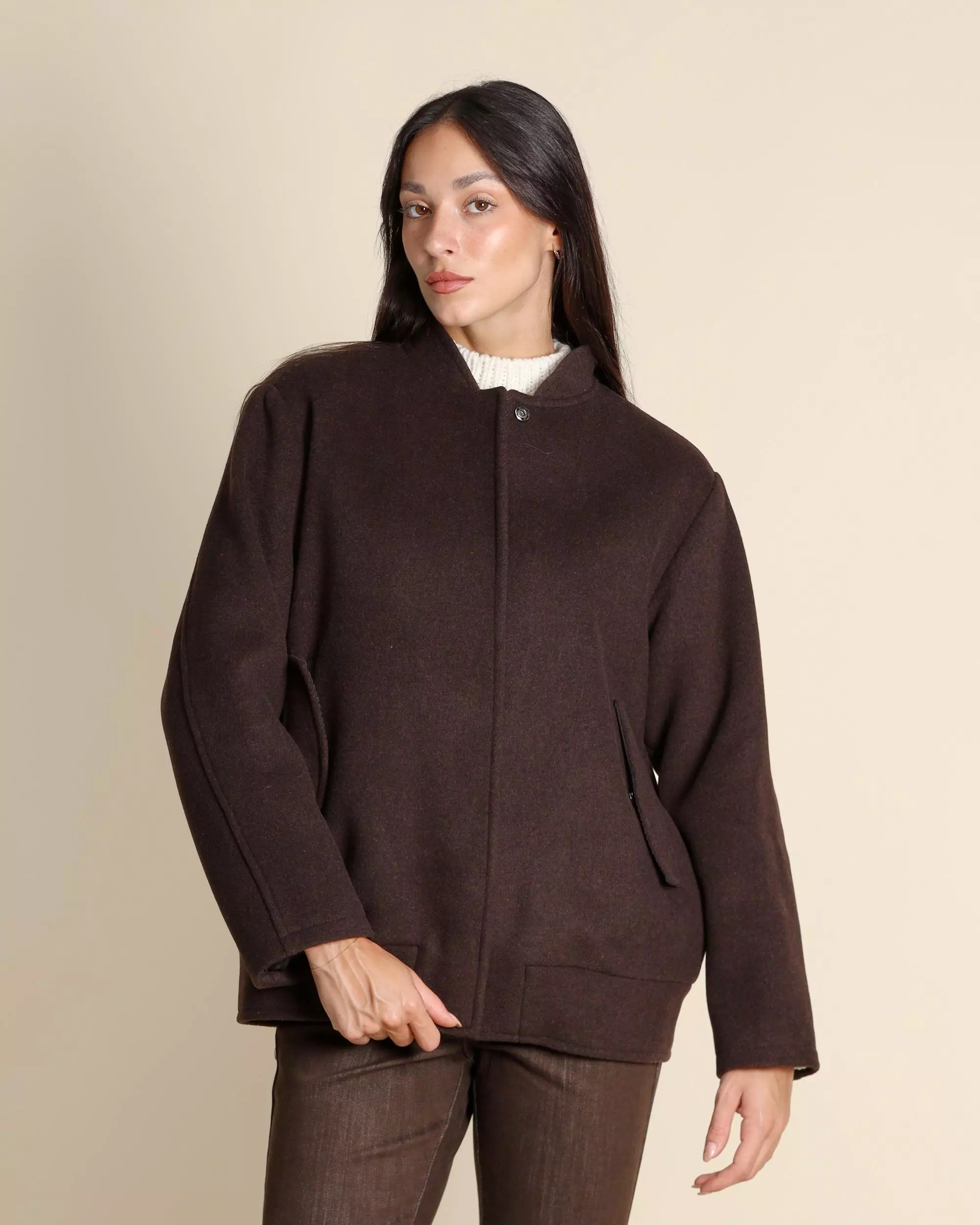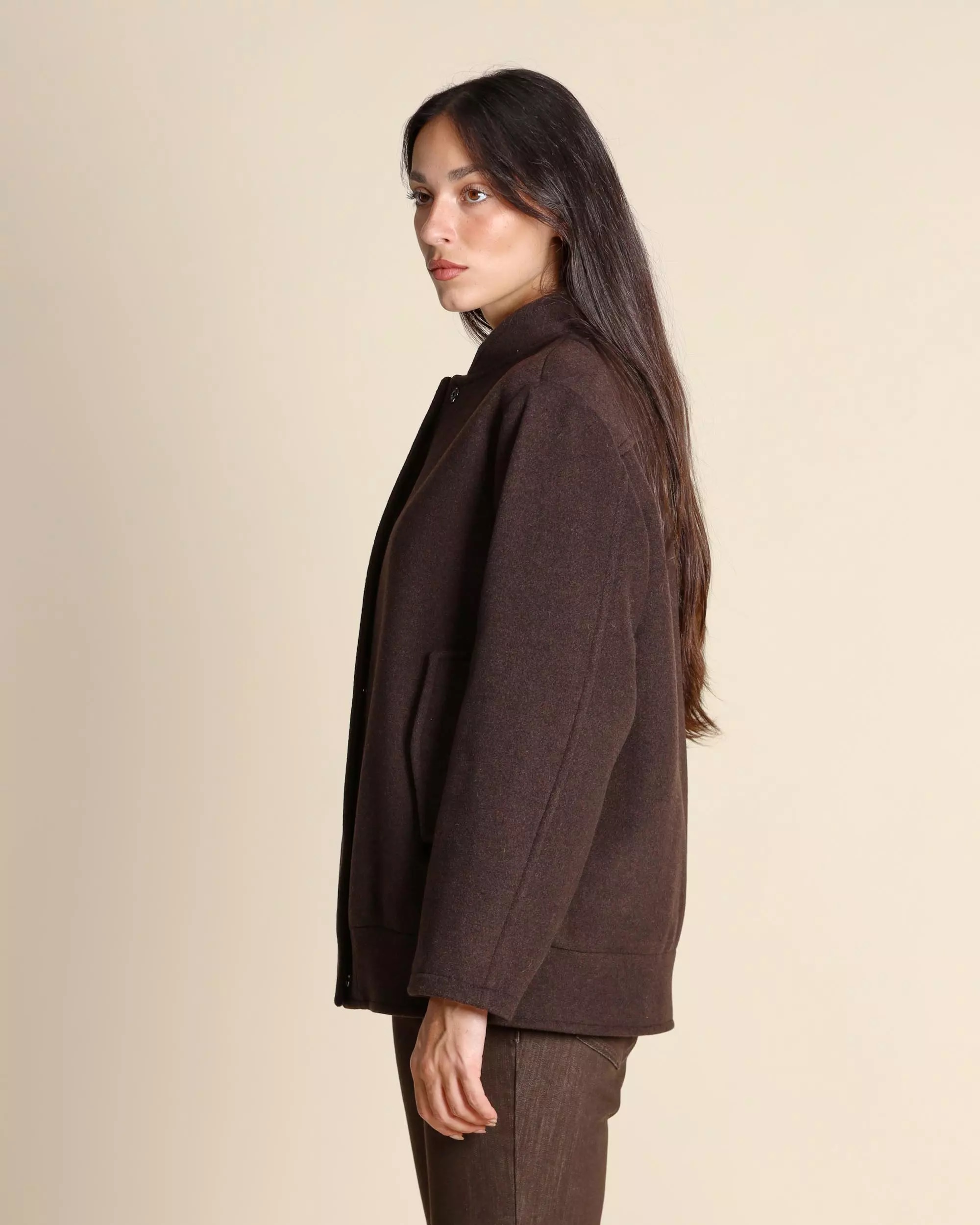 Giaccone "Notaion" color testa di moro in panno doppio di misto lana, con fodera interna ed etichetta Manteco. Modello dal fit morbido che reinterpreta il bomber con linee sartoriali, collo alto e chiusura con bottoni automatici nascosti. Fondo con fascia e leggere arricciature che donano un effetto grafico e moderno. Tasche laterali con patta. Un capo che fonde eleganza e spirito sportivo per un look urbano contemporaneo.