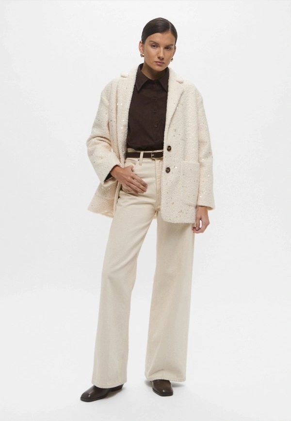 Giaccone "Ranch" in jersey bouclé color burro, impreziosito da ricamo con paillettes e fodera interna. Modello dal fit oversize con scollo a rever e spalla scesa, chiusura monopetto con due bottoni a vista e tasche applicate sui fianchi. Un capo sofisticato e luminoso, perfetto per donare carattere ai look quotidiani e alle occasioni speciali.