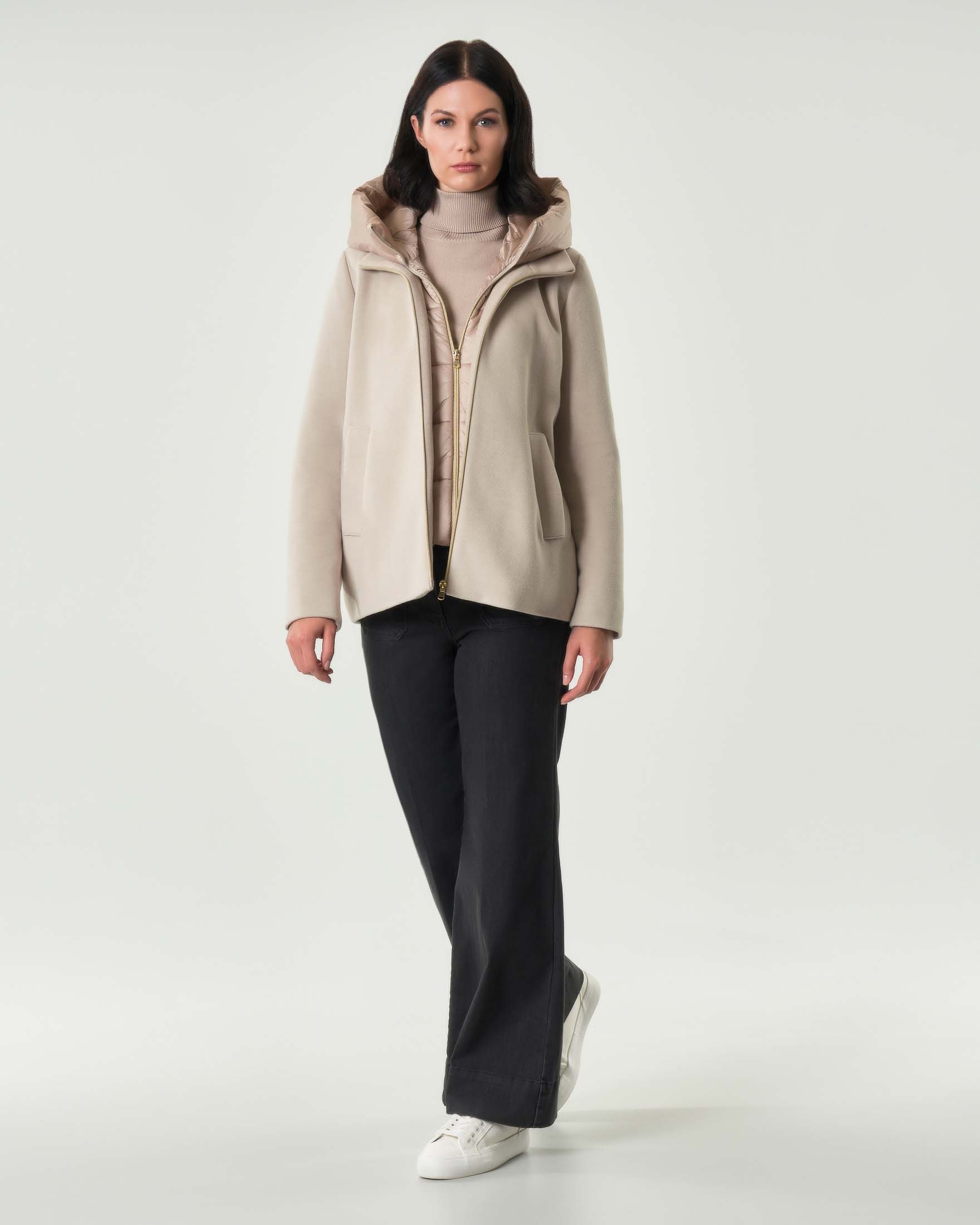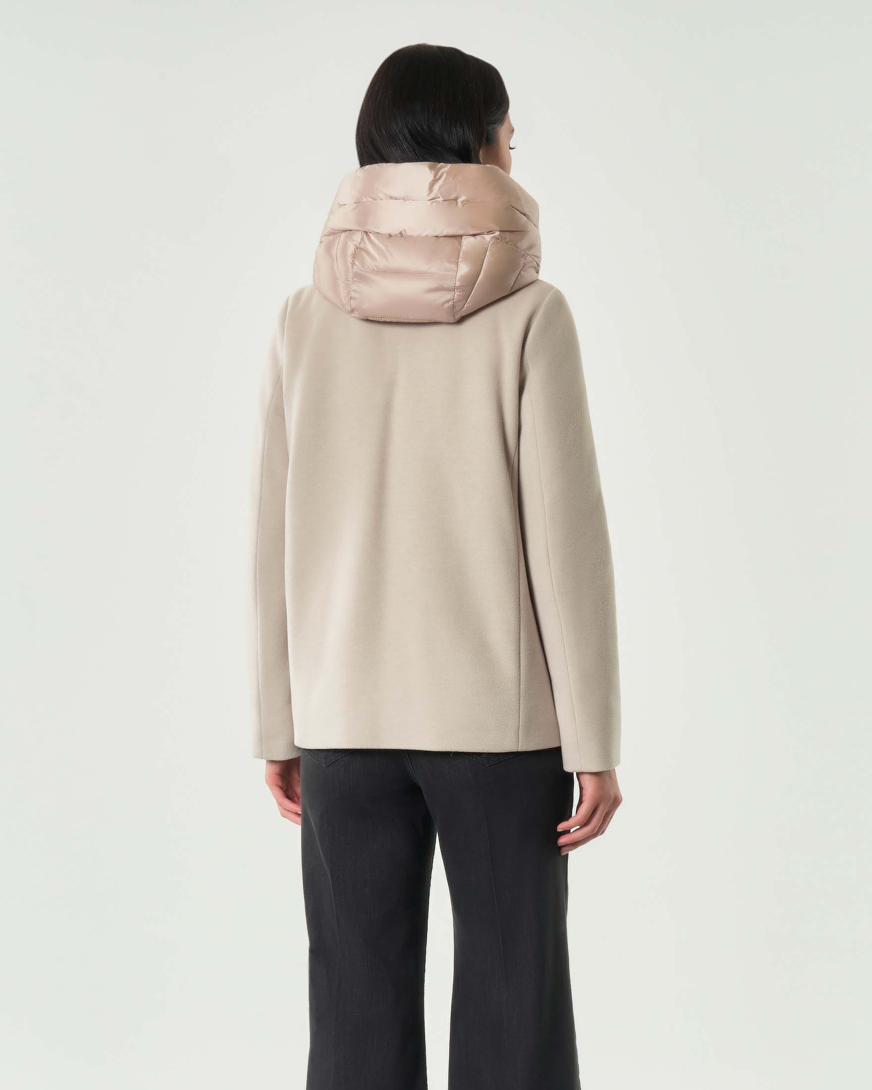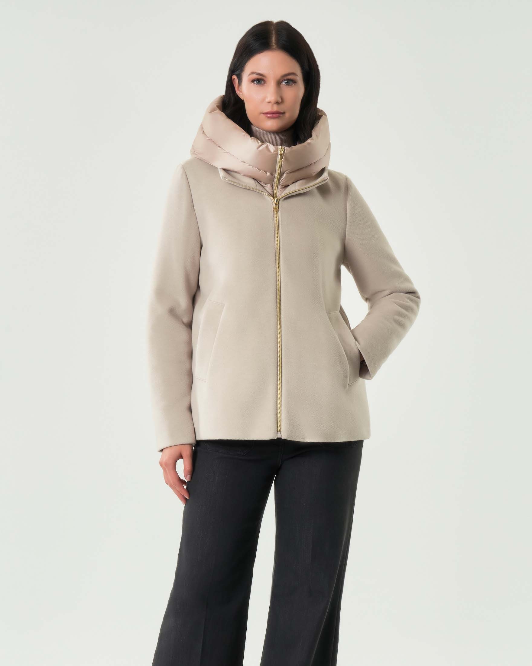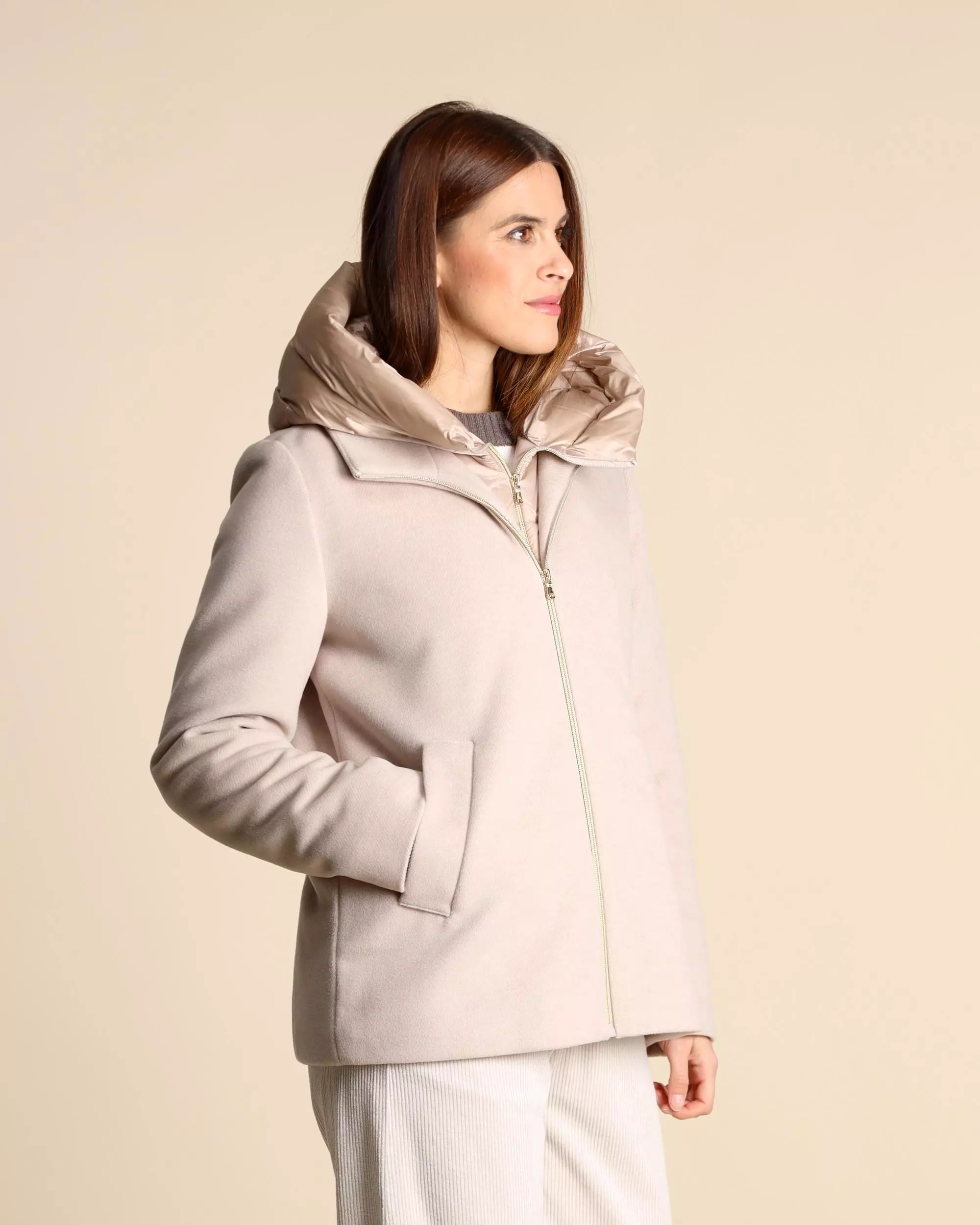 Giaccone corto "Sorriso" color cachà in panno soft imbottito, dal fit dritto e compatto. Collo con cappuccio e pettorina staccabili in tessuto luxury antigoccia, chiusura con zip a tutta lunghezza e tasche laterali a filetto. Etichetta interna personalizzata HUG ME.