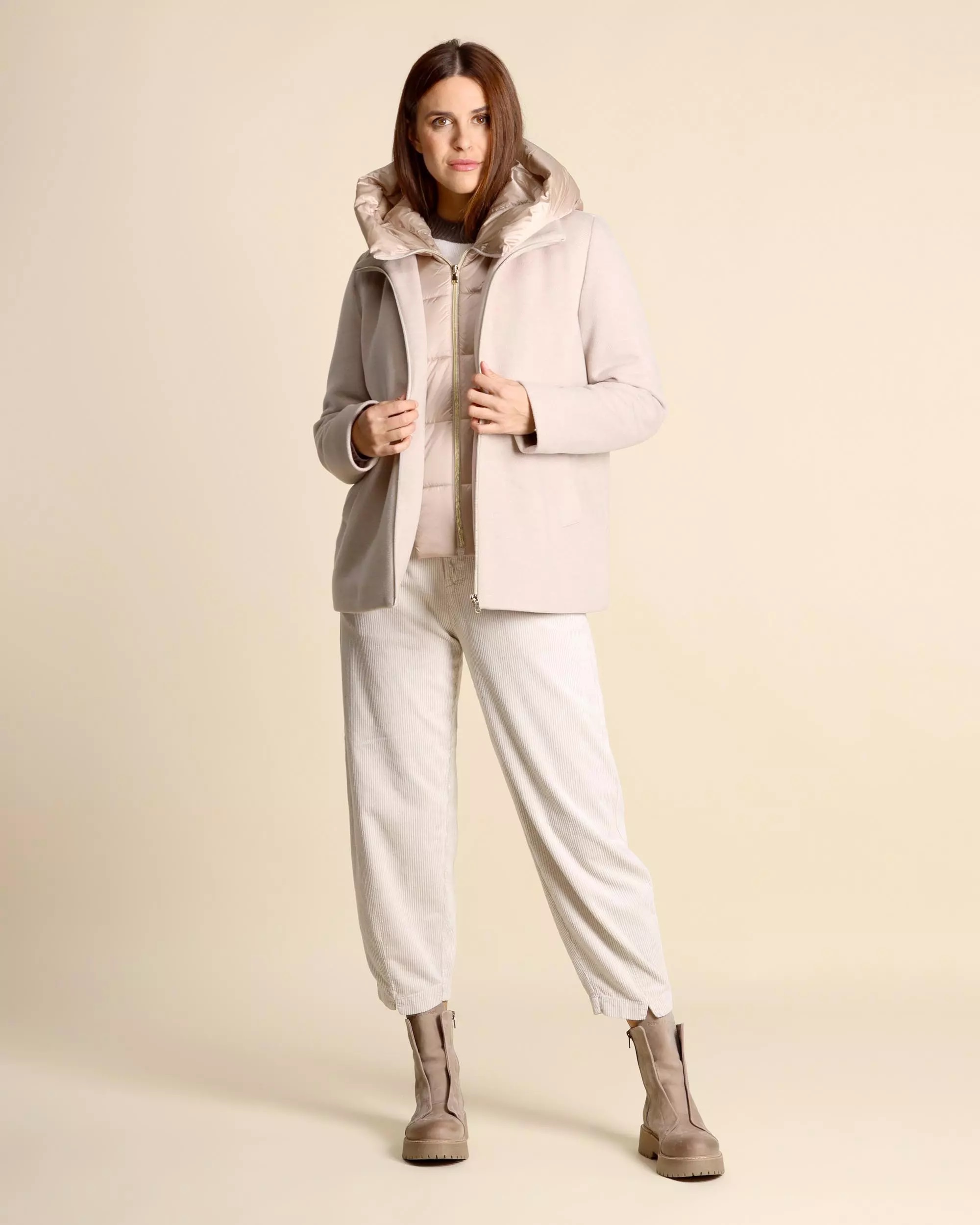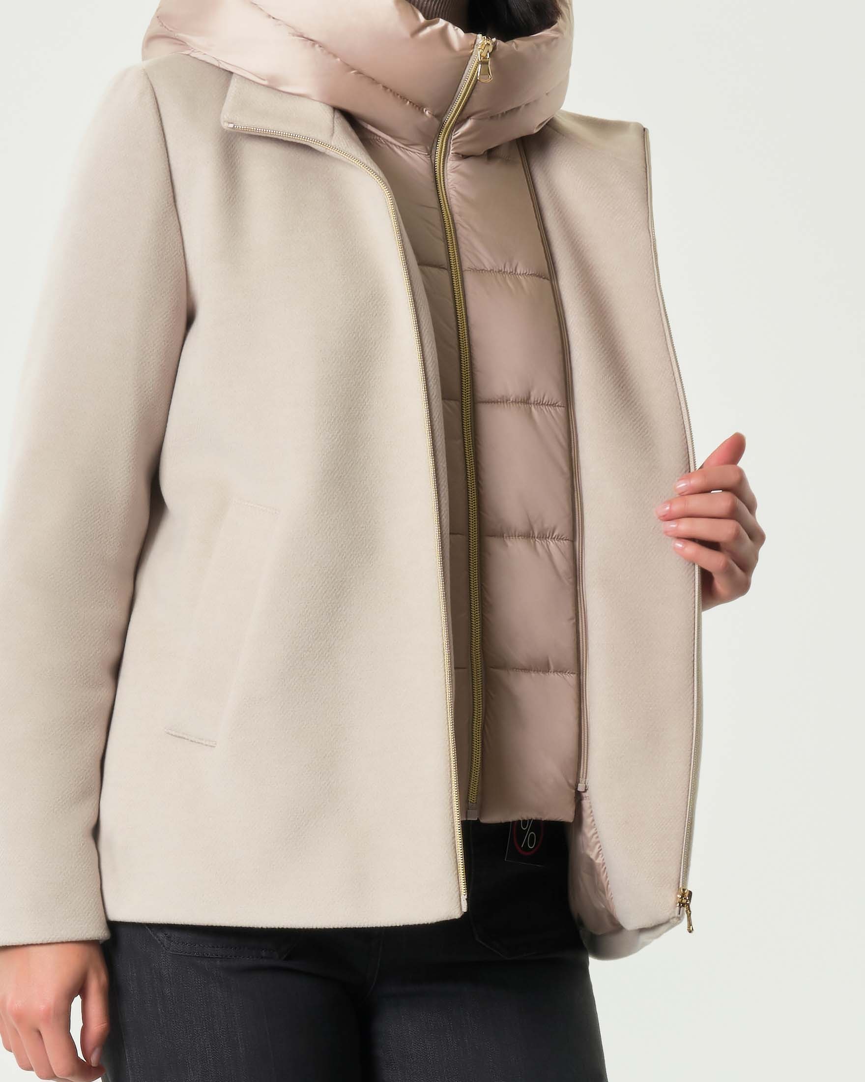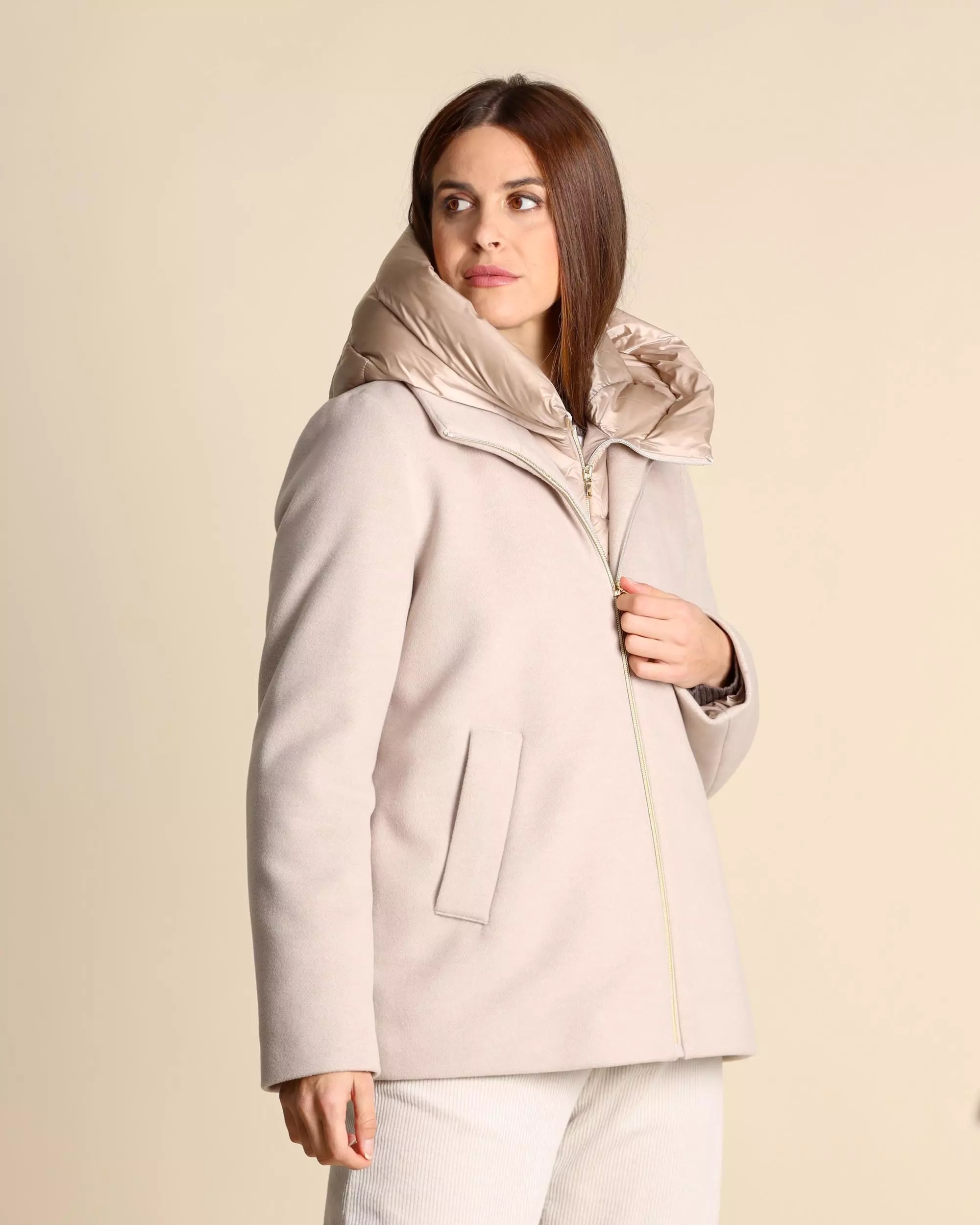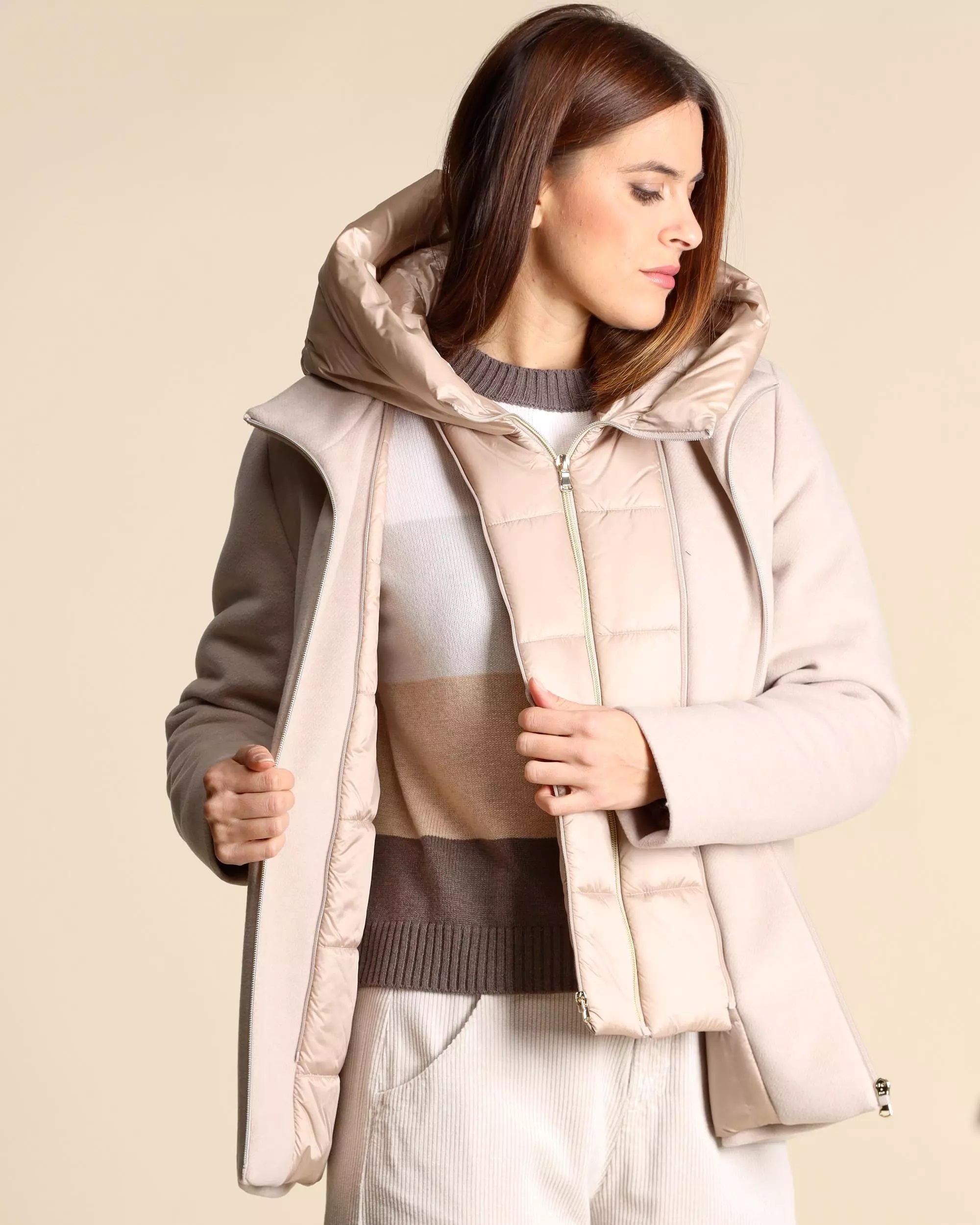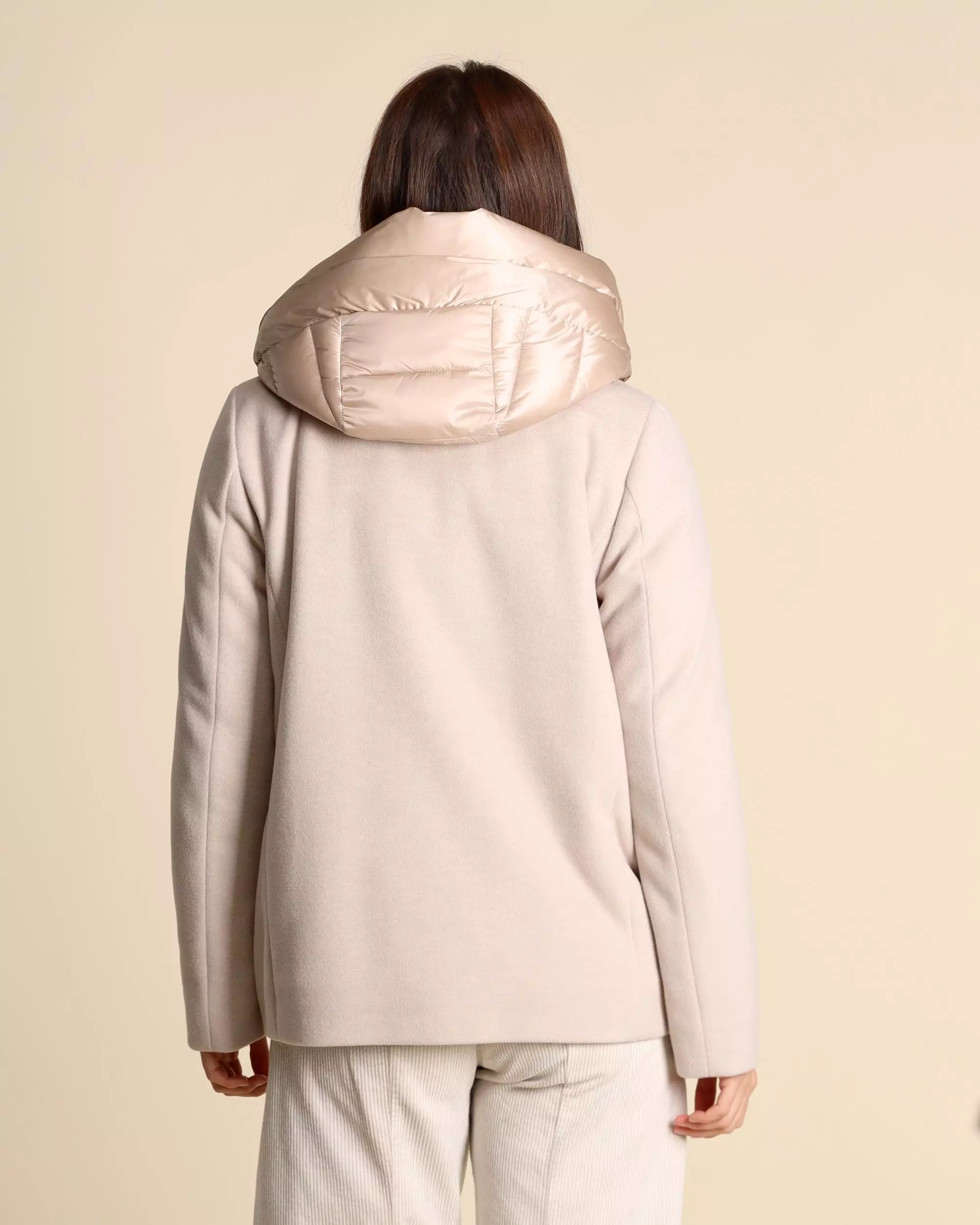Giaccone corto "Sorriso" color cachà in panno soft imbottito, dal fit dritto e compatto. Collo con cappuccio e pettorina staccabili in tessuto luxury antigoccia, chiusura con zip a tutta lunghezza e tasche laterali a filetto. Etichetta interna personalizzata HUG ME.