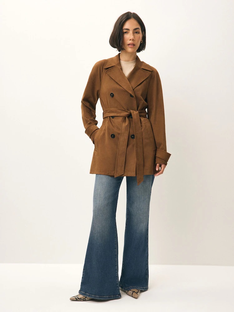 Giubbino "Team" color cioccolato in jersey liscio e morbido, con taglio doppiopetto e fit dritto. Collo con rever, maniche lunghe raglan con alamari ai polsi e tasche laterali a filetto. Cintura coordinata in vita per definire la silhouette. Perfetto per la stagione di transizione.