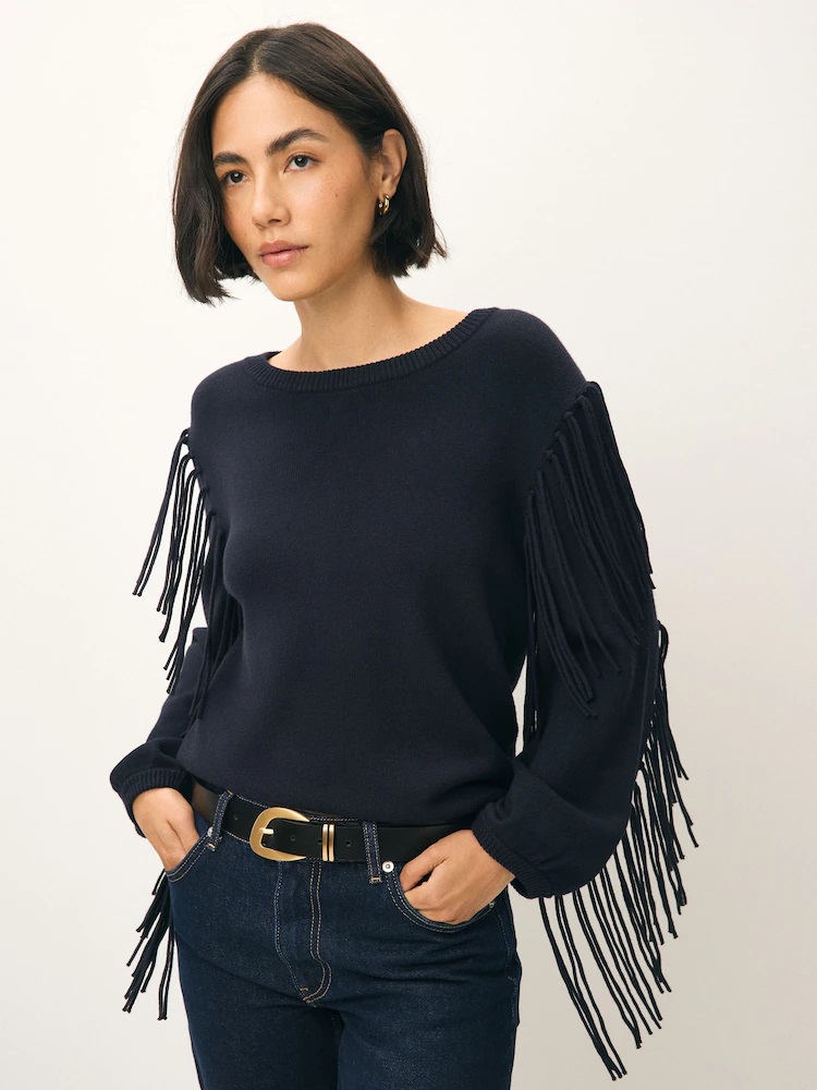 Maglia "Falco" in filato di misto viscosa stretch blu derivato da fibre di cellulosa ottenute nel rispetto del patrimonio forestale. Fit oversize con lunghezza in vita, scollo a barchetta e maniche a tre quarti. Motivo di frange lungo la manica e sulla spalla per un tocco trendy e contemporaneo. Perfetta con denim o gonne longuette per look urbani di stagione.