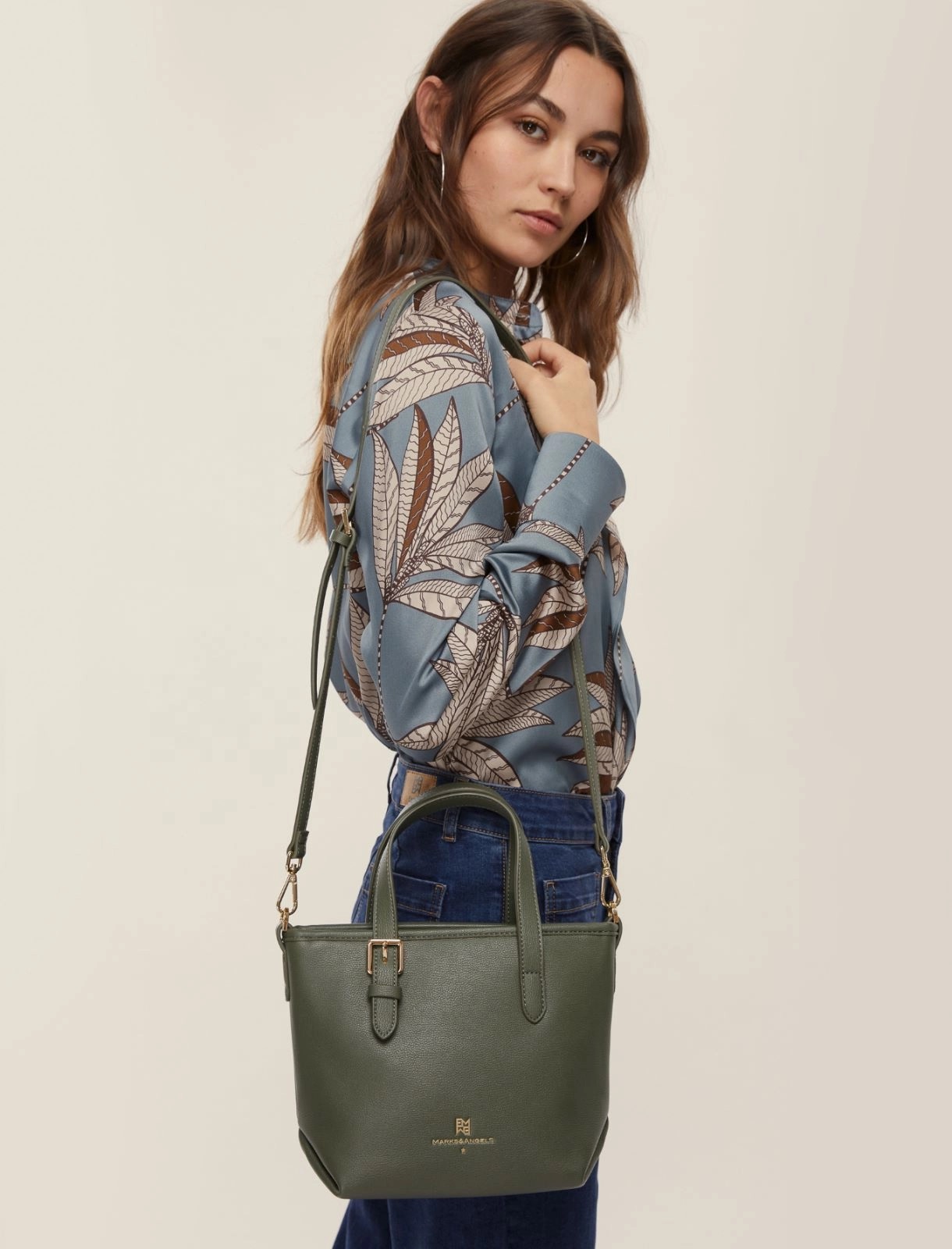 Mini shopper "Miniemma" verde militare in ecopelle martellata, realizzata in collaborazione con Marks&Angels di Alessia Marcuzzi. Modello foderato con linee essenziali, manici regolabili con fibbie galvanica oro e tracolla regolabile e amovibile per indosso crossbody o a mano. Chiusura con zip a catena galvanica oro, logo EMME MARELLA e Marks&Angels in stampa dorata. Interno foderato con taschina portatessere e logo stampato. Dimensioni: L27 x H19 x P10 cm. Borsa venduta con sacchetto di protezione.