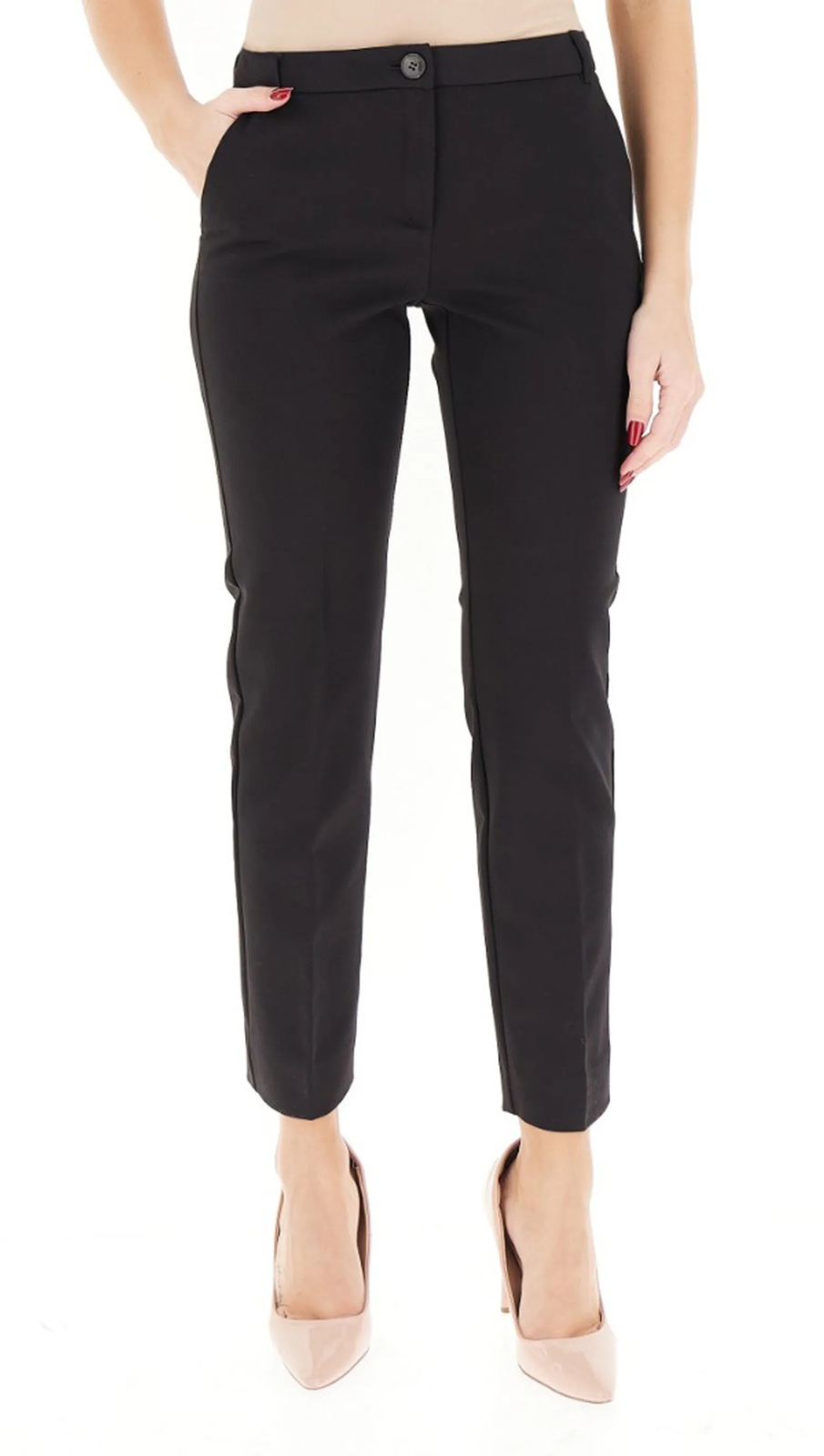 Pantalone in doppio cotone stretch a chino con bottone e zip nascosta. Tasche laterali alla francese, pince posteriori, piega stirata fronte e retro. Fit aderente.