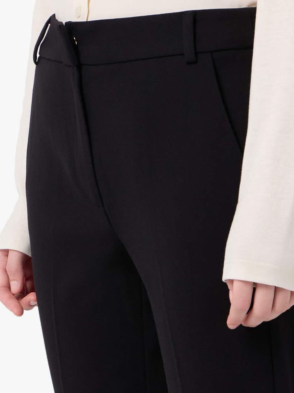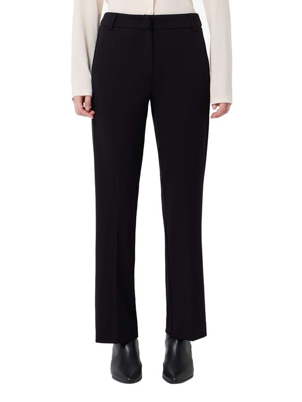 Pantalone "Flare" in jersey stretch di misto viscosa nero lavorato a punto Milano. Fit dritto con chiusura a gancio a uomo e zip nascosta, cintura con passanti e tasche laterali alla francese. Piega stirata fronte e retro che allunga la silhouette per un capo confortevole e versatile, perfetto da abbinare a bluse o maglie per look sempre curati.