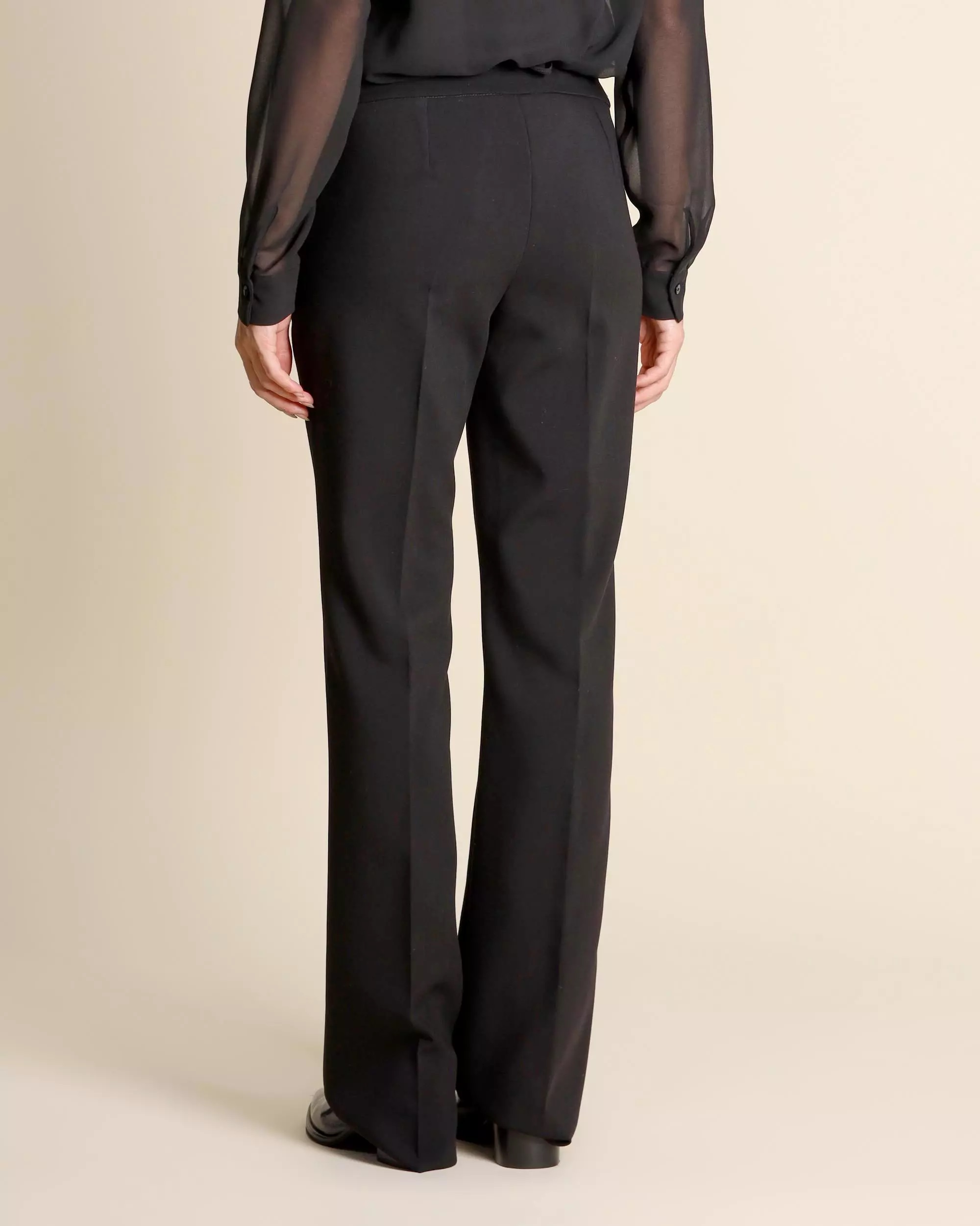 Pantalone "Franca" nero in tessuto doppio stretch, caratterizzato da un fit aderente che si apre delicatamente in un flare misurato. Modello con chiusura a gancio nascosto, tasche laterali alla francese e piega stirata fronte e retro. Un capo versatile e raffinato, ideale per completare look da ufficio o outfit eleganti con camicie in seta, cappotti o maglie boxy.