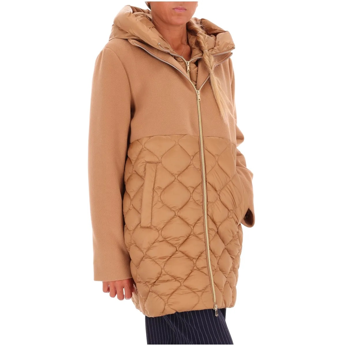 Piumino imbottito corto "Amore" color cammello con cappuccio e chiusura a zip. Modello con pannelli trapuntati a rombi nella parte inferiore e interno imbottito per calore e comfort. La modella è alta 170cm e indossa una taglia 42.