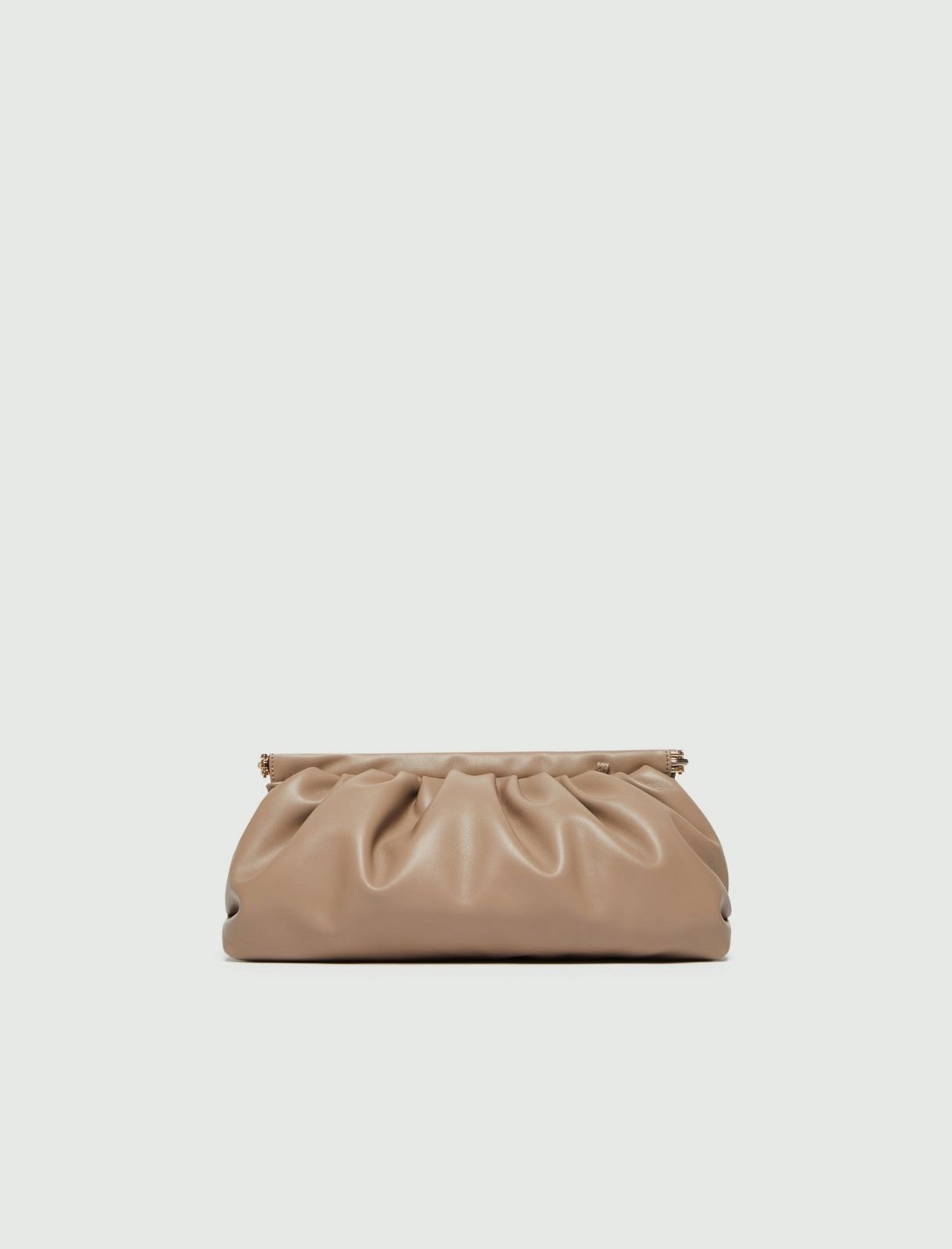 Pouch "Gloria" beige dal design morbido e sofisticato, realizzata in jersey spalmato con finish lucido. Modello con chiusura a scatto in metallo, interno foderato in tessuto e tasca interna zippata. Dotata di tracollina in catena metallica dorata rimovibile che aggiunge un dettaglio brillante. Dimensioni 35 x 11 x 17 cm, ideale da portare a mano o a spalla per look urbani ed eleganti.
