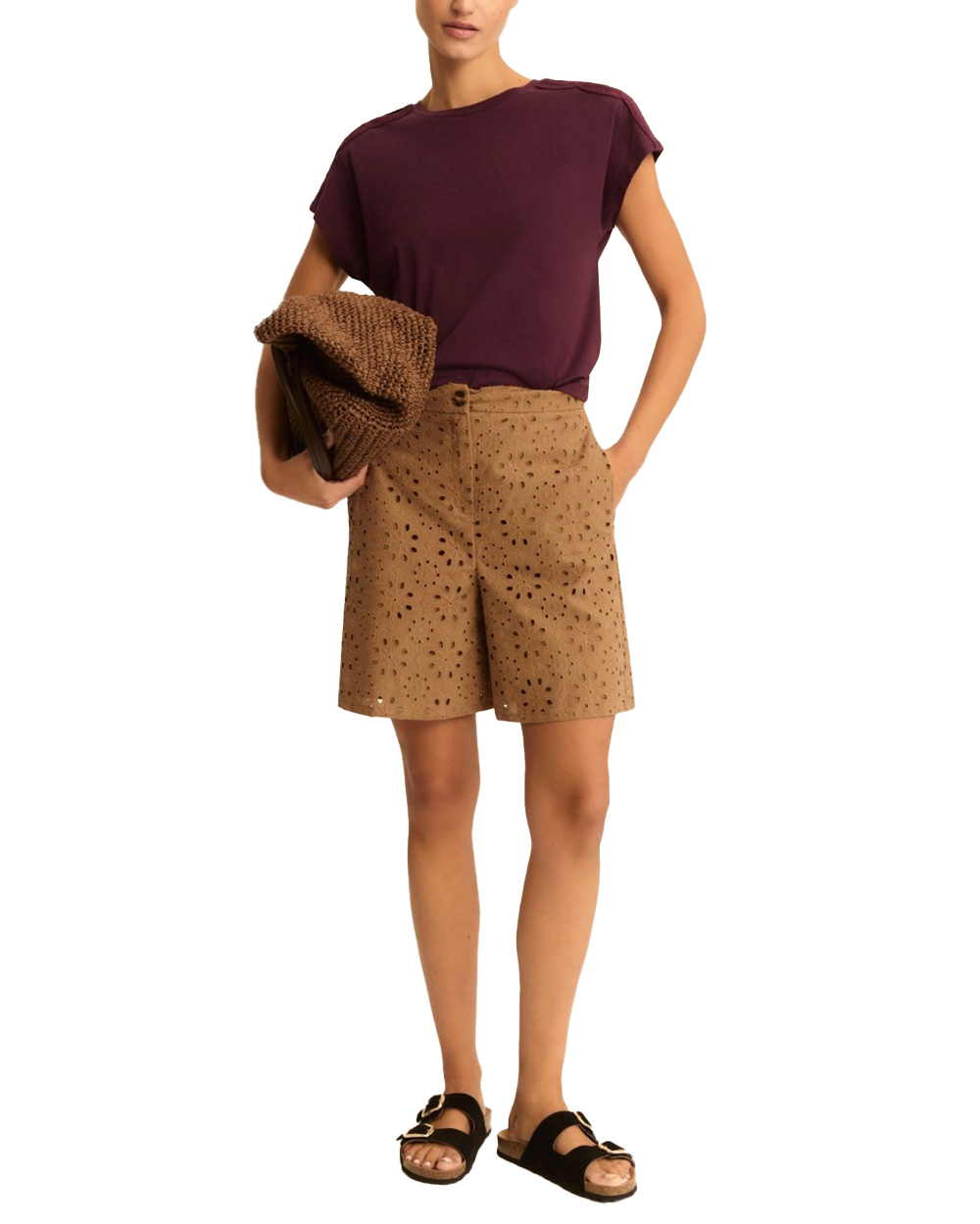 Dettagli di passamaneria traforata sulla spalla.