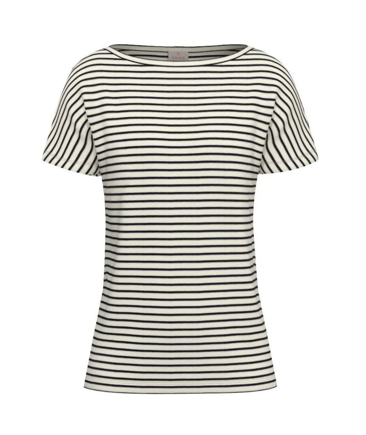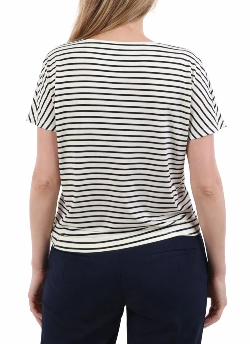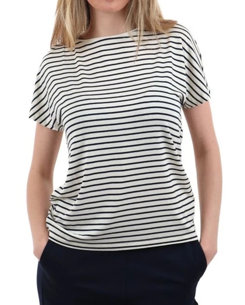 T-shirt in jersey interlock stretch a righe, scollo a barchetta dal taglio femminile, maniche con taglio a kimono. Vestibilità regolare. Tessuto principale realizzato con fibre derivate dalla cellulosa del legno, ottenute nel rispetto delle risorse forestali.
