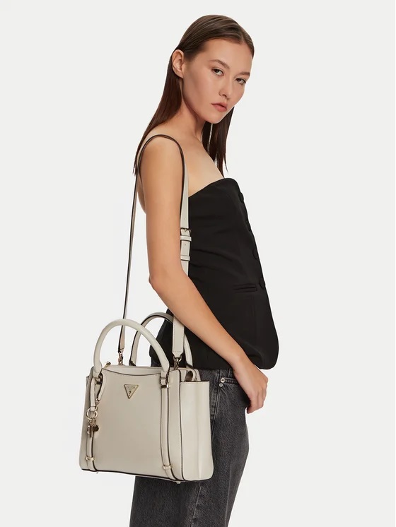 Borsa Guess "Daryna" in ecopelle liscia beige con doppio scomparto interno chiuso da zip e tre tasche esterne. Dotata di tracolla sganciabile e regolabile, tre tasche interne di cui una con chiusura a zip. Completa di charms sganciabile utilizzabile come portachiavi.