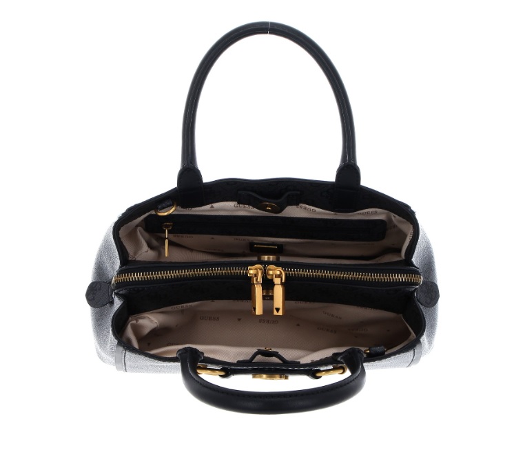 Borsa Guess realizzata in similpelle blu navy con stampa all-over 4G. Dotata di doppi manici, chiusura superiore con zip e dettagli in metallo dorato. Logo “G” decorativo centrale con cinturino frontale. Design strutturato per un’eleganza quotidiana.