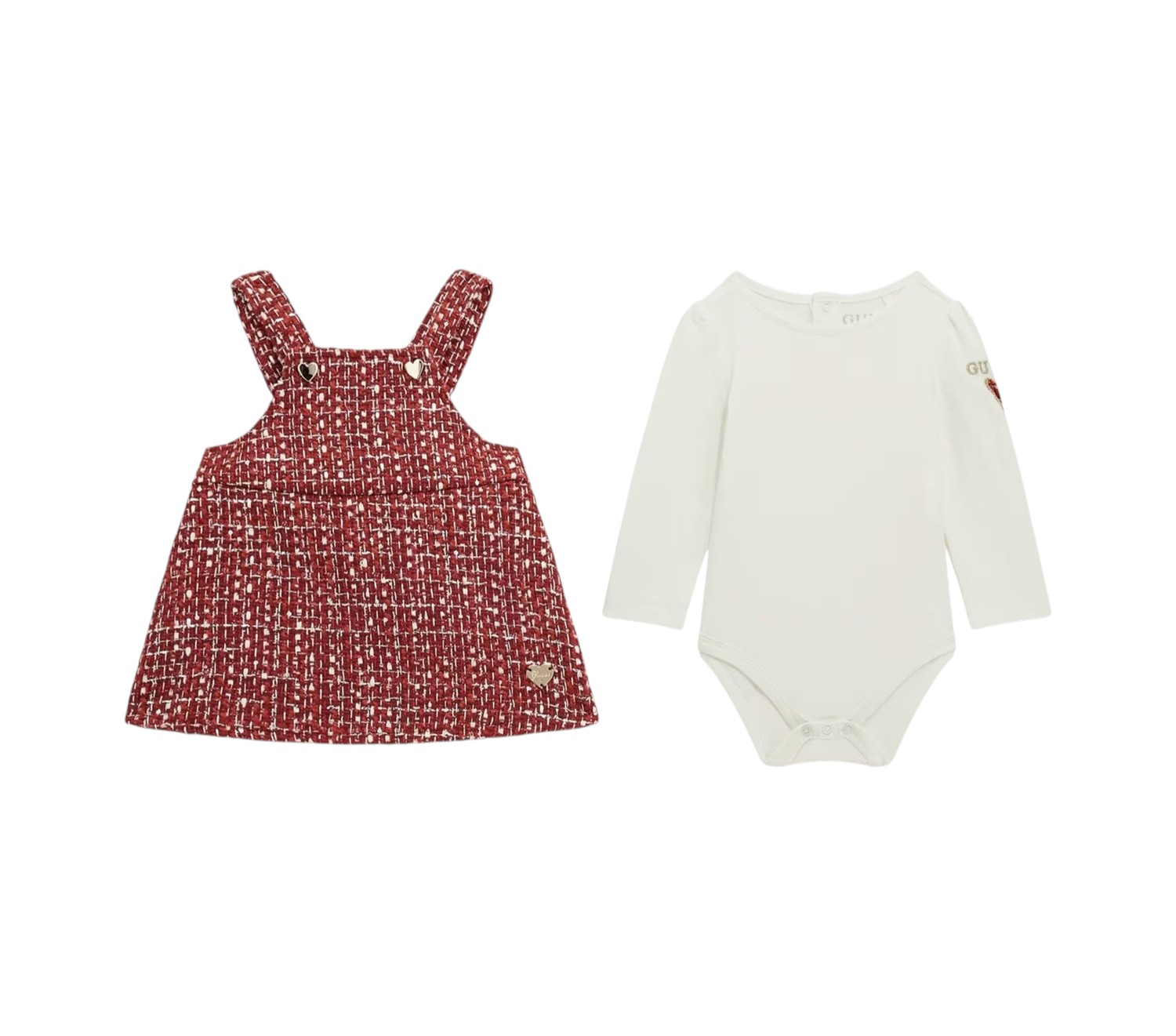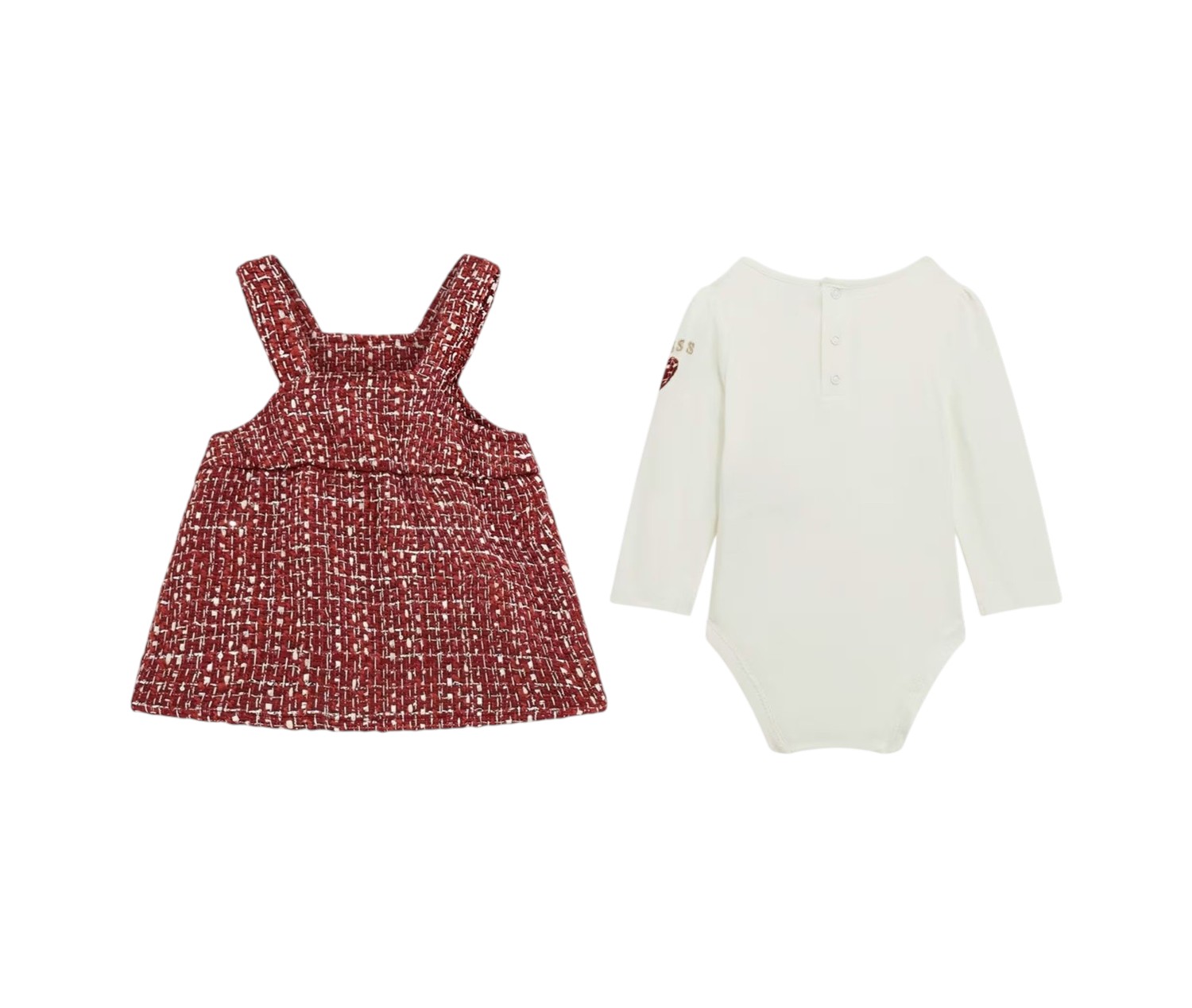 Set salopette bambina gonna in tweed e body. Salopette gonna chiusura con bottoni. Body girocollo, maniche lunghe e chiusura con bottoni. Ricamo logo e cuore.