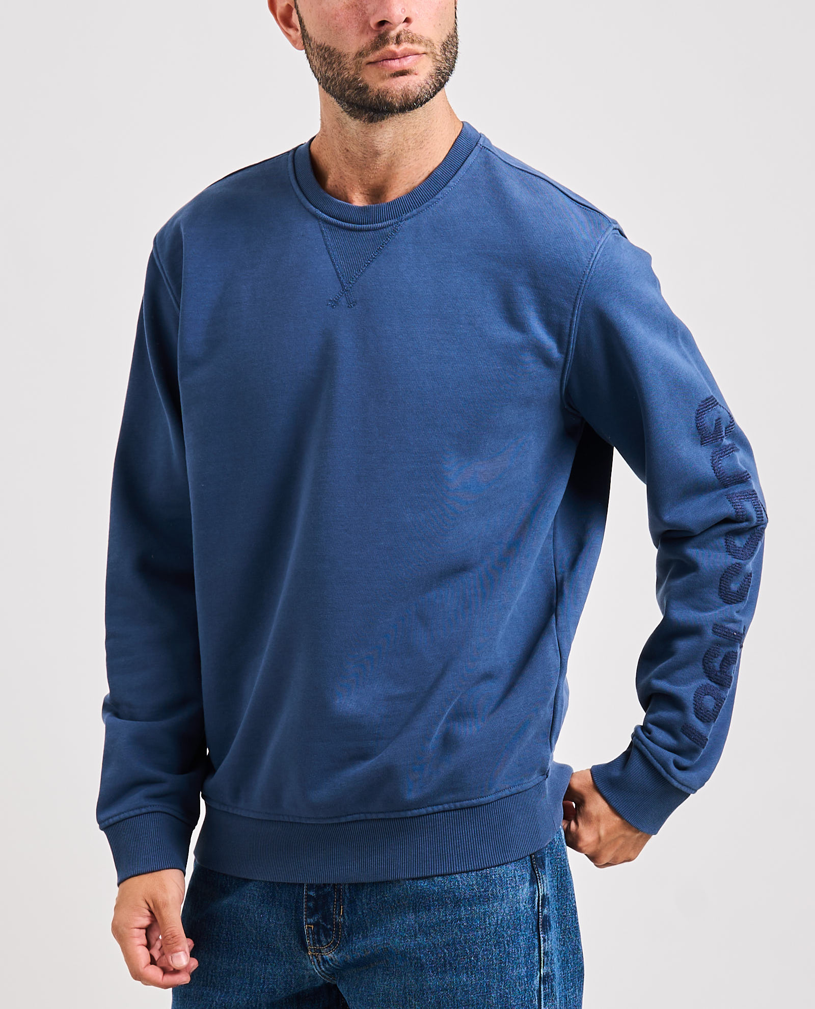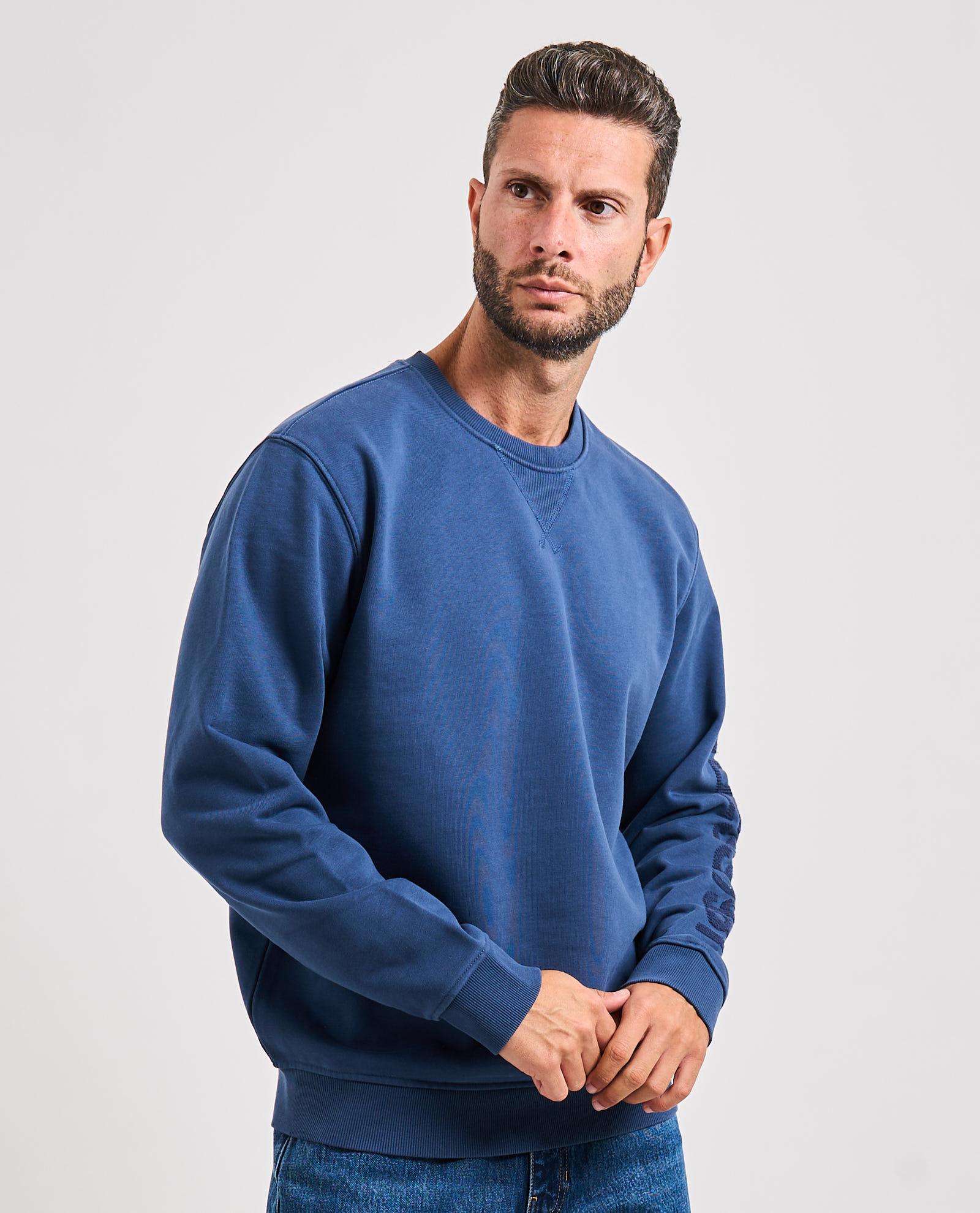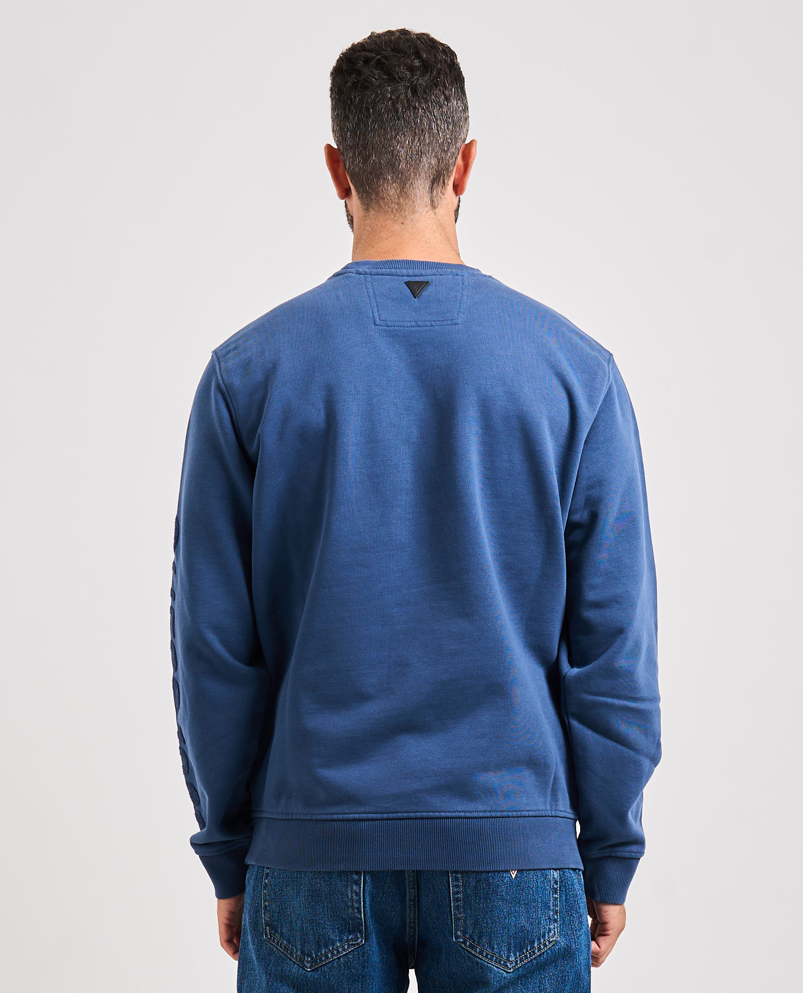 Felpa da uomo blu modello "Embro on Sleeve CN Sweatshirt" con girocollo e vestibilità regolare. Realizzata in morbido tessuto misto cotone e poliestere, presenta il logo Guess ricamato in verticale sulla manica per un dettaglio distintivo. Bordi a costine su collo, polsini e fondo per una vestibilità confortevole.