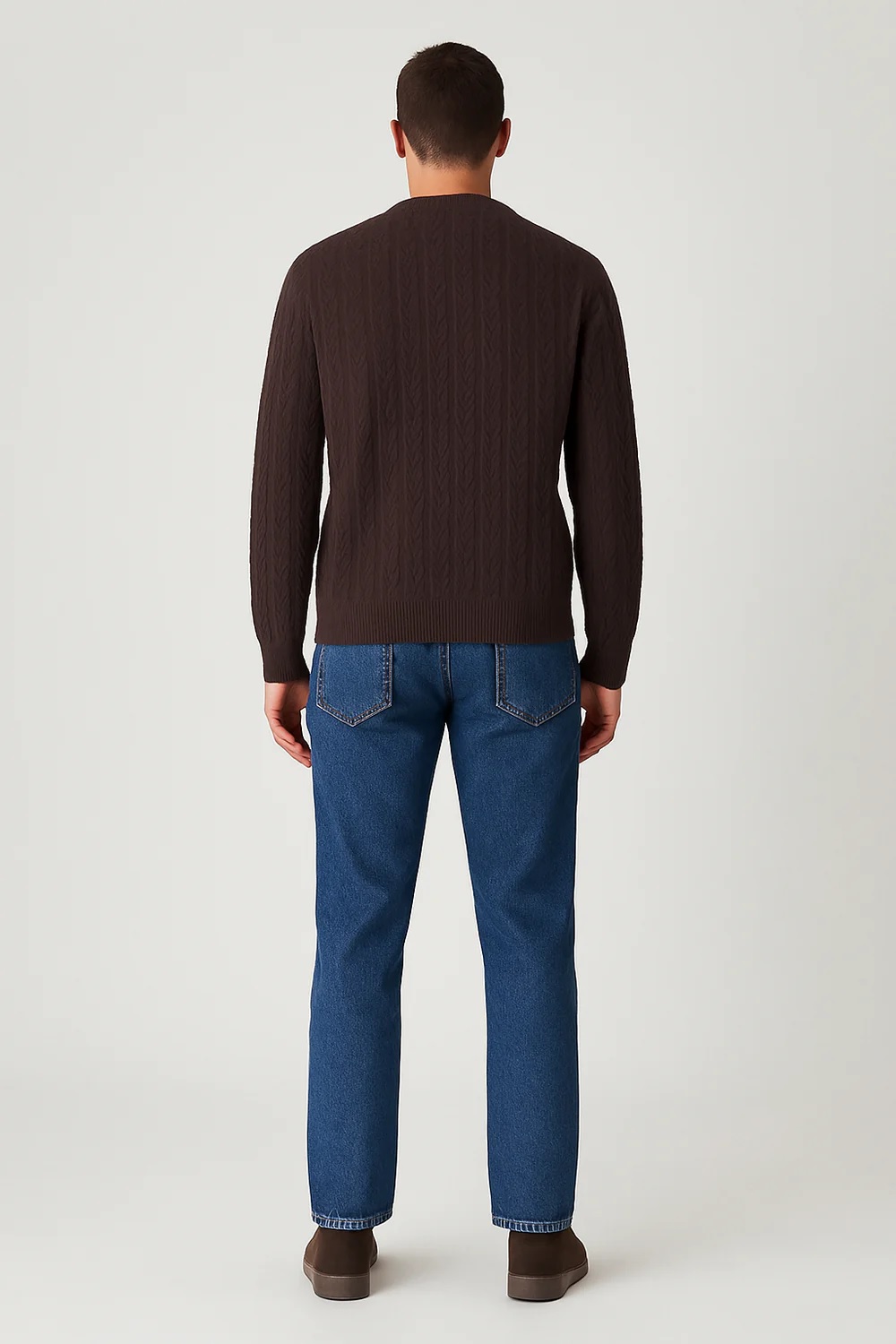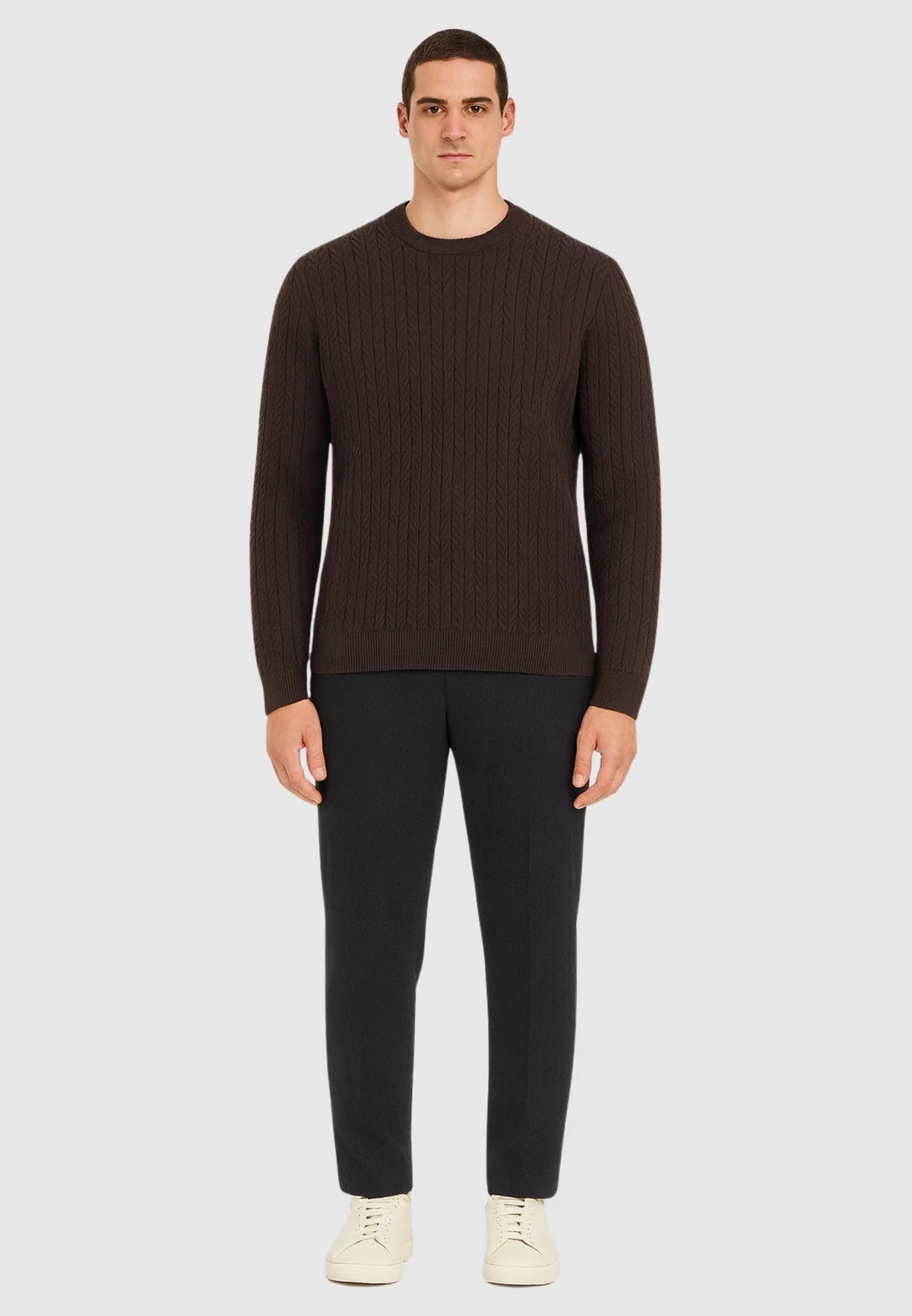 Maglione marrone da uomo con scollo girocollo e lavorazione a chevron su tutta la superficie. Linea pulita e design essenziale, perfetto per outfit casual e formali. Orli e polsini a costine per una vestibilità comoda e aderente.
