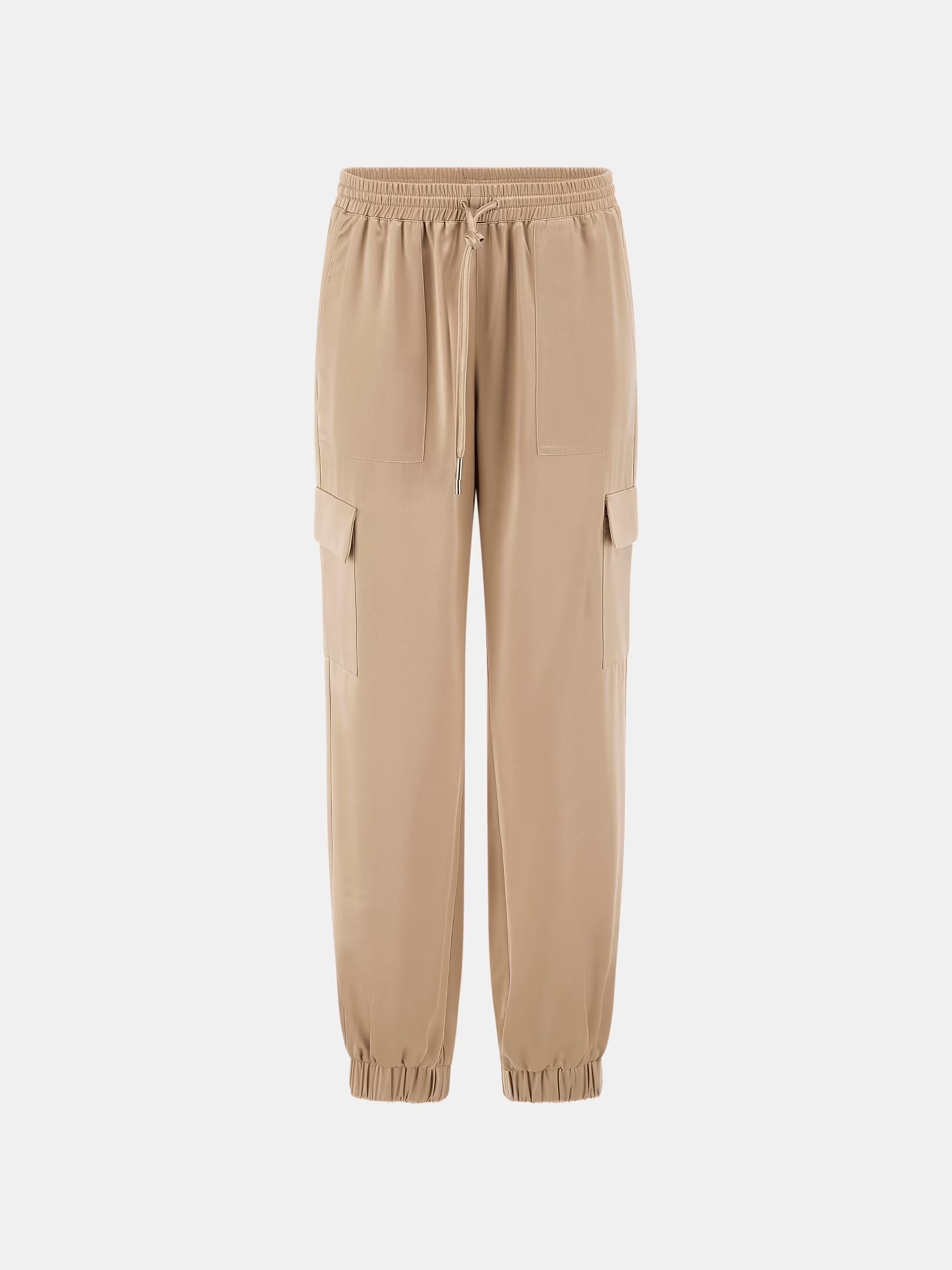Jogger cargo beige da donna in tessuto morbido con vestibilità slim che valorizza la silhouette. Vita elasticizzata con chiusura a coulisse regolabile, polsi con elastico alla caviglia e tasche cargo laterali con patta.